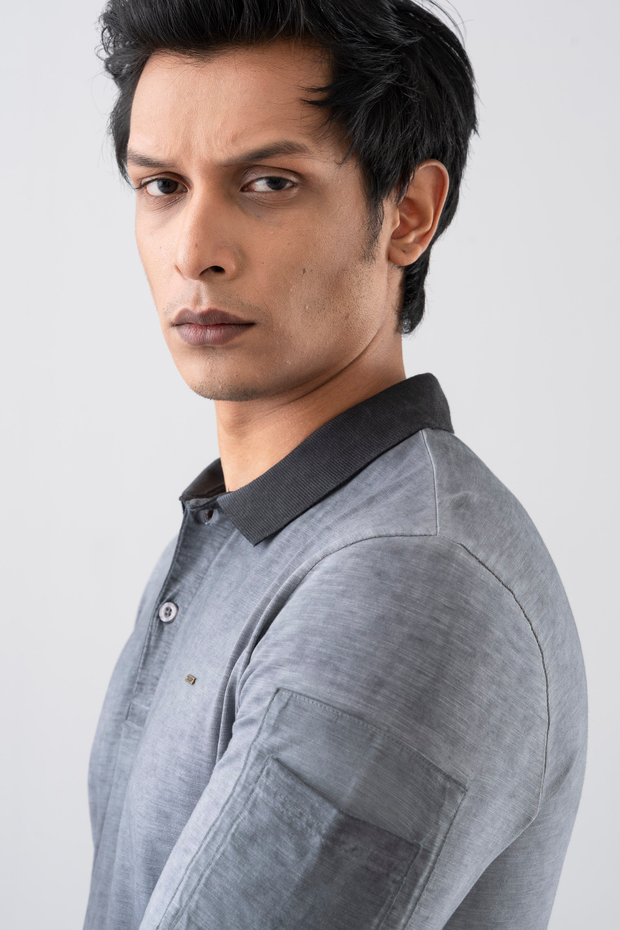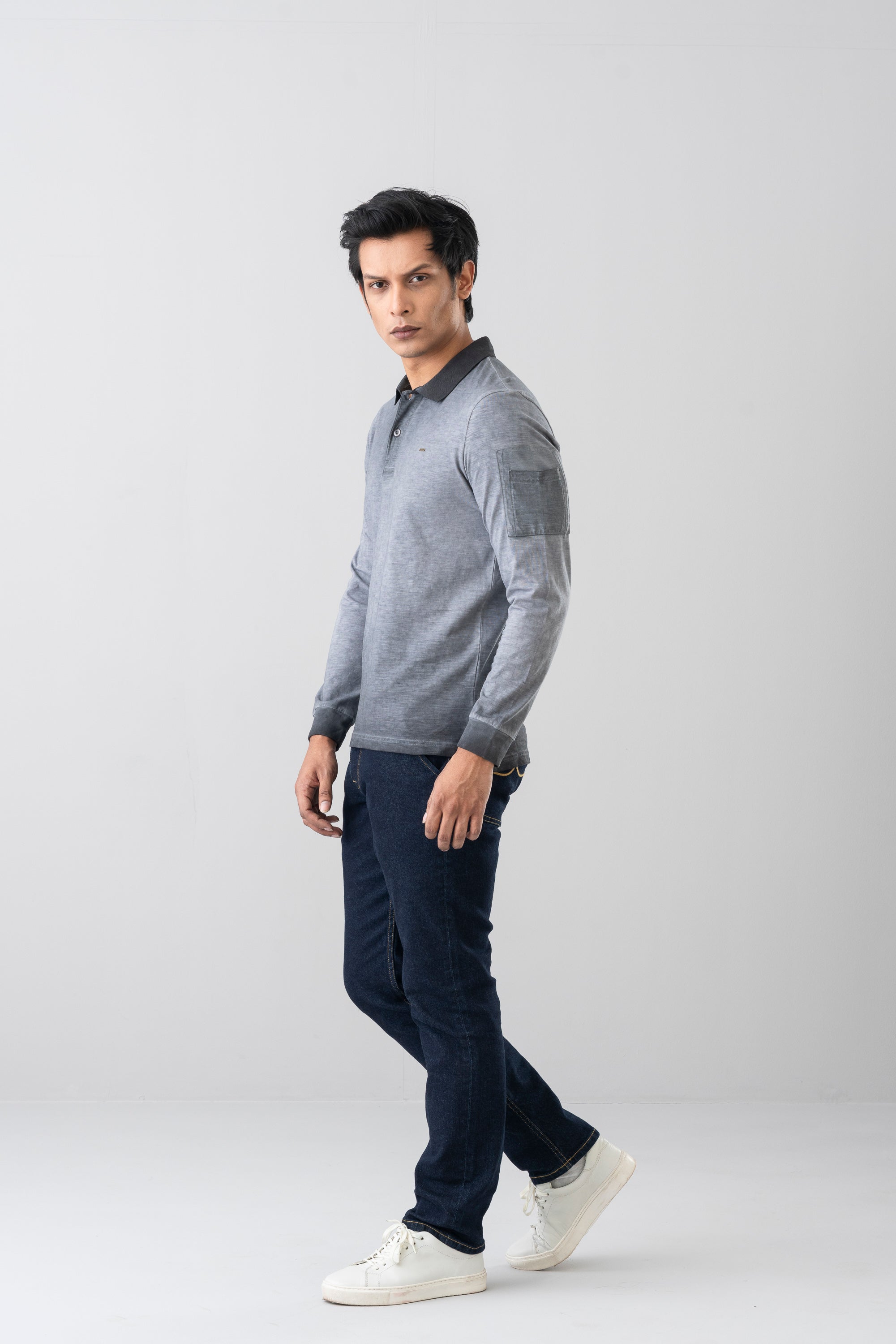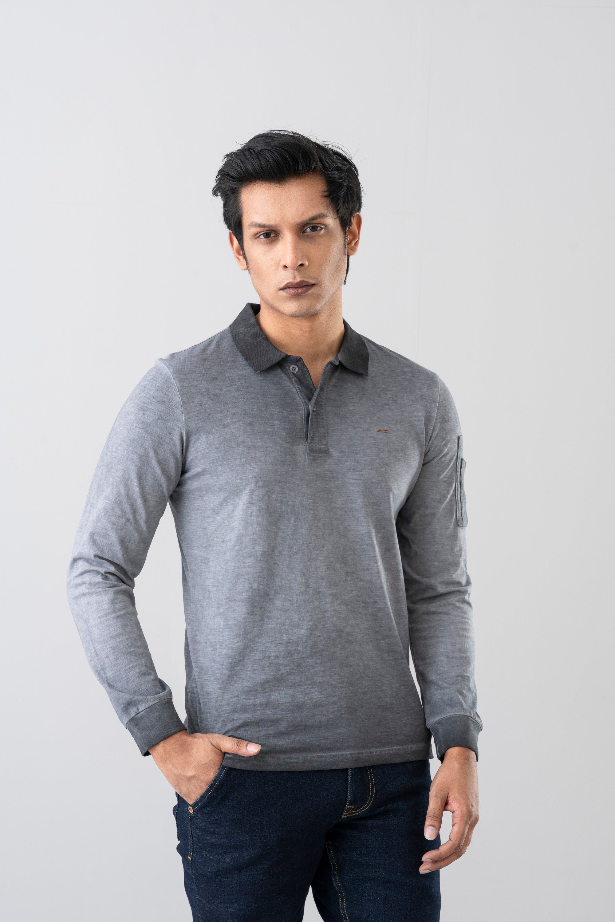 A stylish regular fit polo shirt crafted from soft cotton yarn with an irregular slub texture for a unique look. Designed with a ribbed collar, cuffs, and trims, it features long sleeves for versatile wear. The two-button placket and subtle YELLOW metal logo bar on the chest add refined detailing, while the inside cold dye finish enhances its modern appeal.