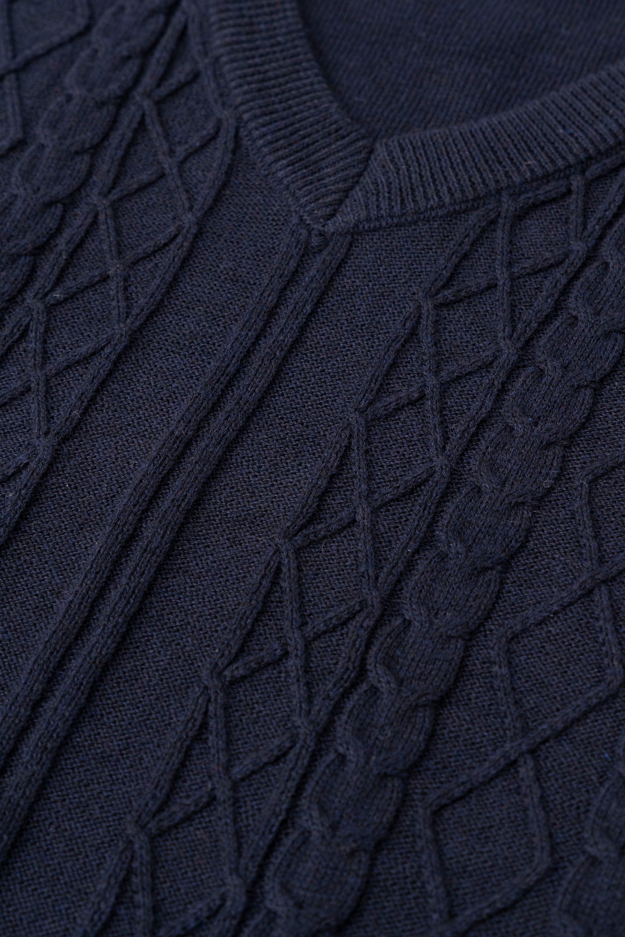Lightweight yet cozy, this vest is perfect for layering over shirts or under jackets, offering both comfort and versatility. The ribbed neckline, armholes, and hem provide a structured finish, while the elegant knit pattern delivers a polished, heritage-inspired look that never goes out of style.