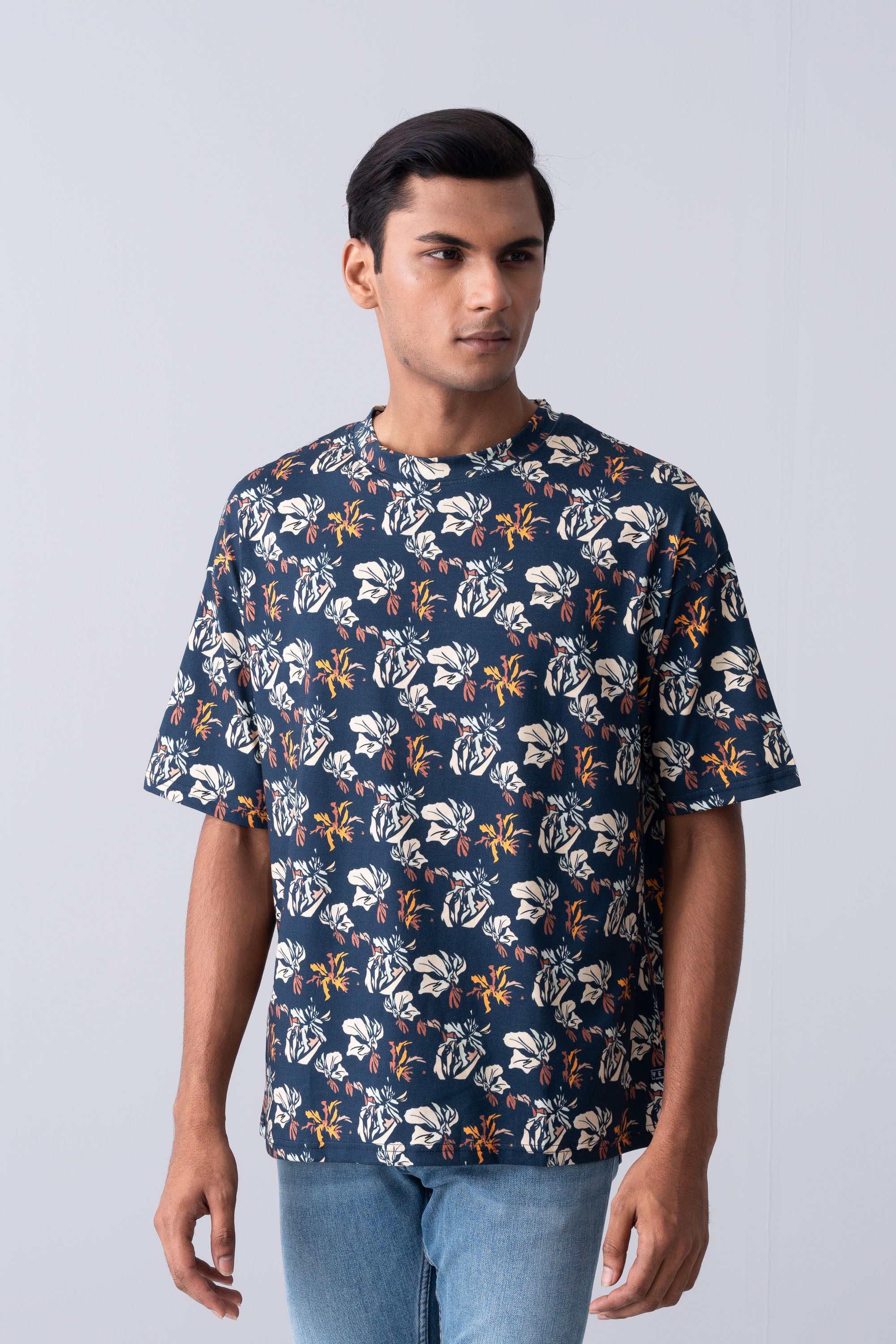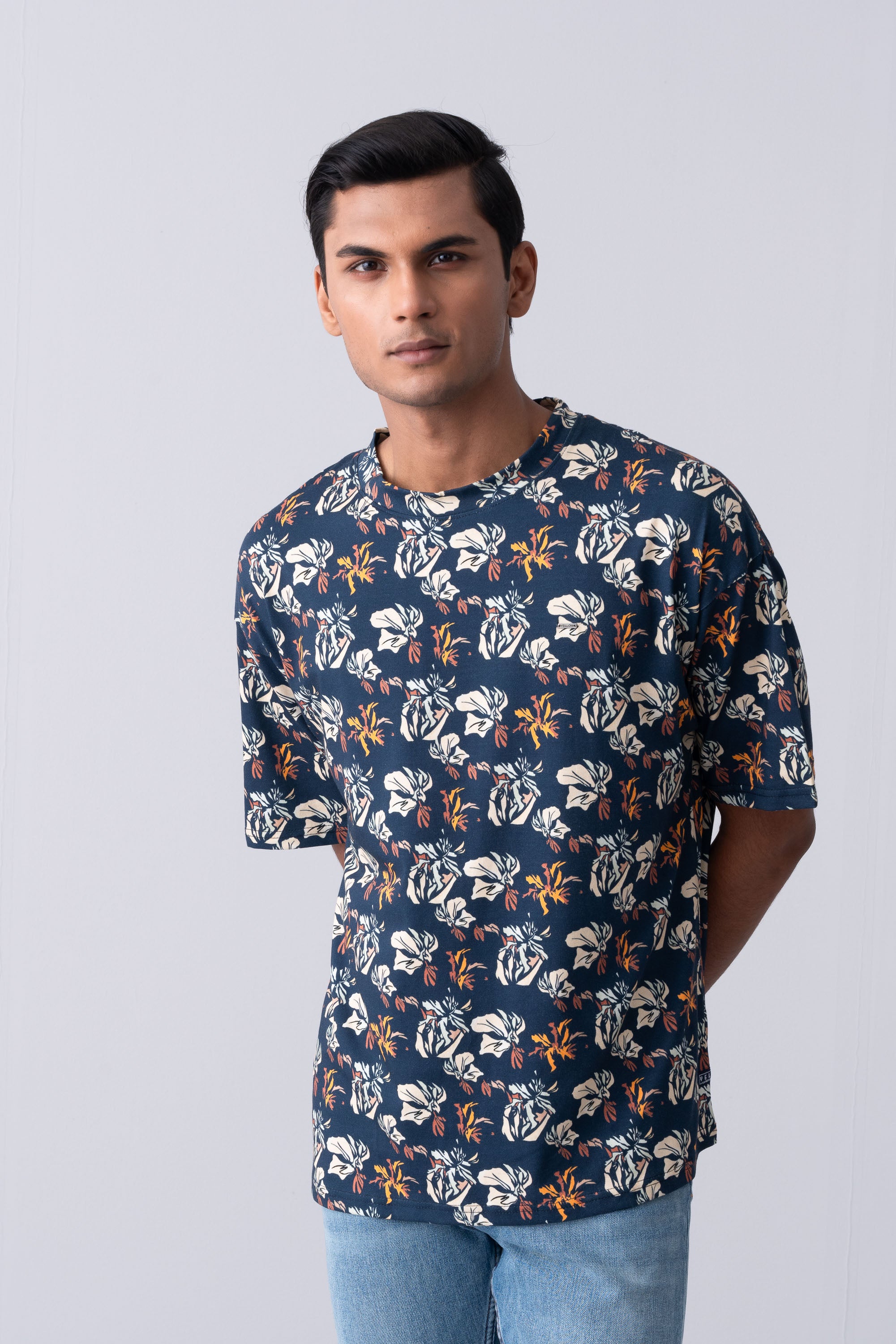 A touch of nature of this stylish Wild Flower Digital Print Men's T-shirt which includes a crew neck, and short sleeves. Crafted from soft, breathable cotton, this t-shirt offers ultimate comfort and oversized fit. The standout feature is the vibrant, high-definition digital print of wild flowers, bursting with color and sophisticated details that evoke the beauty of nature in full bloom. Brand label and bartack added at the bottom for more detailing.
