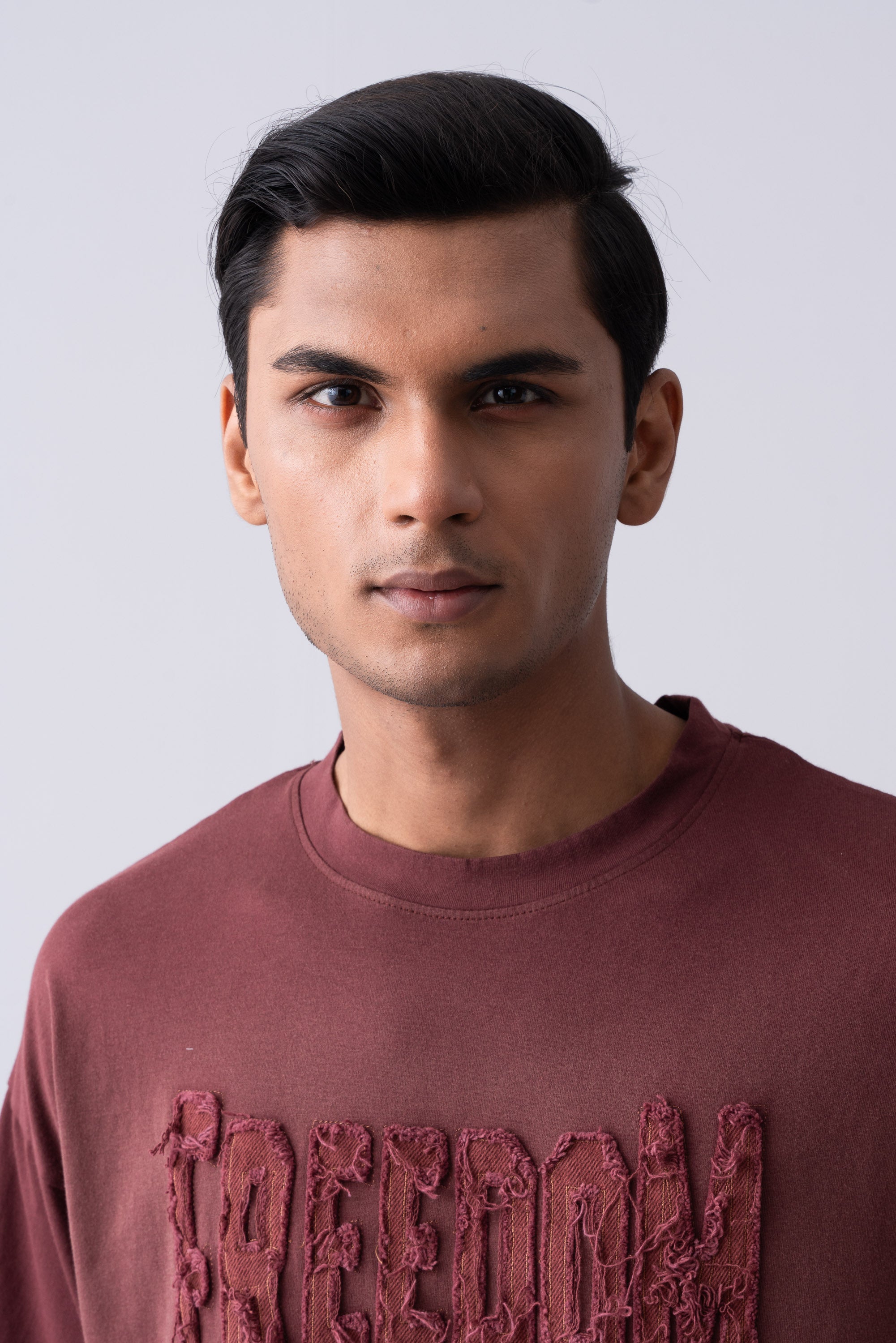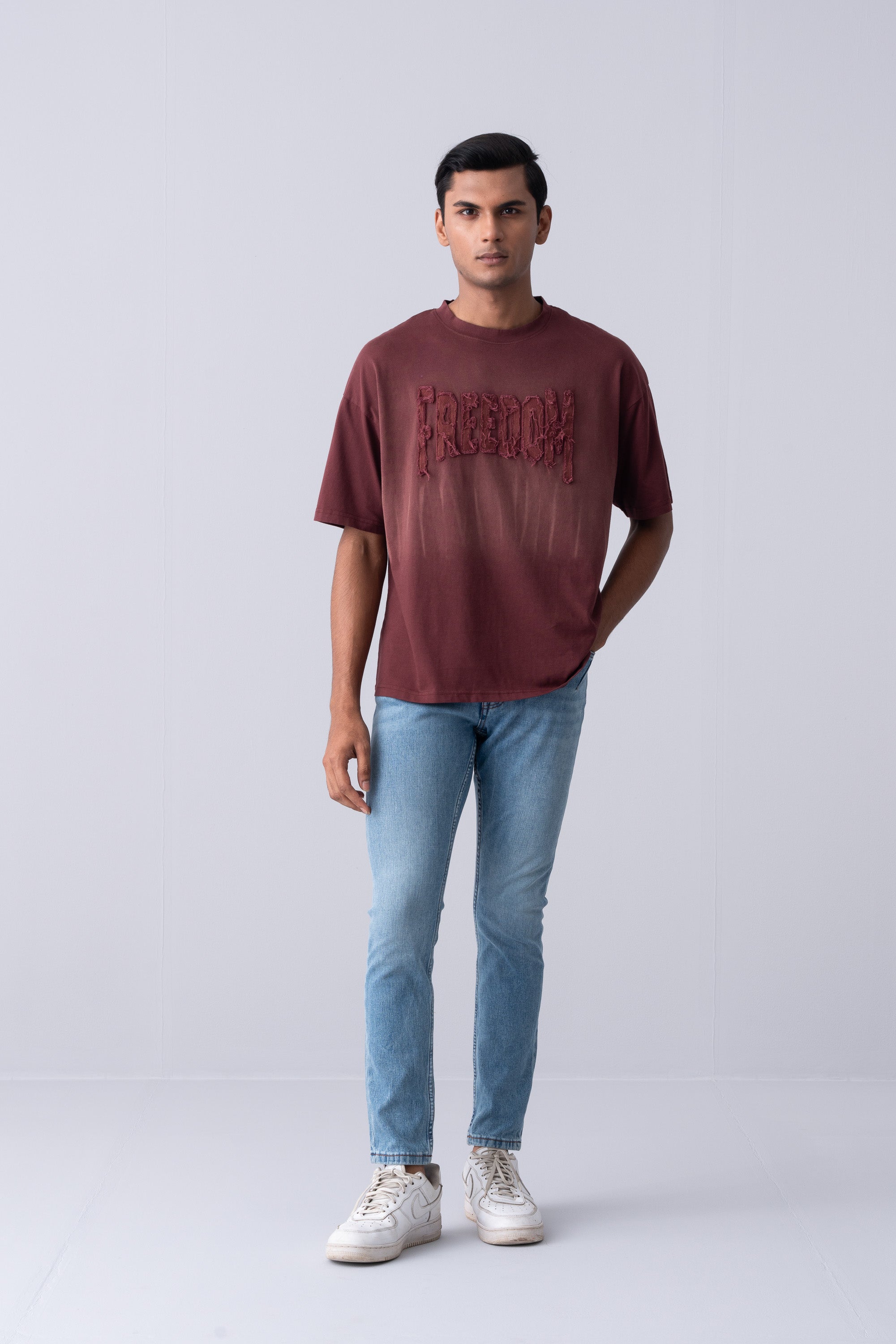 Get yourself our new casual, oversized fit, short sleeves T-shirt with crew neck. Vintage wash at chest portion with typography applique work. Raw edges of this applique work creates a Gen-Z theme look. Brand label and bartack added at the bottom for more detailing.