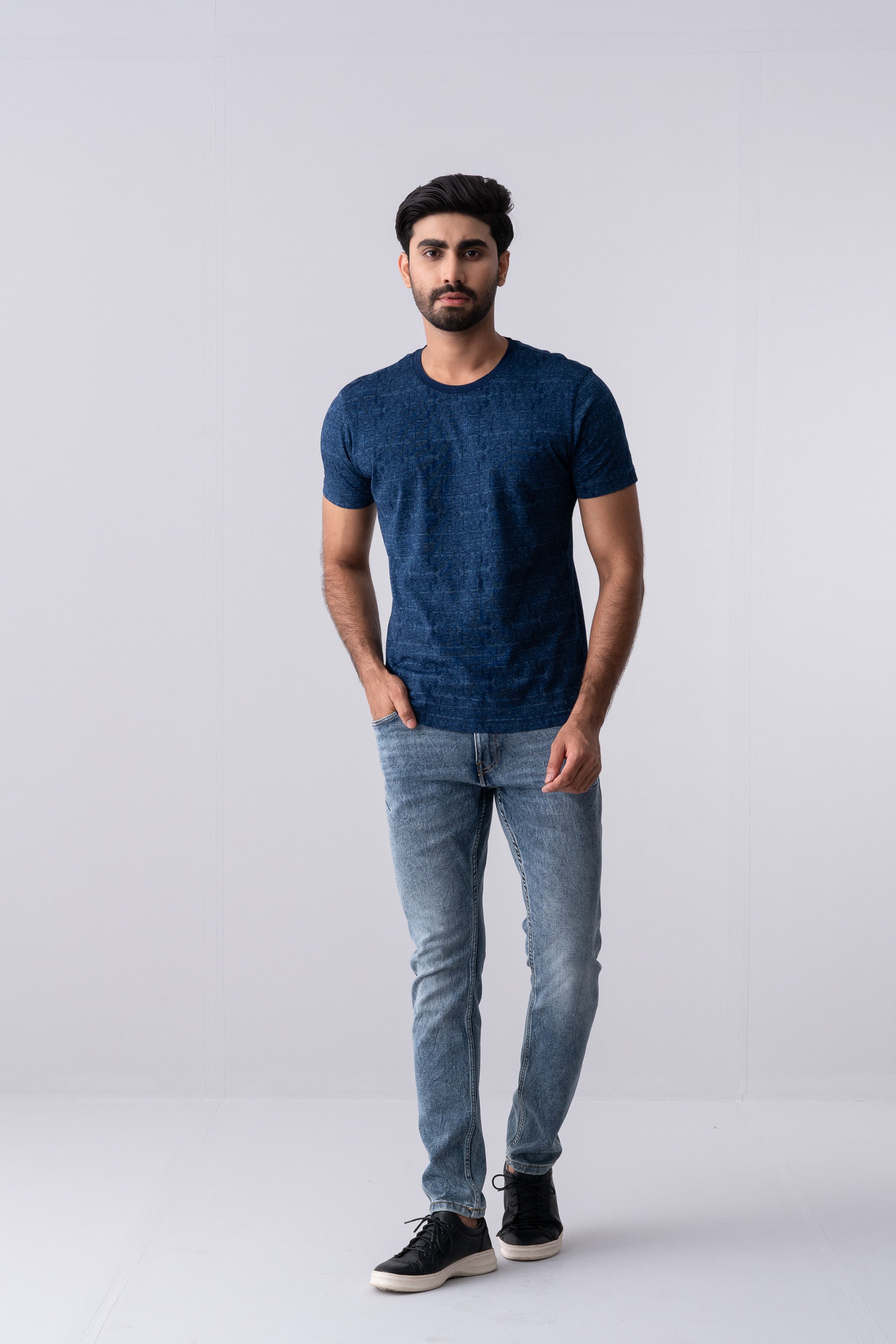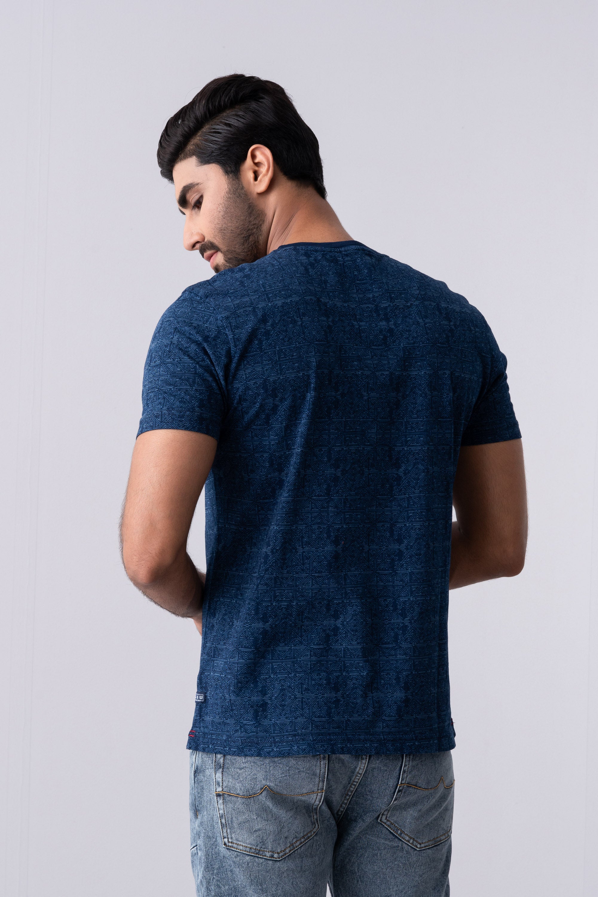 Indigo Laser Motif Print brings a bold, innovative twist to casual fashion. This regular fit crew neck, short sleeves t-shirt showcases intricate, geometric patterns that capture a modern, high-tech vibe. Perfect for those who love to stand out with an edgy, contemporary style. Brand label and bartack added at the bottom for more detailing.