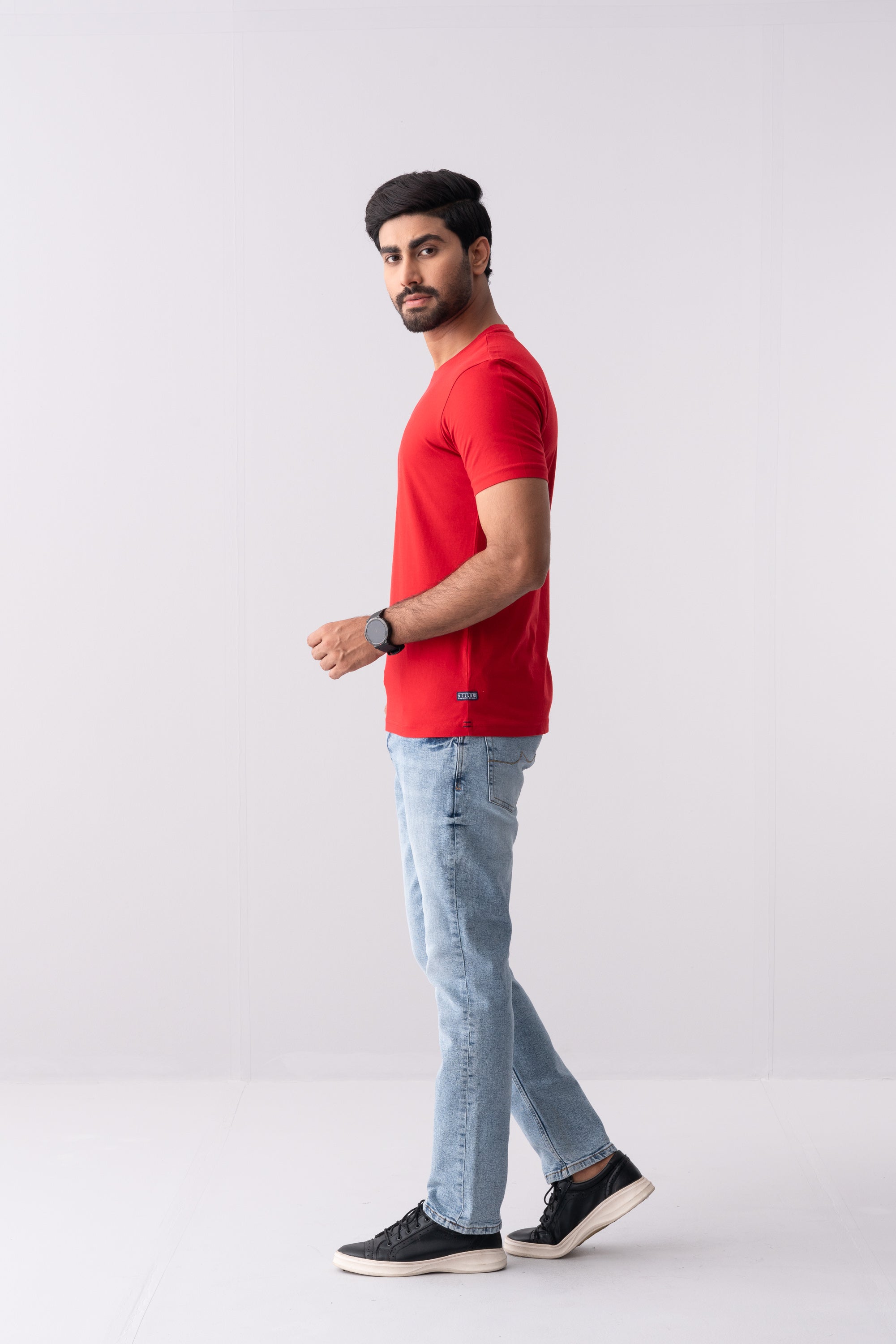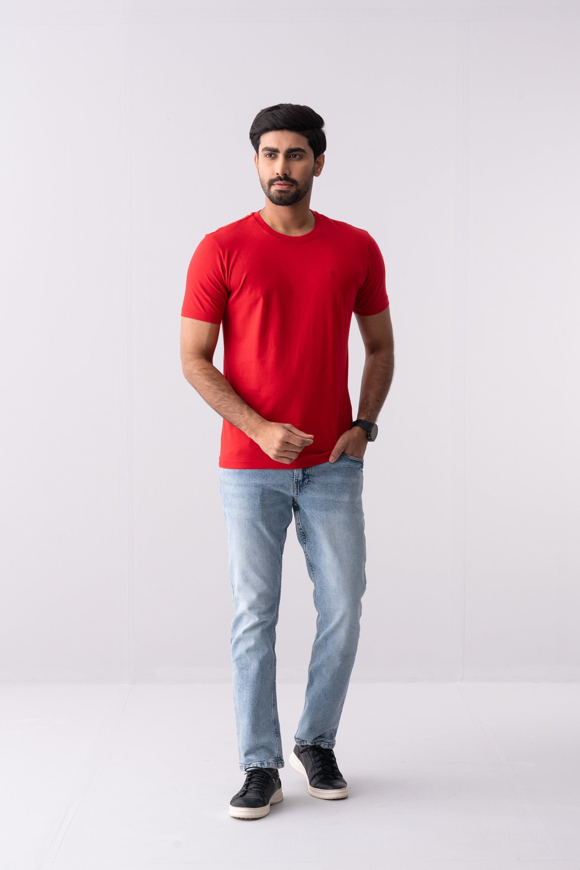 Stay comfortable and stylish with our Basic Solid Men's T-Shirt, designed for everyday wear. Crafted from soft, breathable cotton, this t-shirt offers a regular fit with crew neck short sleeves that ensure all-day comfort. The classic solid color makes it versatile, easily pairing with jeans, shorts, or casual pants for a timeless look. A little embellishment has been added at left chest of the brand logo. Brand label and contrast bartack added at the bottom for more detailing.