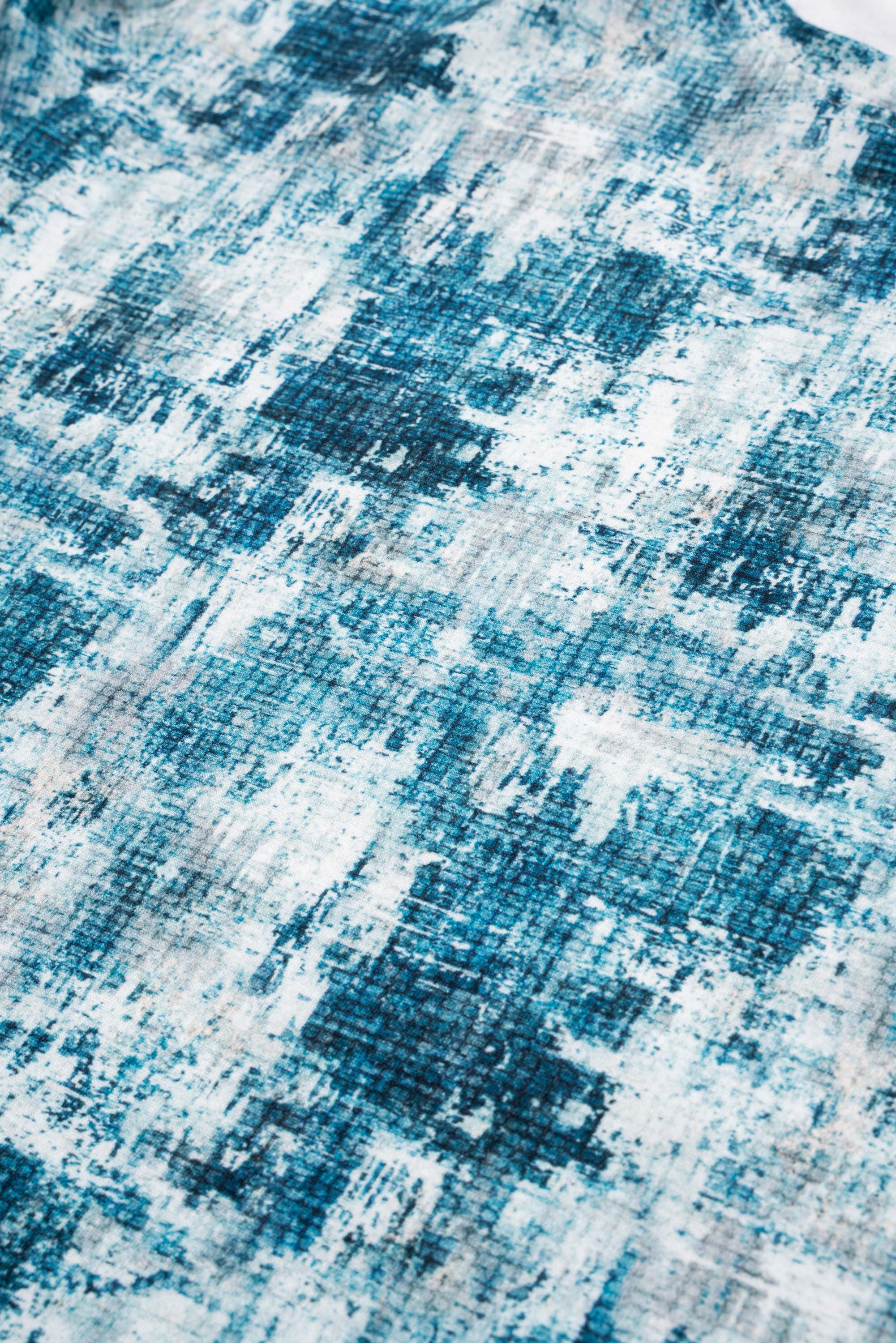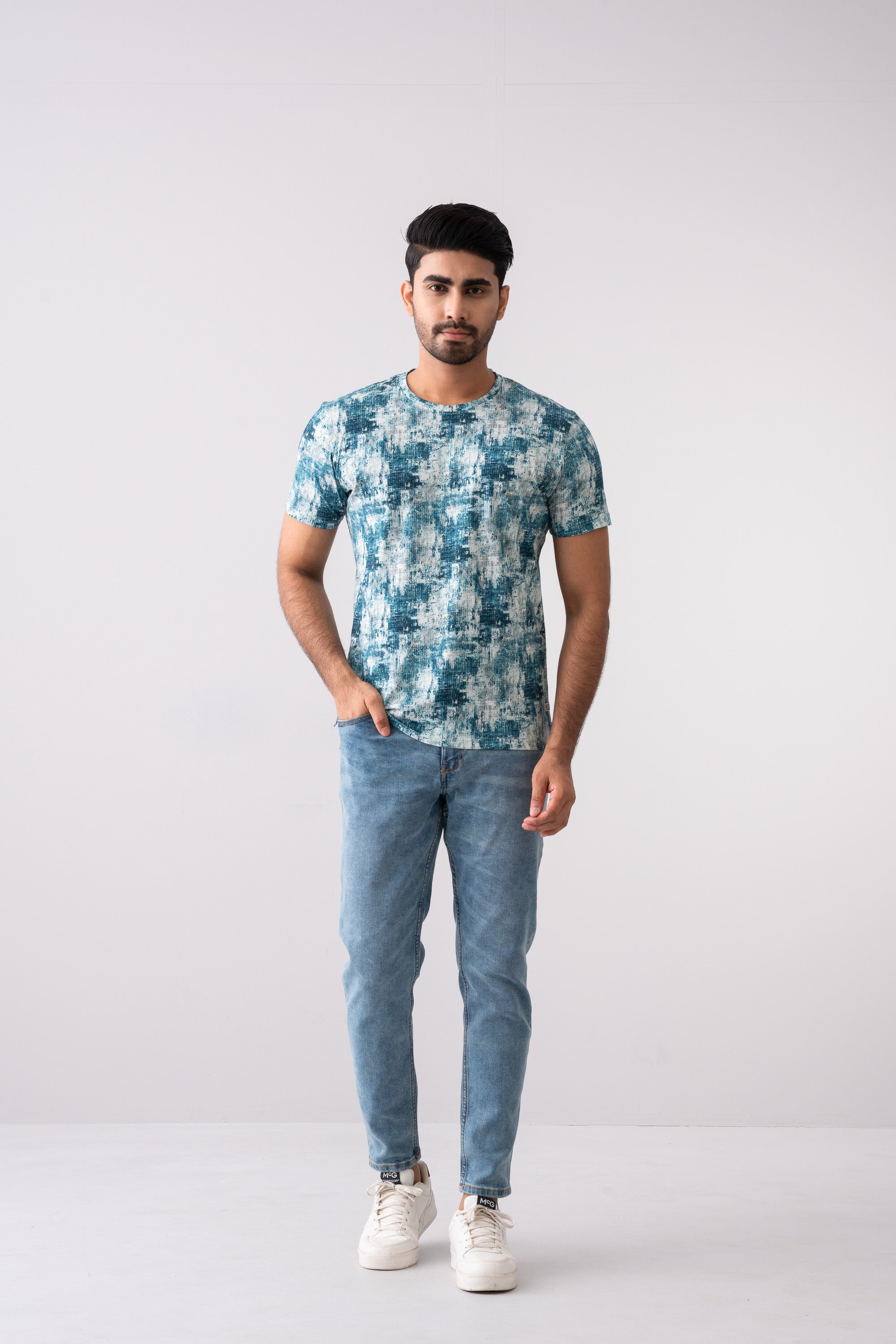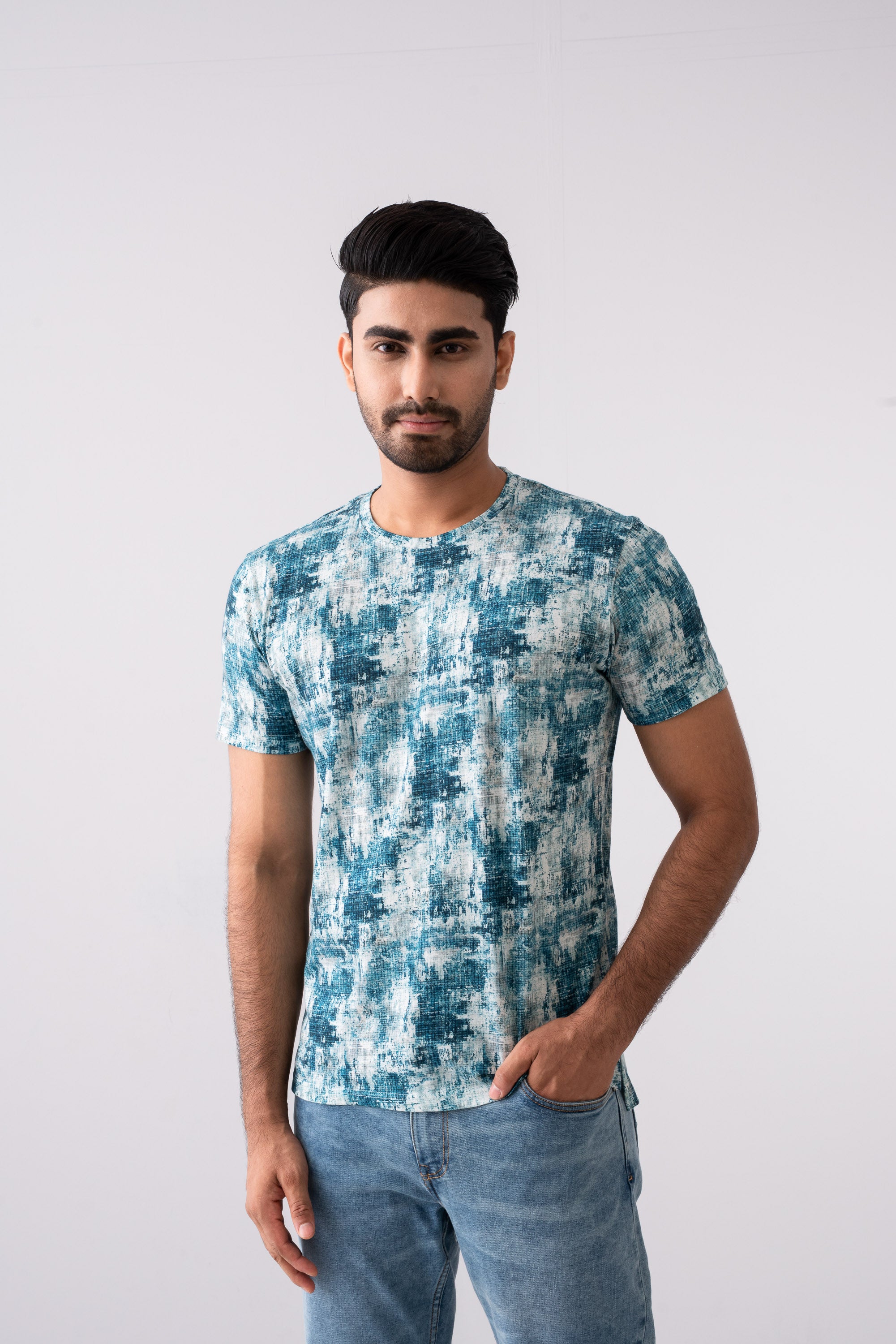 Men's digital abstract printed regular fit casual T-shirt with crew neck short sleeves. This t-shirt showcases a blend of bold and vibrant colors, creating a modern, artistic vibe. Brand label and contrast bartack added at the bottom for more detailing.