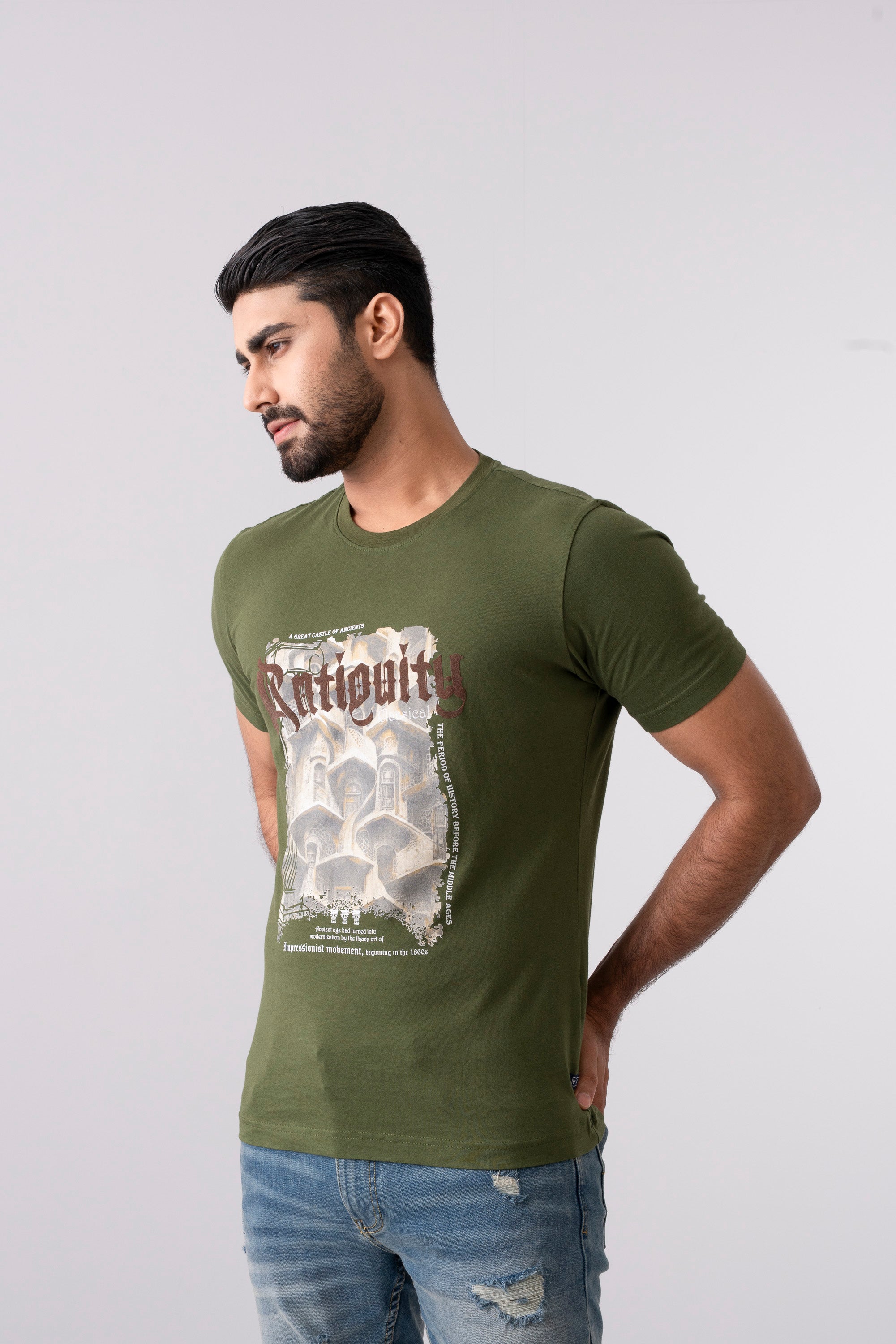 This t-shirt embodies the charm of ancient traditions with a contemporary twist inspired by classic design elements and rich historical aesthetics. It is a regular fit casual T-shirt with crew neck short sleeves. Brand label and contrast bartack added at the bottom for more detailing.
