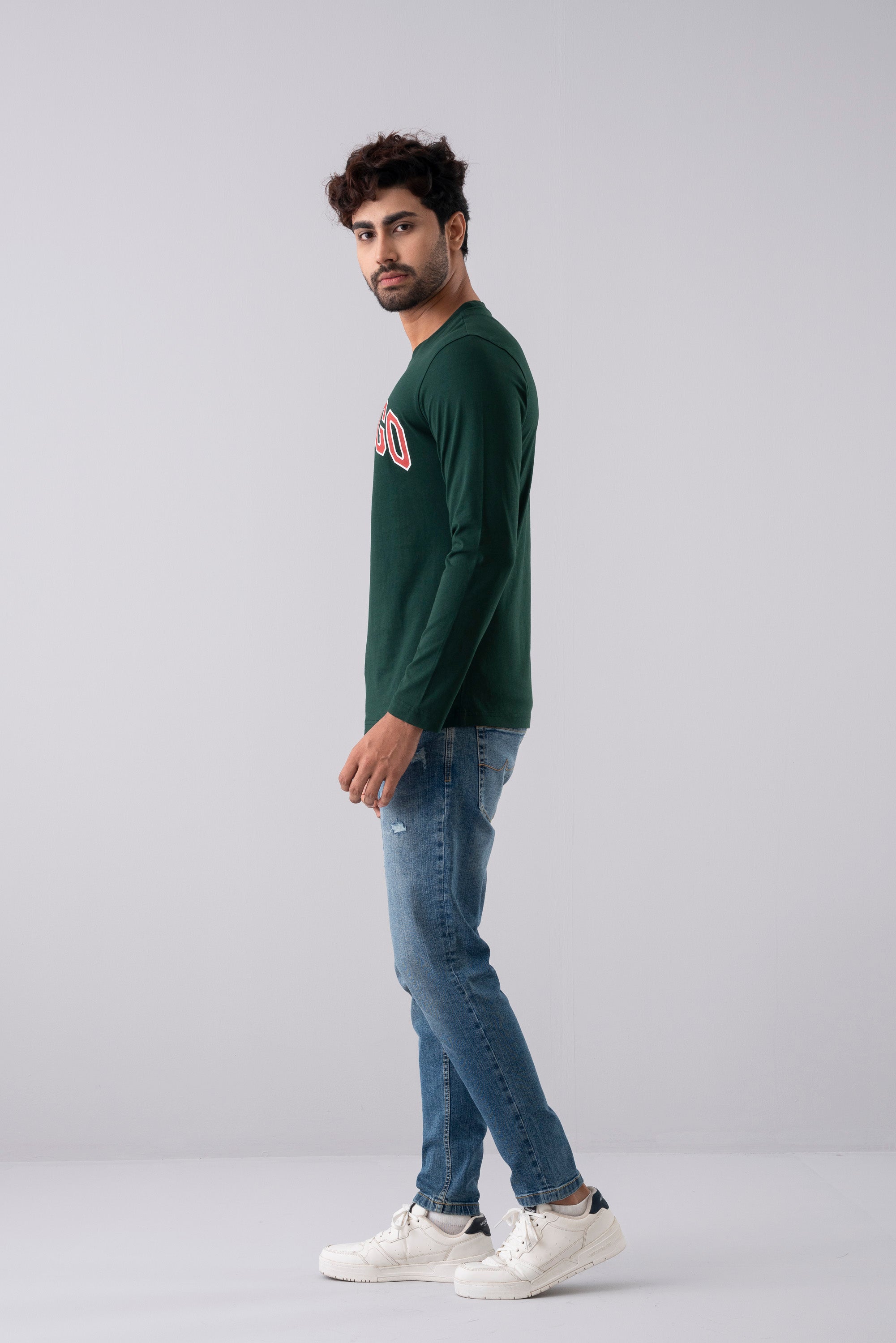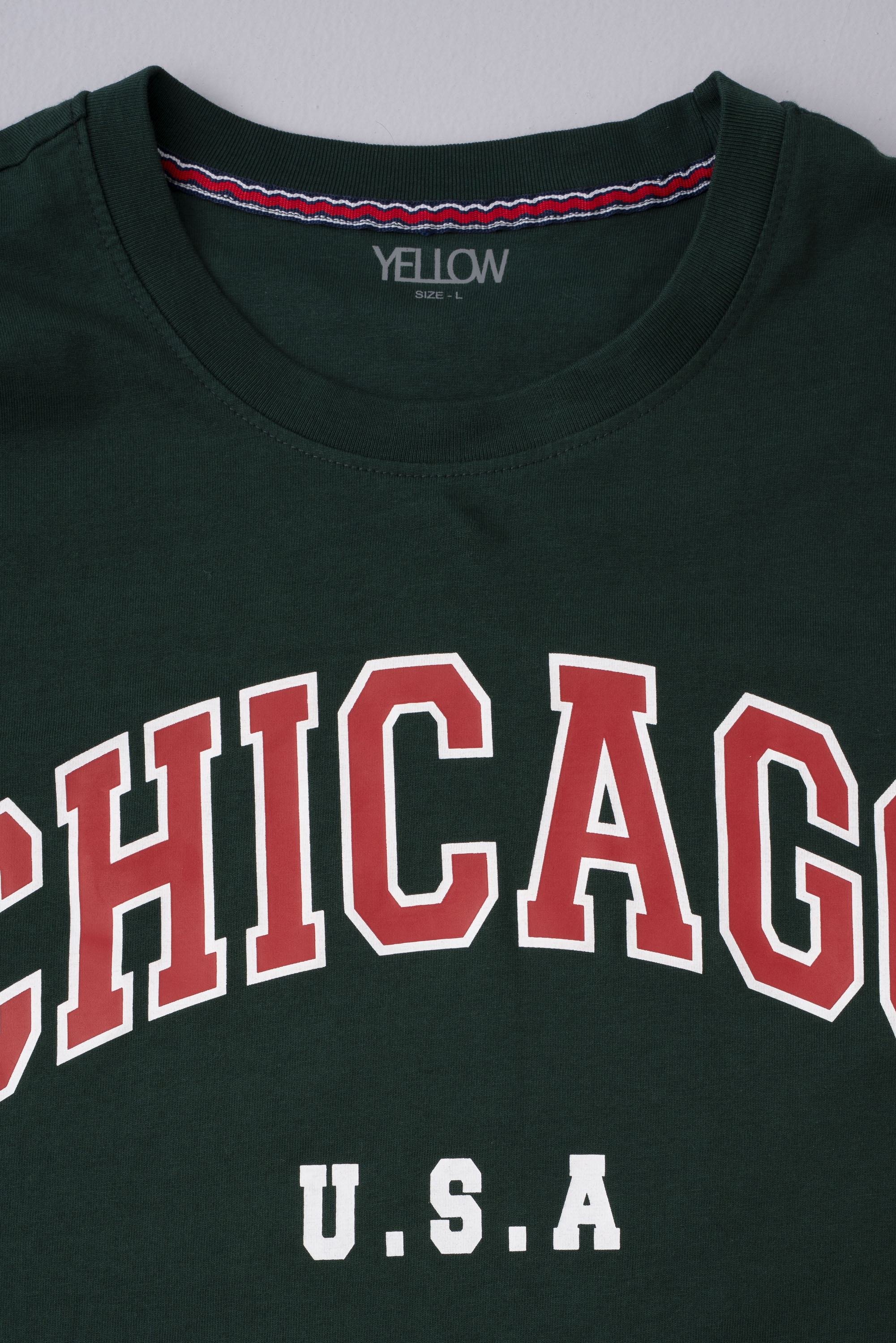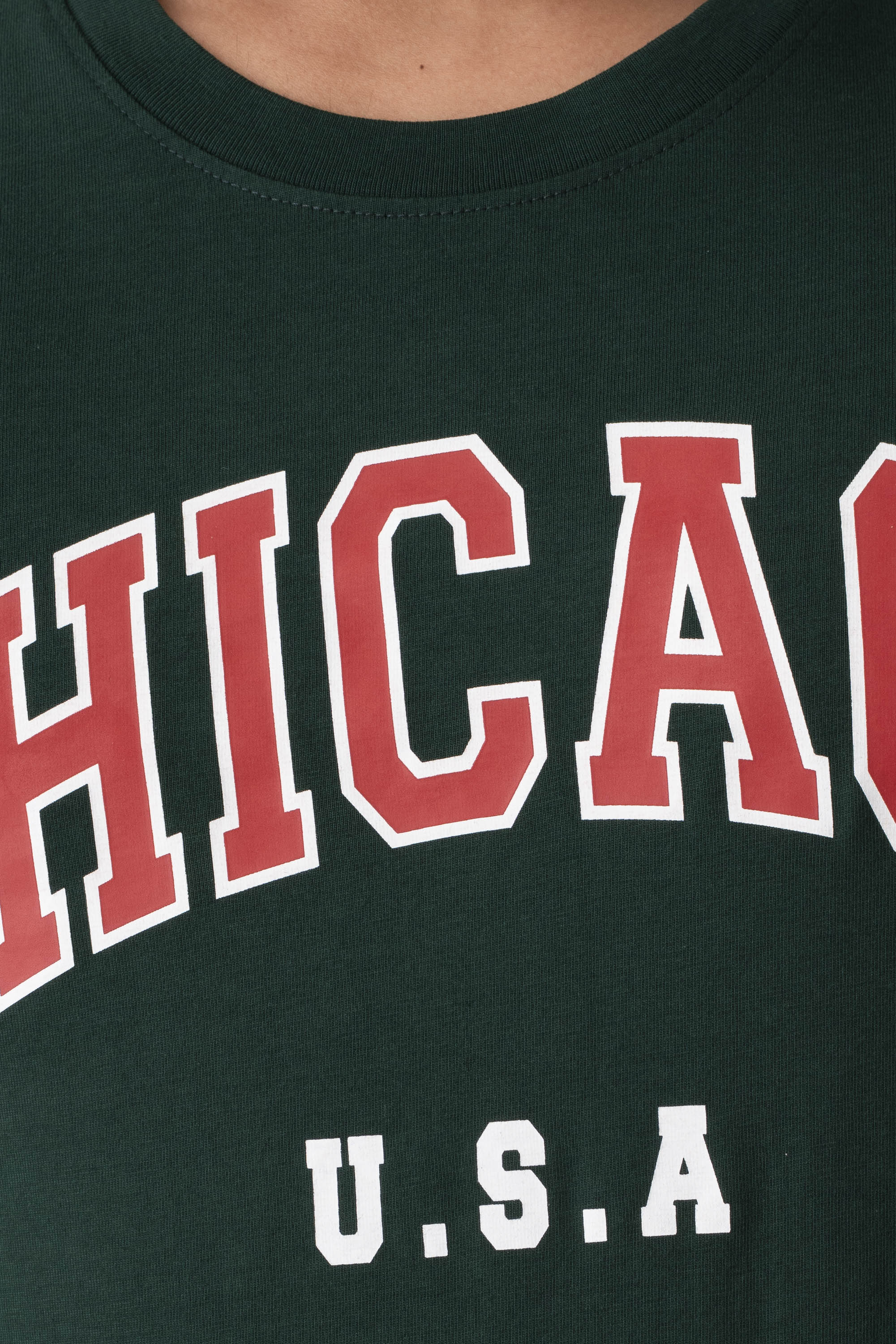 Keep it timeless and comfortable with this long-sleeve winter t-shirt. Designed from a soft cotton-blend fabric, this long-sleeve tee provides cozy warmth for cooler days. The rich green color is complemented by bold “CHICAGO U.S.A” lettering across the chest, adding a sporty, collegiate vibe. Featuring a regular fit and crew neckline, it pairs effortlessly with jeans, chinos, or joggers — perfect for everyday wear through the winter season. Contrast neck tape & logo badge added for more detailing.