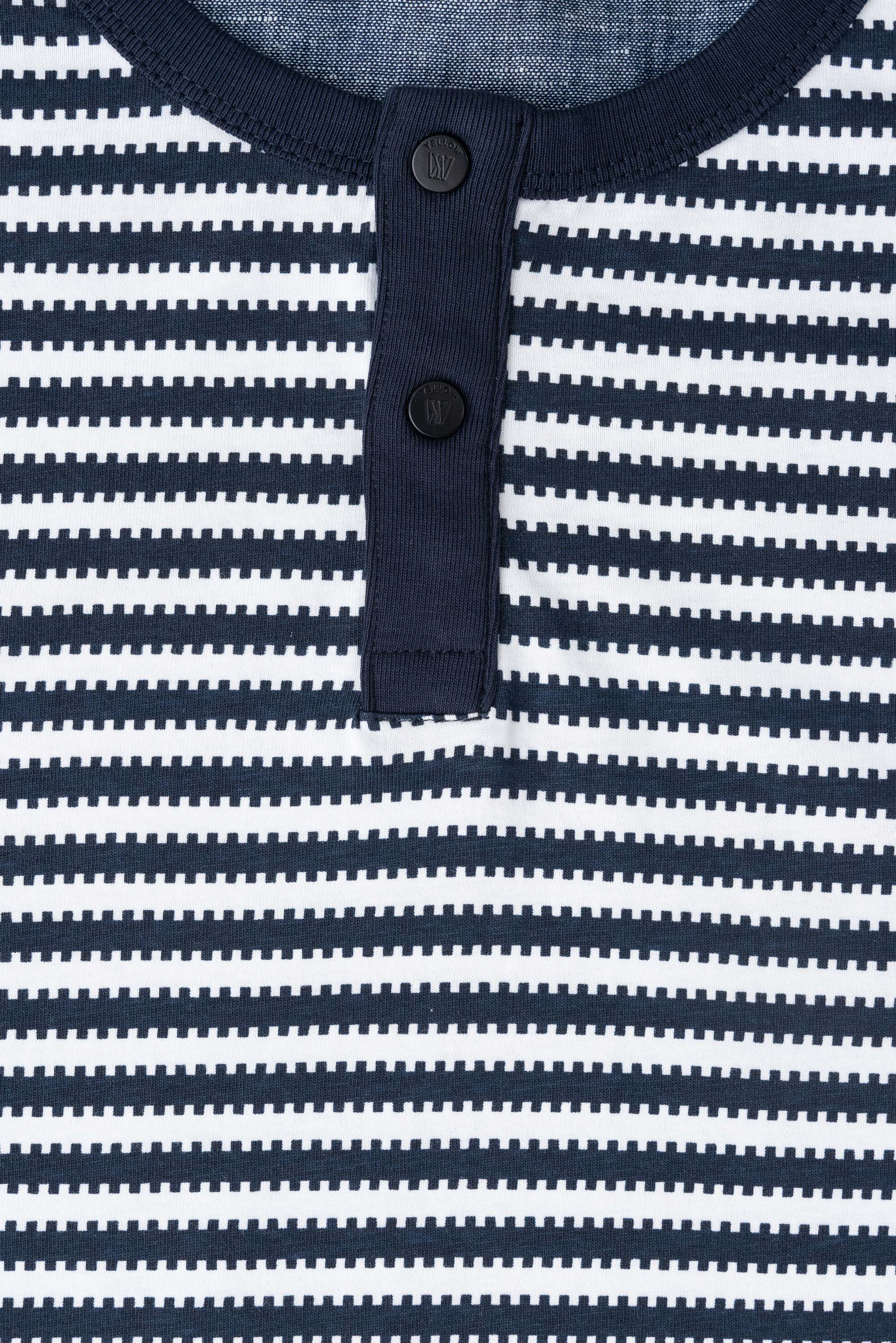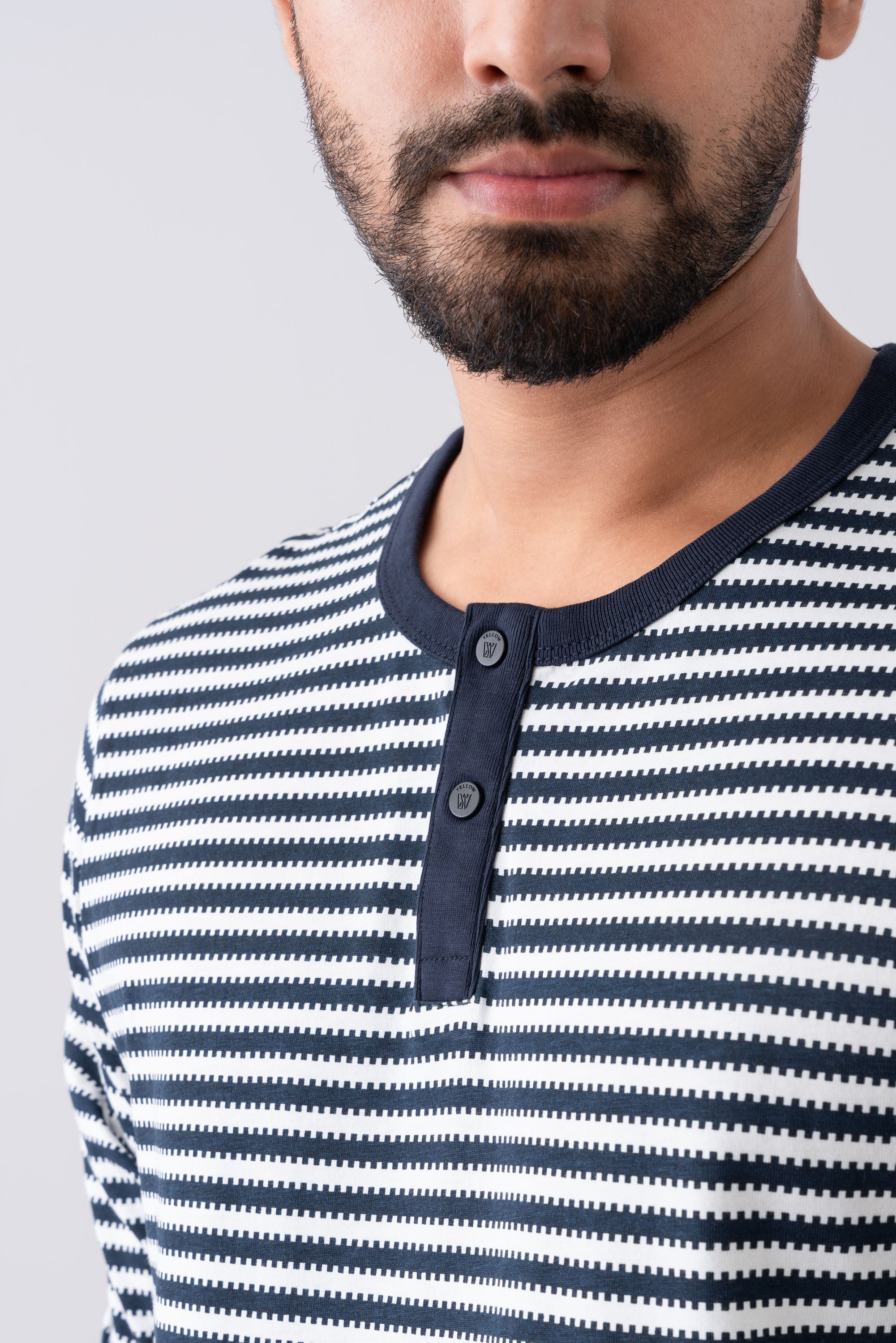 Crafted with refined detailing and elevated comfort, this regular fit long sleeve henley T-shirt redefines everyday sophistication. The precision-printed stripe pattern offers a clean, balanced aesthetic, while the contrast henley placket and logo-engraved buttons introduce a luxurious touch. At the back, a lightweight denim moon also at lower placket adds subtle texture and distinction—an upscale element designed to enhance structure and character. Smooth, breathable, and thoughtfully engineered, this piece delivers a polished look that transitions effortlessly from casual moments to elevated daywear.