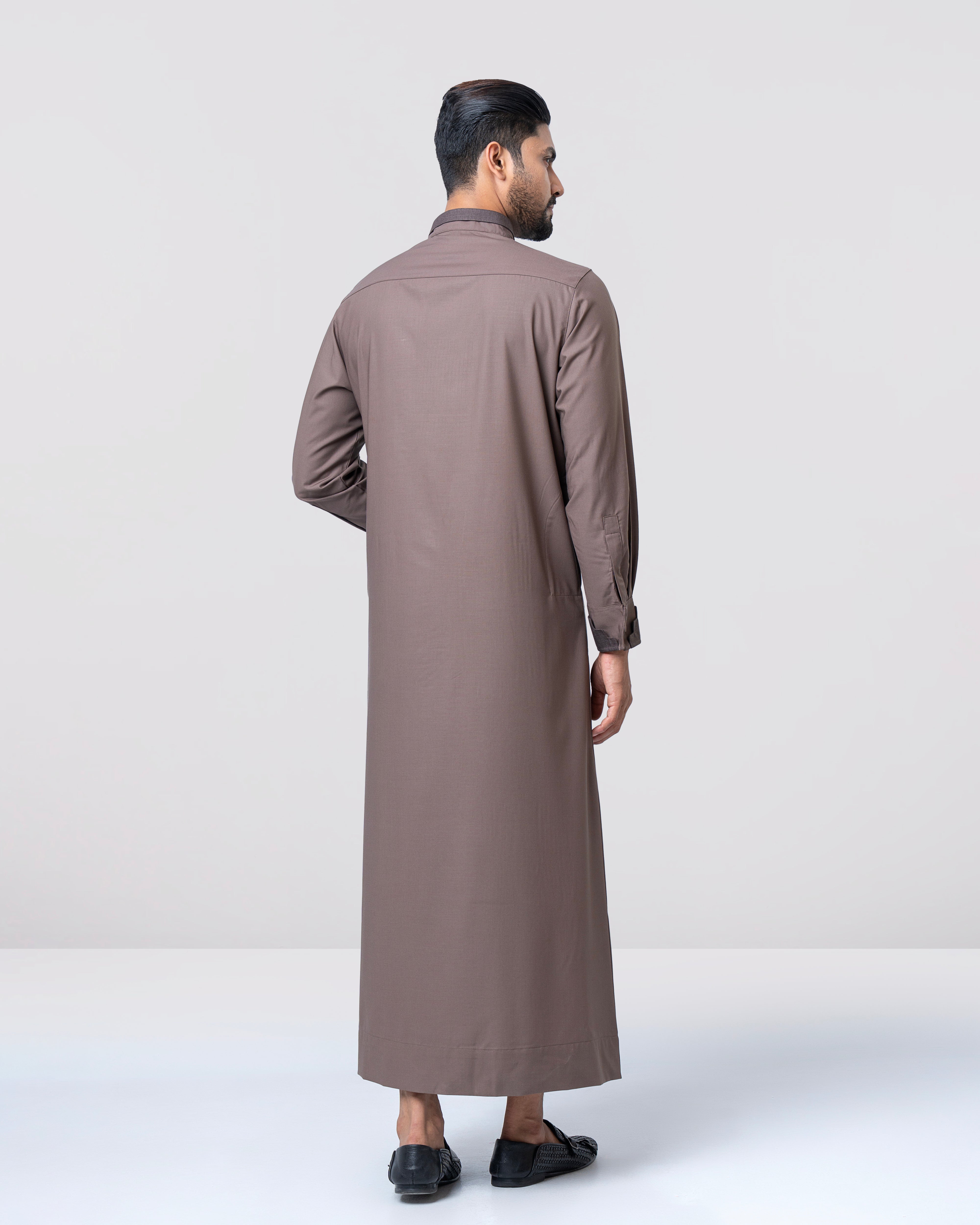 Crafted with premium poly viscose blended refined style, this regular fit premium thobe blends timeless elegance with modern sophistication. This formal wear featuring innovative contrast french cuffs with snap buttons that add a distinguished and luxurious touch, a sleek hidden placket for a clean and seamless front, and a discreet hidden pocket that offers practicality without disrupting the silhouette. The carefully tailored contrast collar completes the design with a polished and graceful finish, making this thobe a perfect expression of understated luxury and elegance.