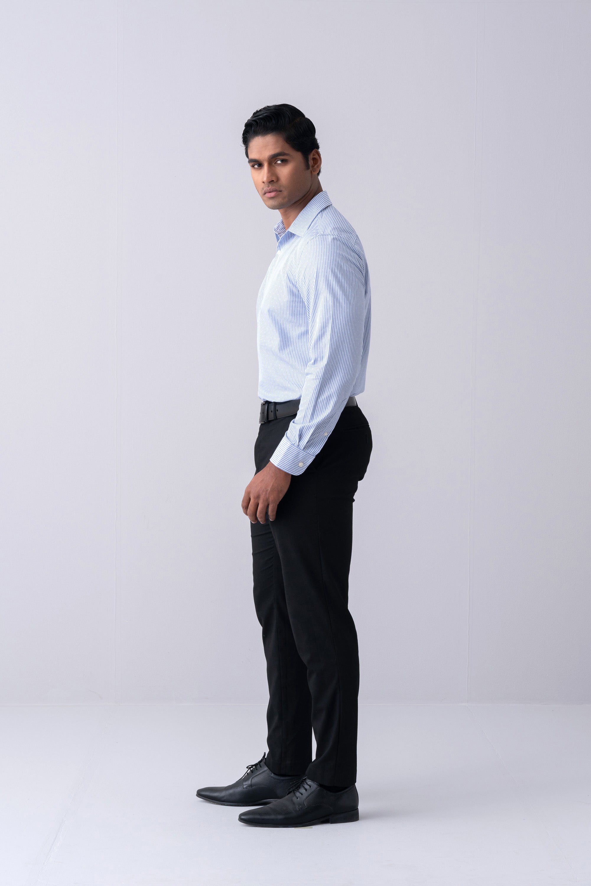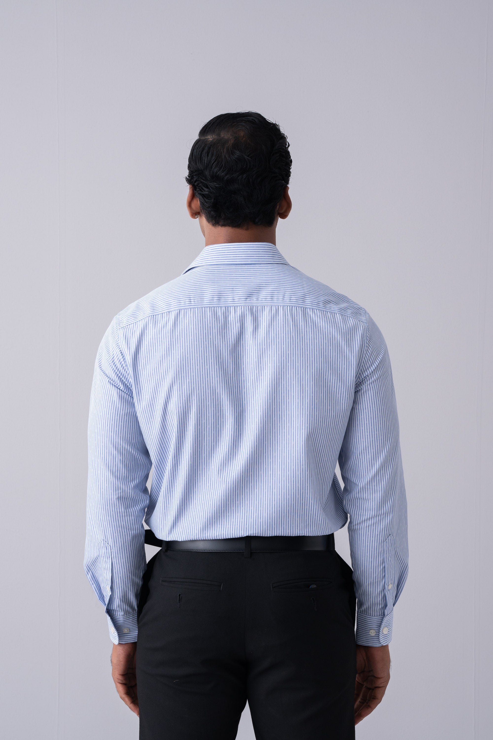 Crafted for elegance and comfort, this slim-fit formal shirt features a thin dobby stripe for a refined look. Made from 100% fine yarn cotton, it offers a soft, breathable feel with an easy-care finish for effortless maintenance. The classic collar ensures a timeless appeal, while the diagonal stripe facing adds a subtle touch of sophistication. Perfect for professional and formal settings, this shirt combines style and practicality seamlessly.