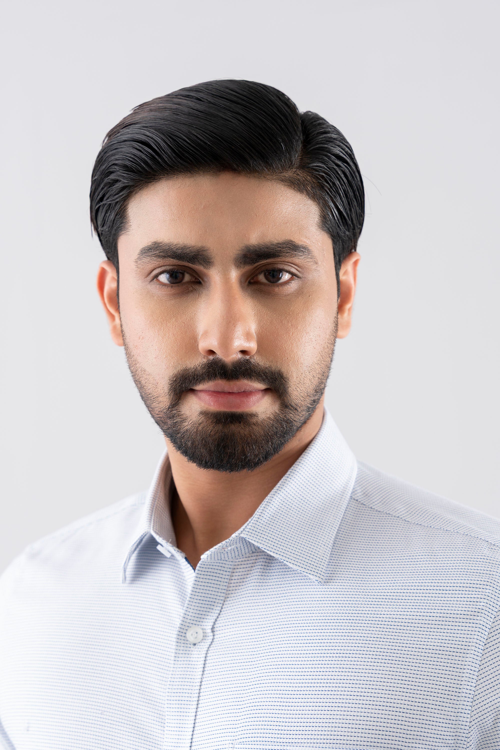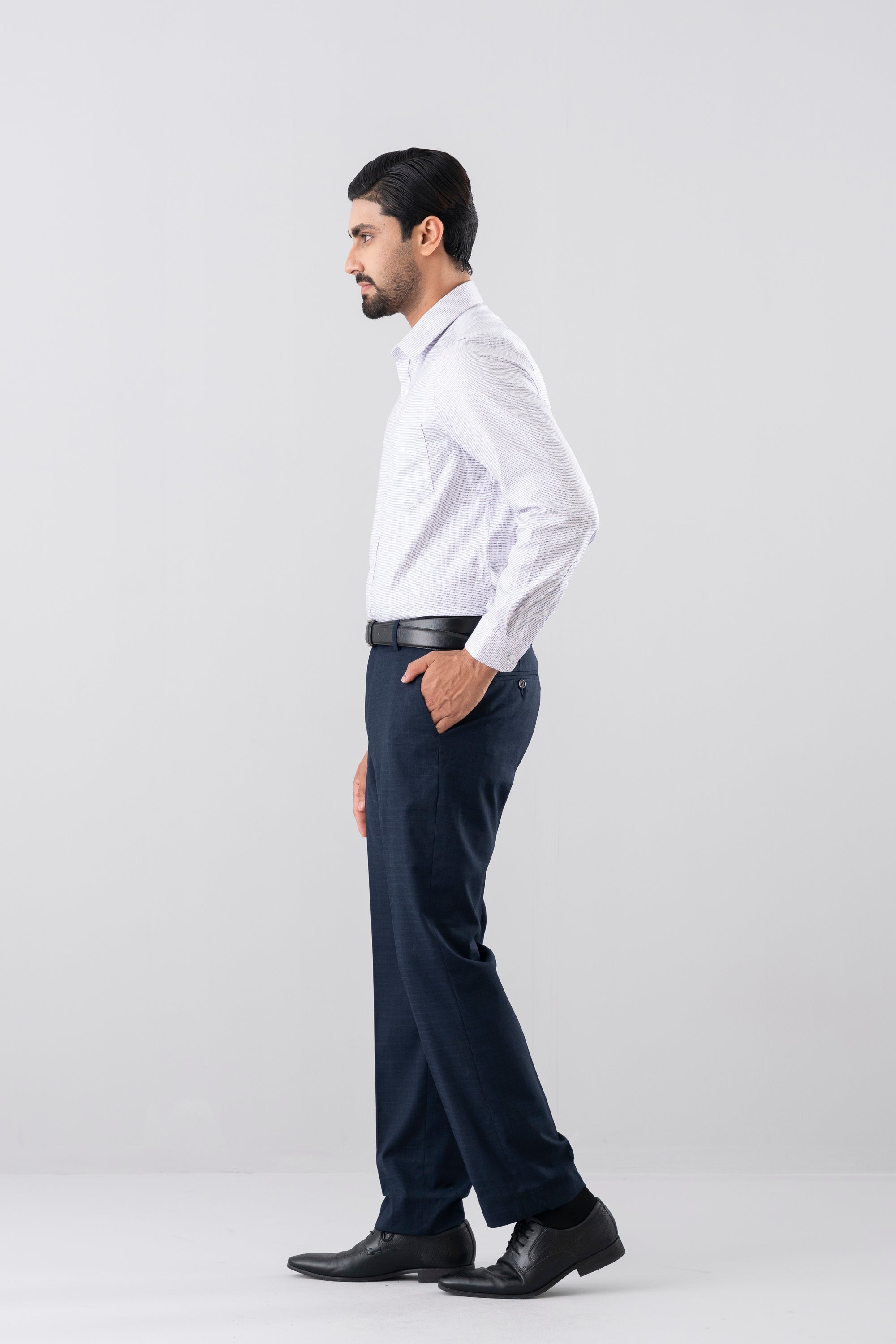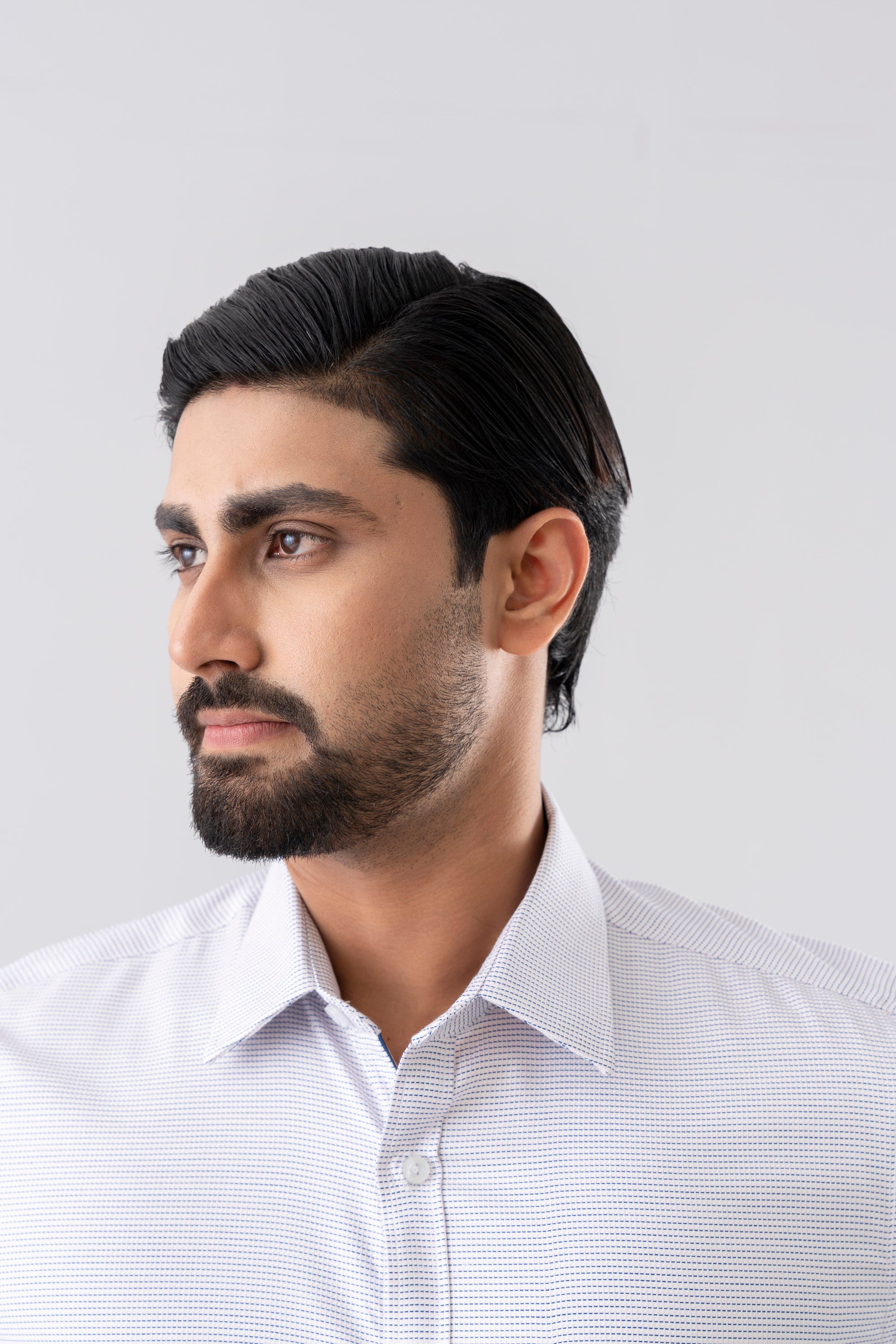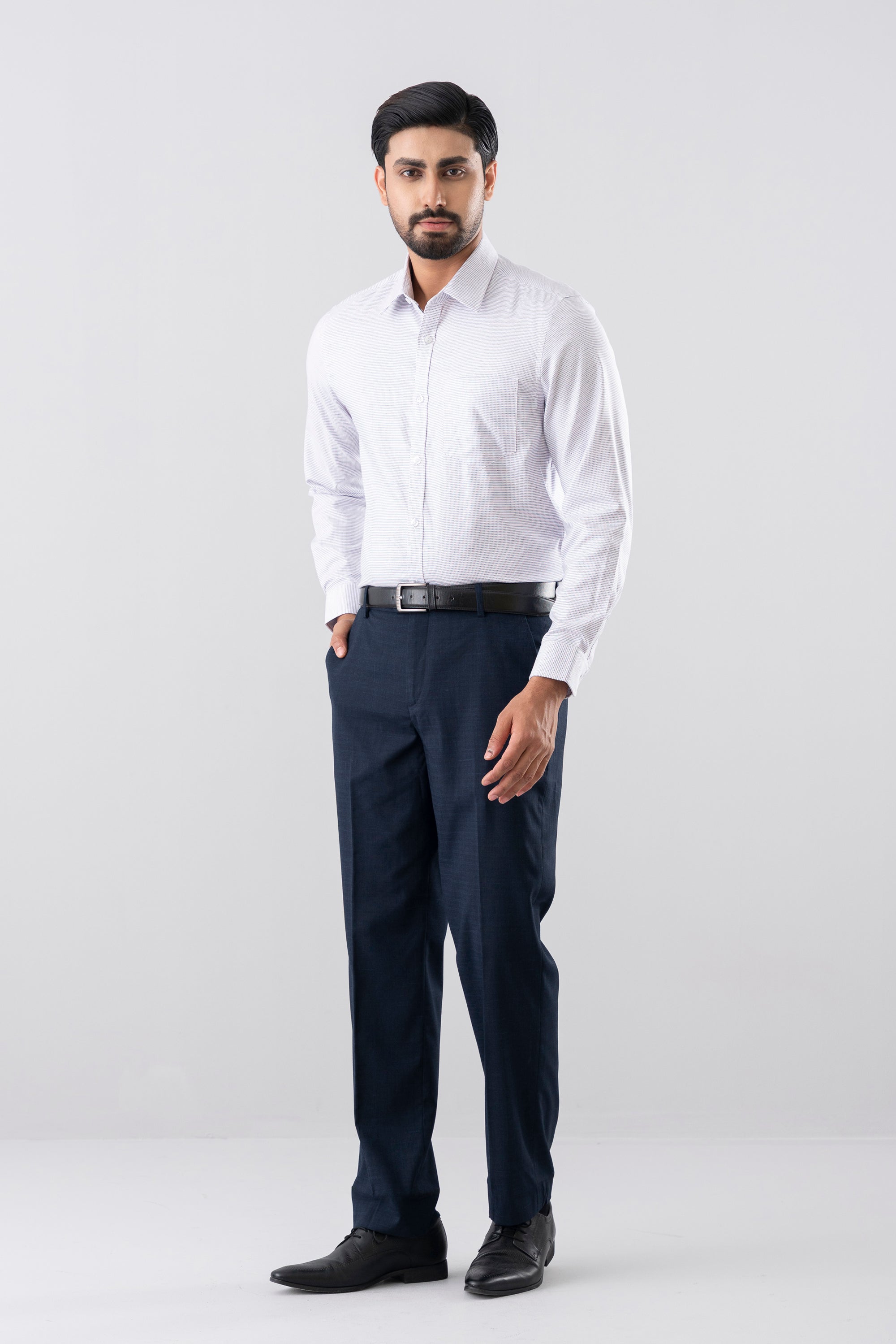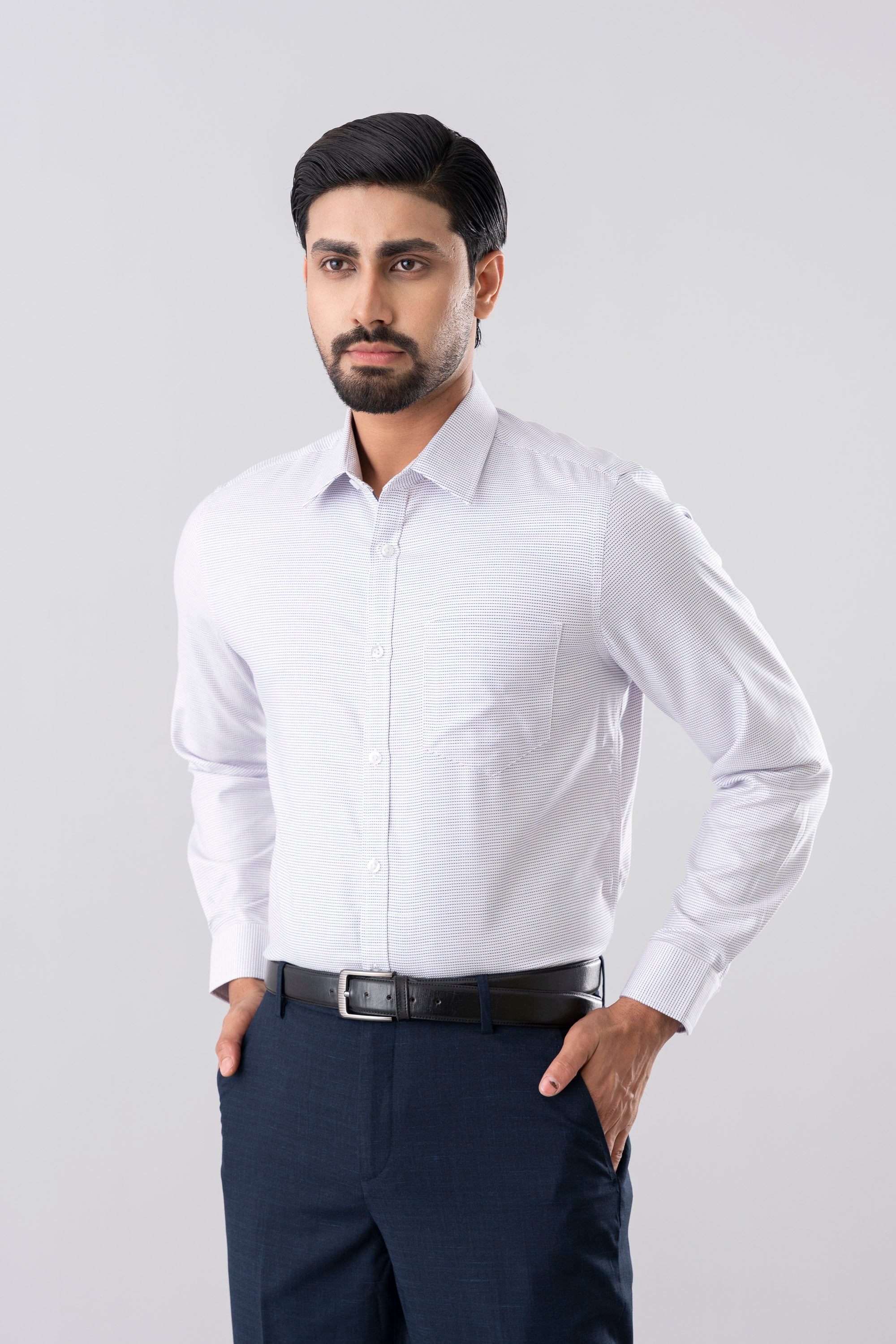A slim fit formal shirt tailored for a sharp and contemporary silhouette. Crafted from premium yarn in a refined yarn-dyed twill construction, it offers rich color depth and lasting durability. Designed with a timeless classic collar and wrinkle-resistant finish for a crisp, polished look throughout the day. Finished with contrast grosgrain tape at the inside collar and button placket, adding a subtle yet sophisticated detailing touch.