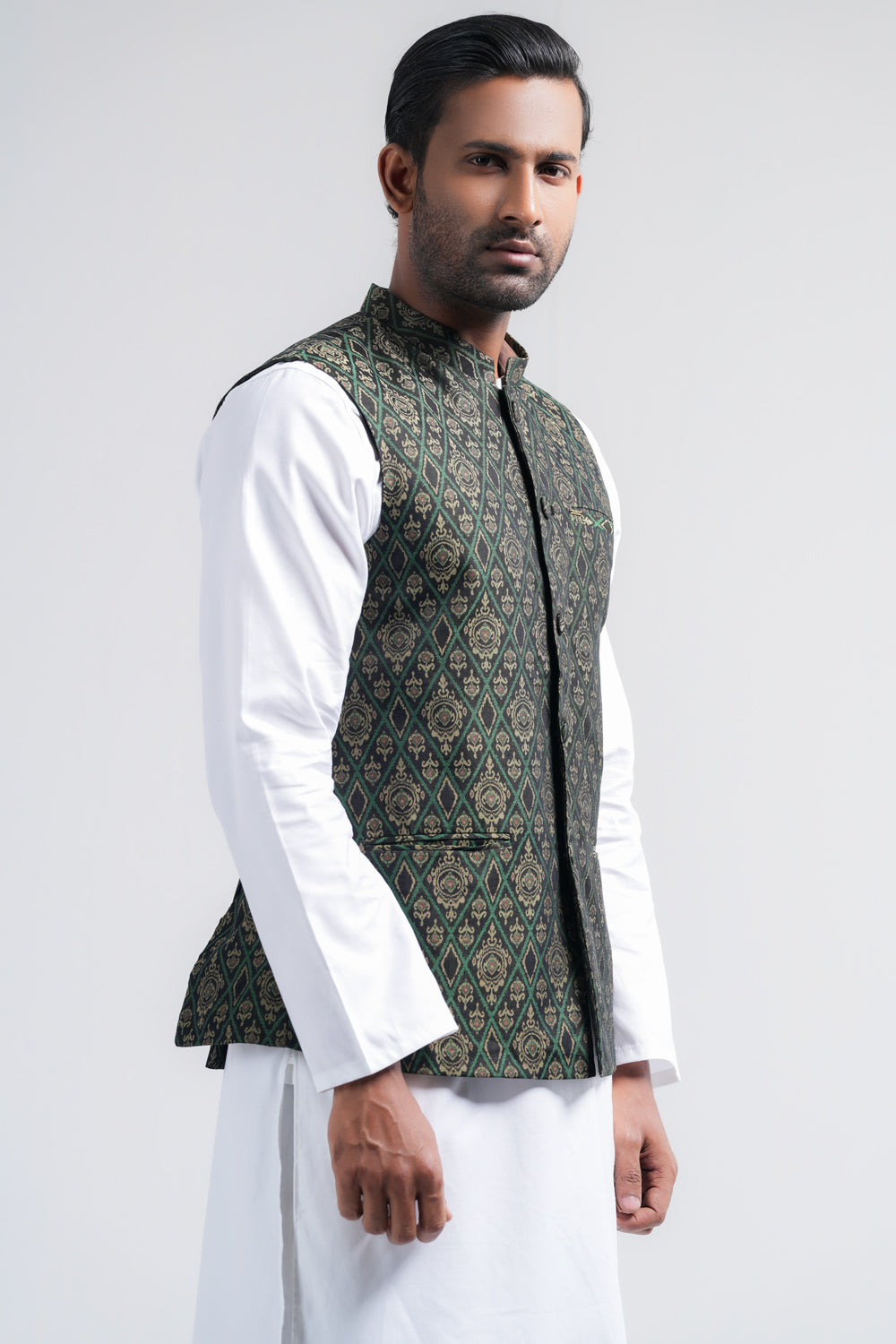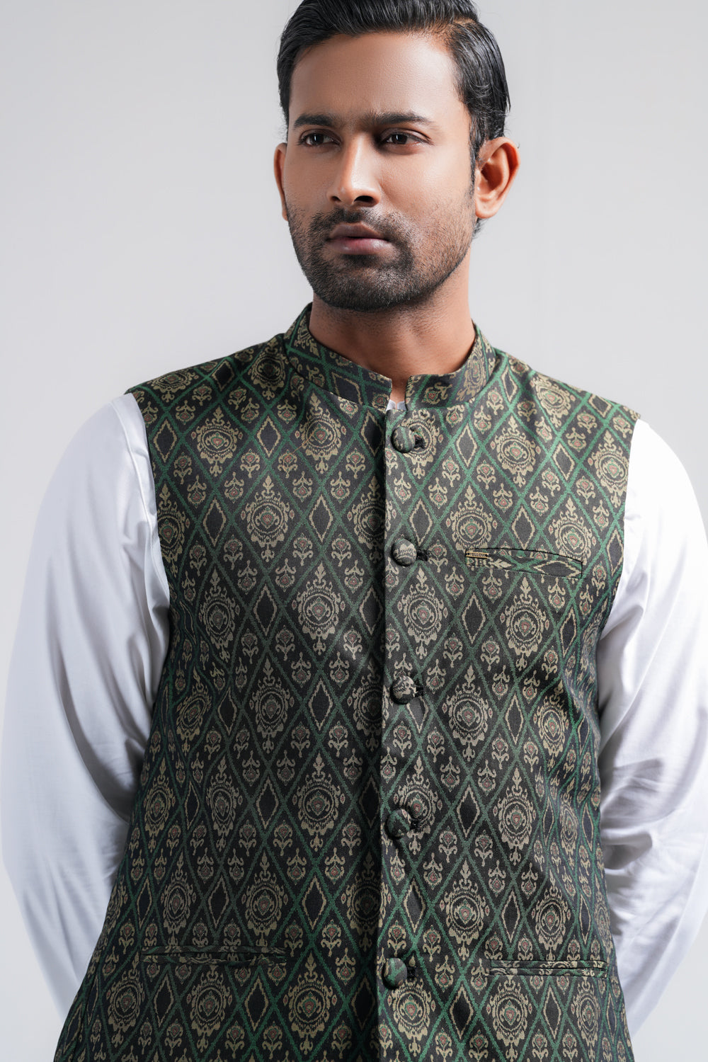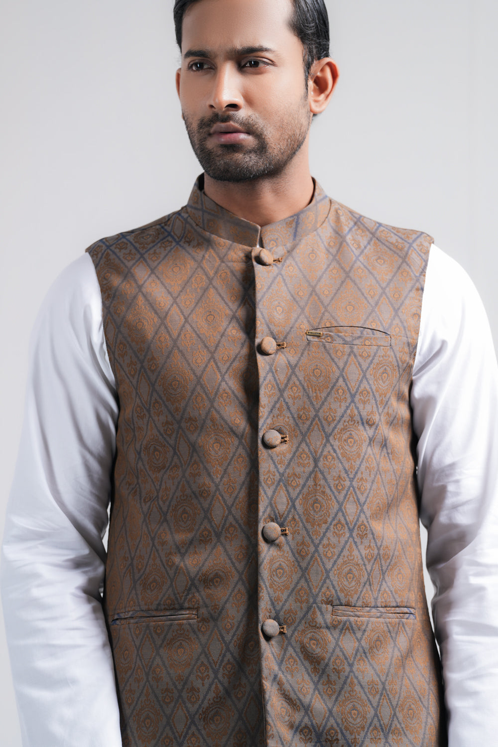 Crafted from premium jacquard fabric, this regular-fit waistcoat features a mandarin band collar, detailed pockets and a taffeta-lined interior for added comfort. Complemented by elegant fabric cover buttons, it exudes a classic and refined style, perfect for every occasions.