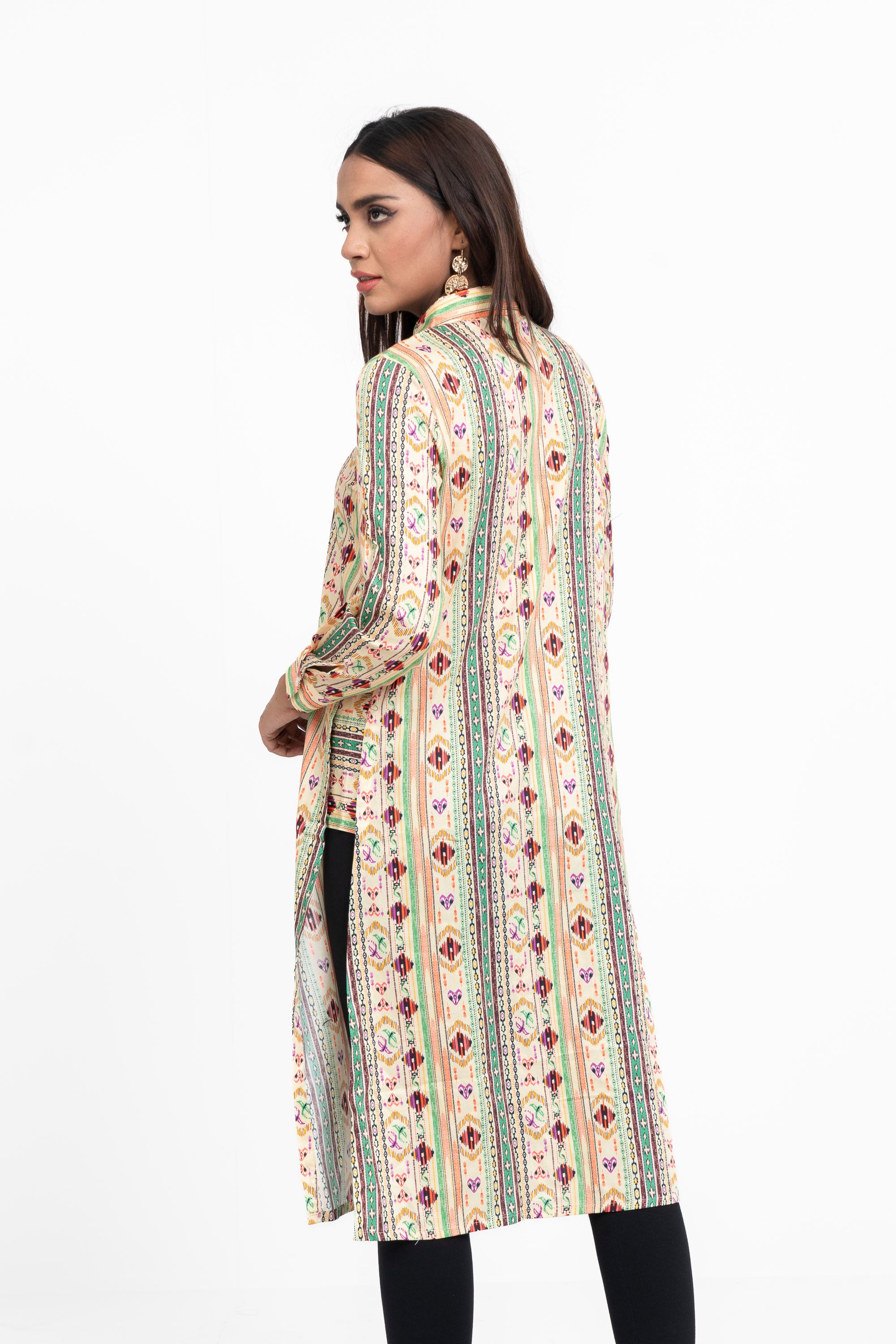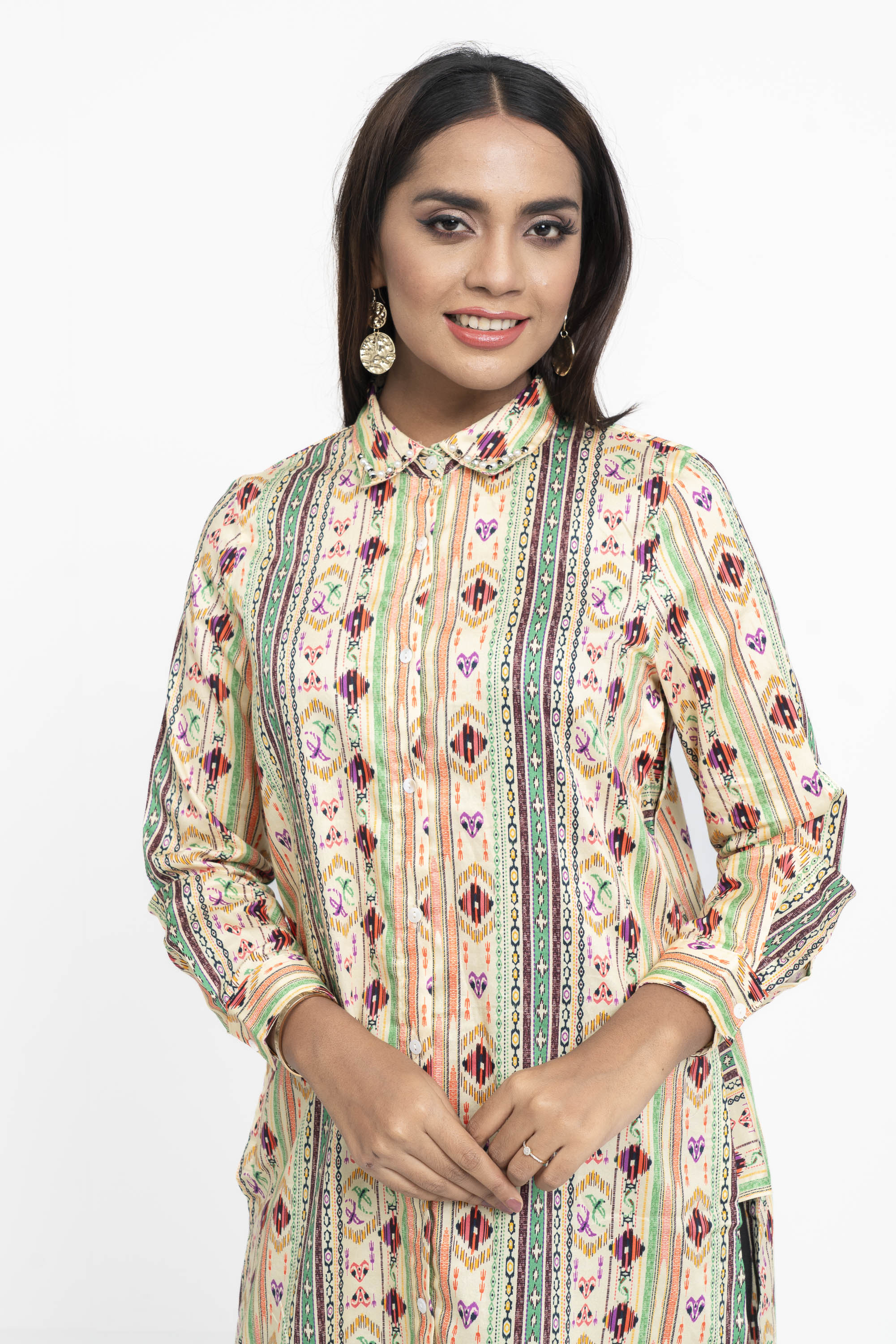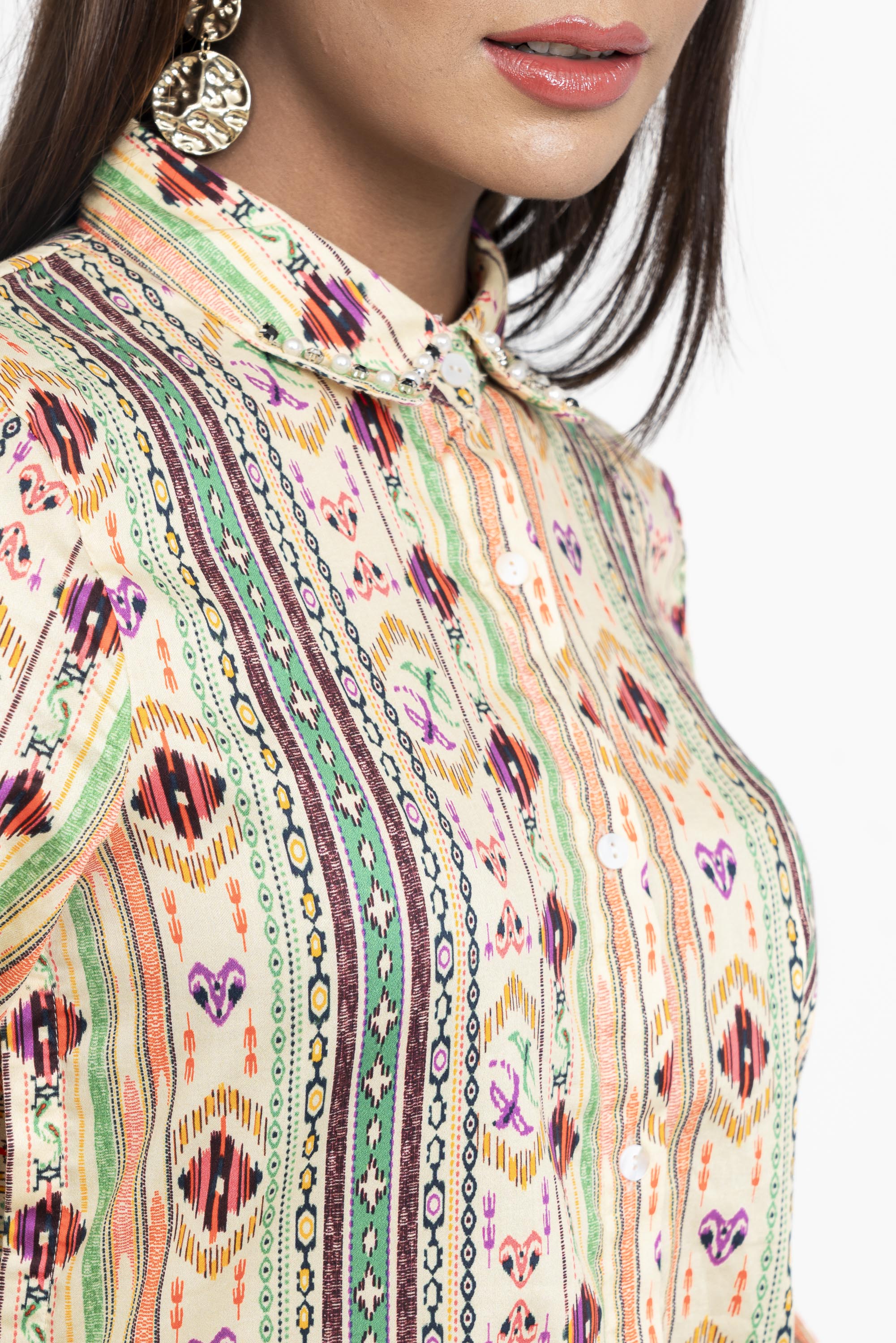 Make a statement in this tribal printed long shirt with embellished collar. The intricate embellishments add a touch of glamour and sophistication to the classic sillouette. Made with 100% cotton sateen, This comfortable fit and lightweight fabric make it perfect for all-day wear. Pair it with jeans or a skirts for a chic and stylish outfit that's perfect for any occasion. Stand out and make a fashion statement with this beautiful shirt.