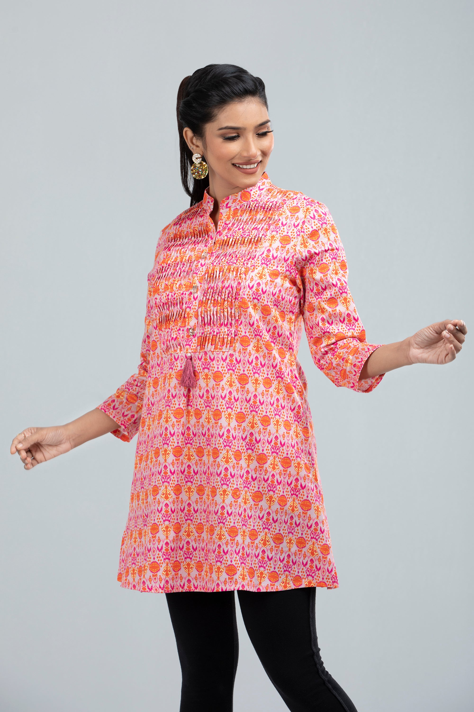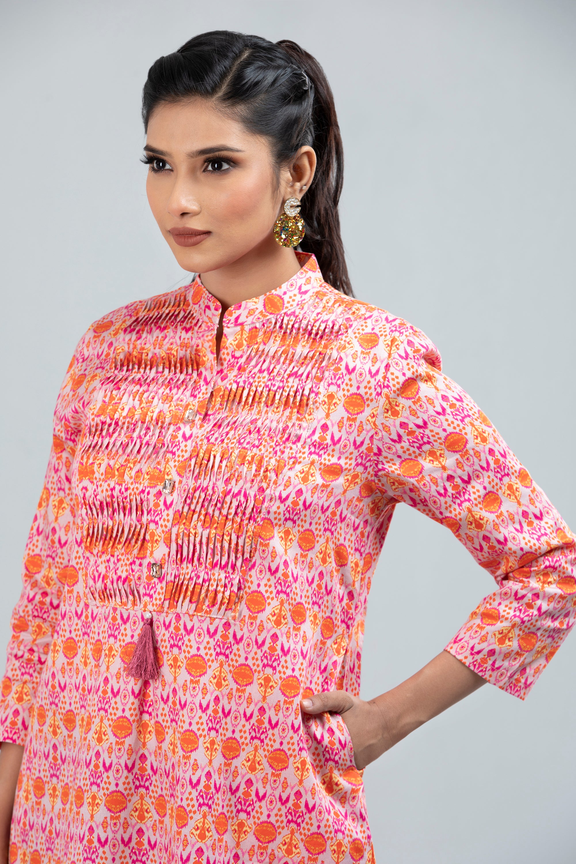 Nestle into a sophisticated style with this ikat printed top in pink elegance. made with 100% cotton sateen, Its has a band collar, intrciate pleats & embellishments make a graceful statement, while the stone button-down detail adds a touch of allure.