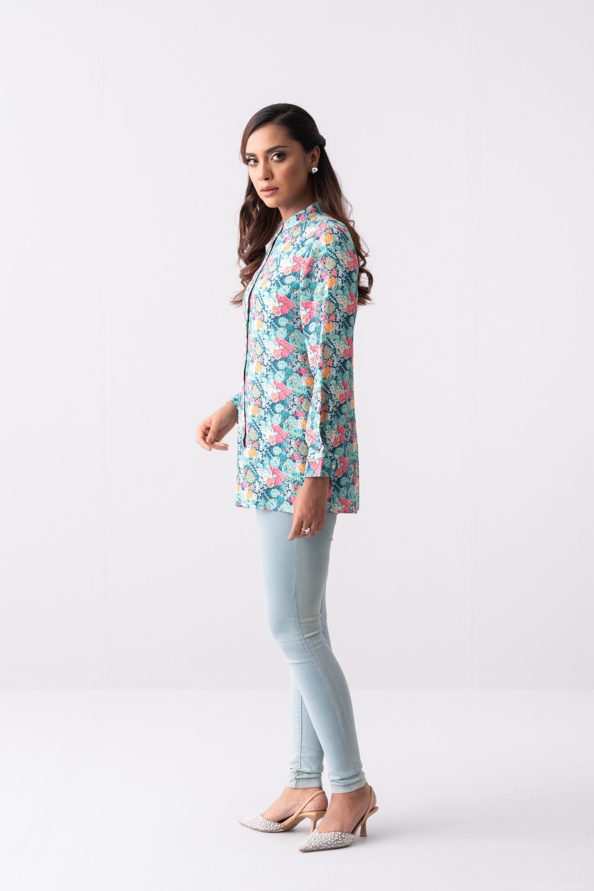 This Mystika Top offers a regular fit with a mid-length cut, ensuring a comfortable yet stylish look. Its floral digital print adds a modern charm, while the full sleeves and band collar enhance its elegance. The button placket provides both style and functionality. Made from soft viscose fabric, it is lightweight, breathable, and perfect for all-day wear. A versatile piece for both casual and refined styling.