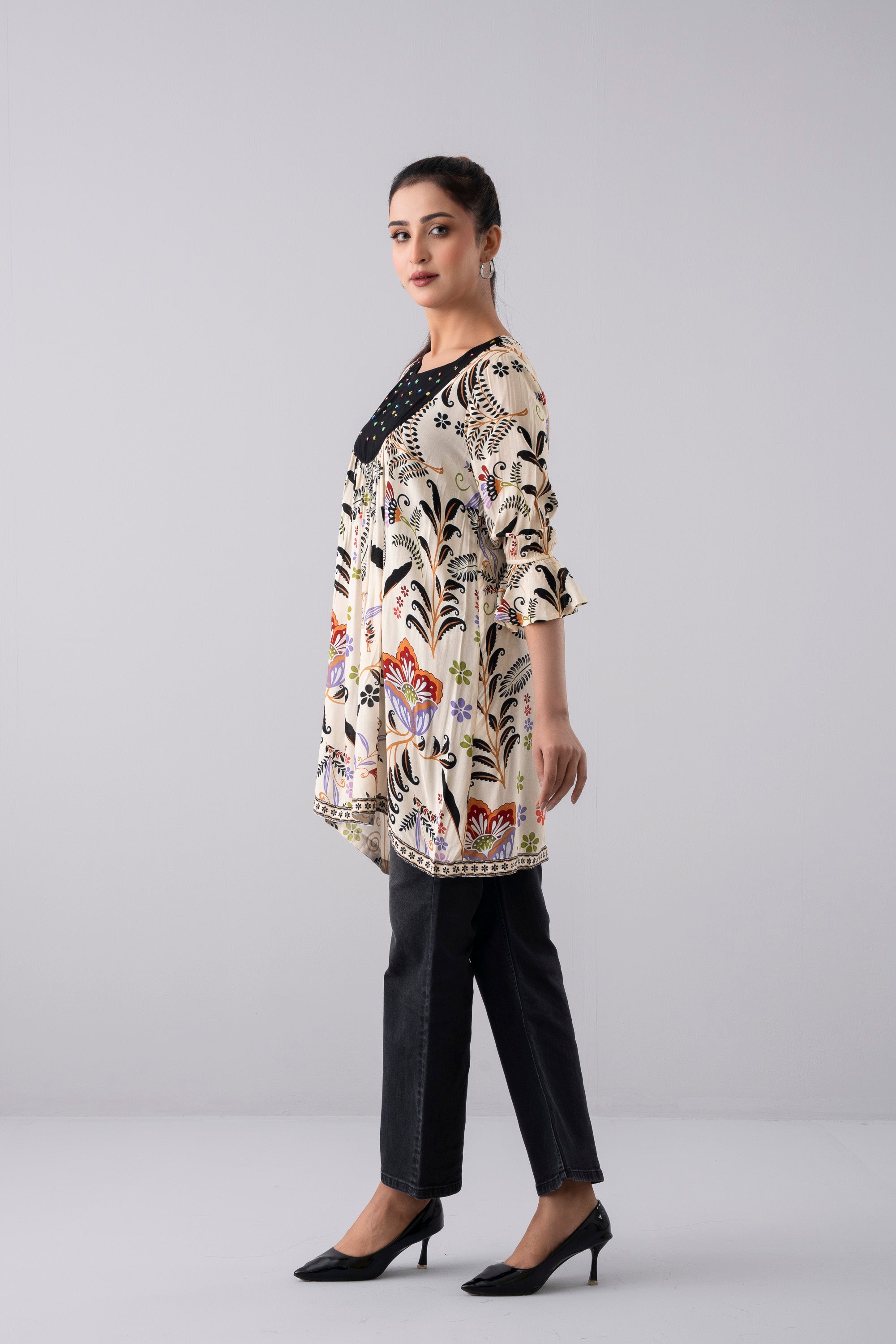 A beautifully crafted regular-fit top made from 100% viscose with a fine yarn count for a smooth, lightweight feel. It features an elegant digital print that adds vibrant charm, complemented by delicate hand embellishment at the chest for a touch of artistry. Designed with full sleeves and graceful ruffle cuffs, this top blends sophistication, comfort, and feminine detail—perfect for both casual and dressy occasions.