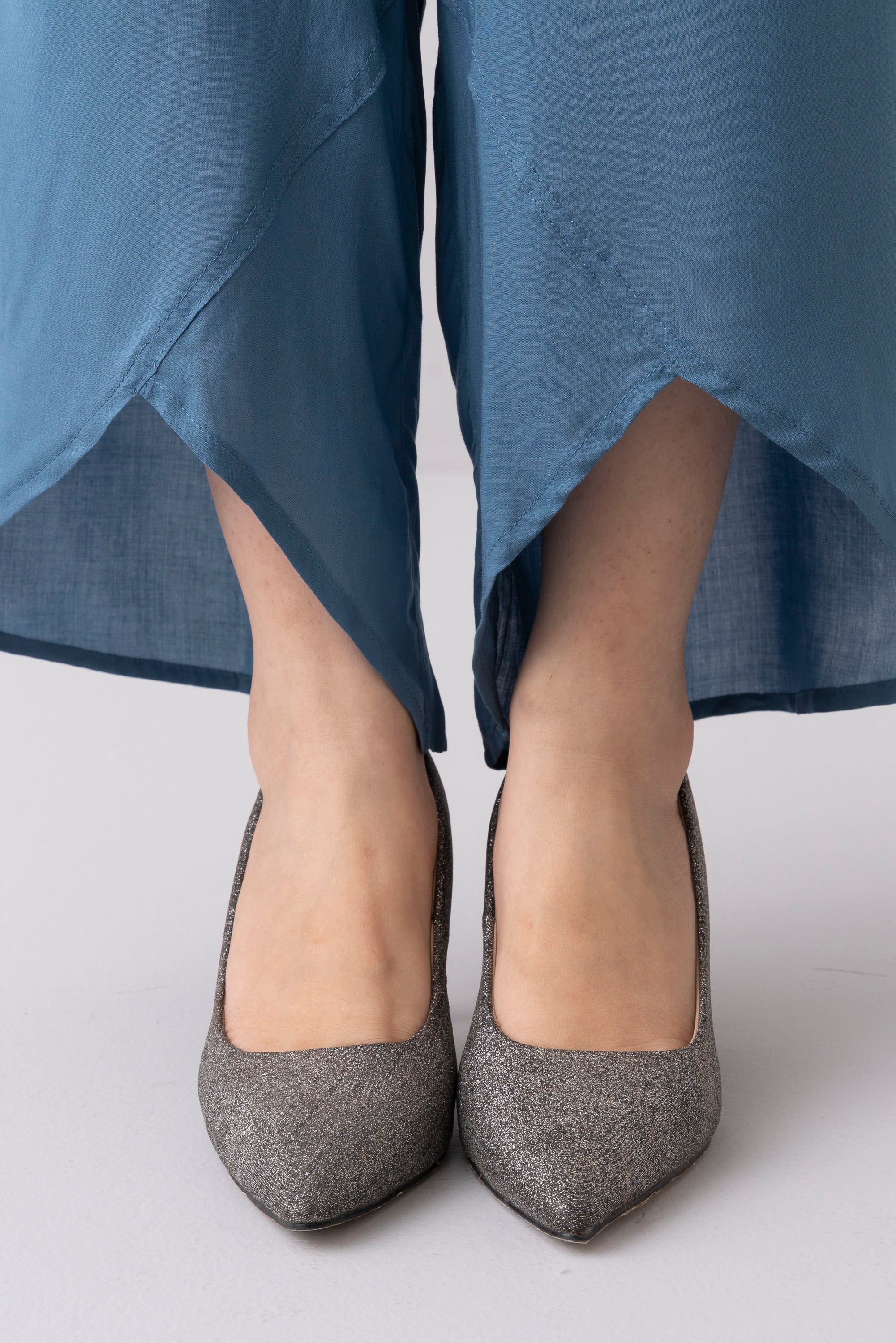 This pant showcases a straight-cut silhouette that offers a modern and flattering fit. The front waistband features a half-elastic design, combining a structured appearance with added comfort and flexibility. A distinctive tulip cut at the bottom hem adds a stylish and graceful detail, creating subtle movement and visual interest. This unique combination of shape and design elements makes the pant both chic and wearable for various occasions.