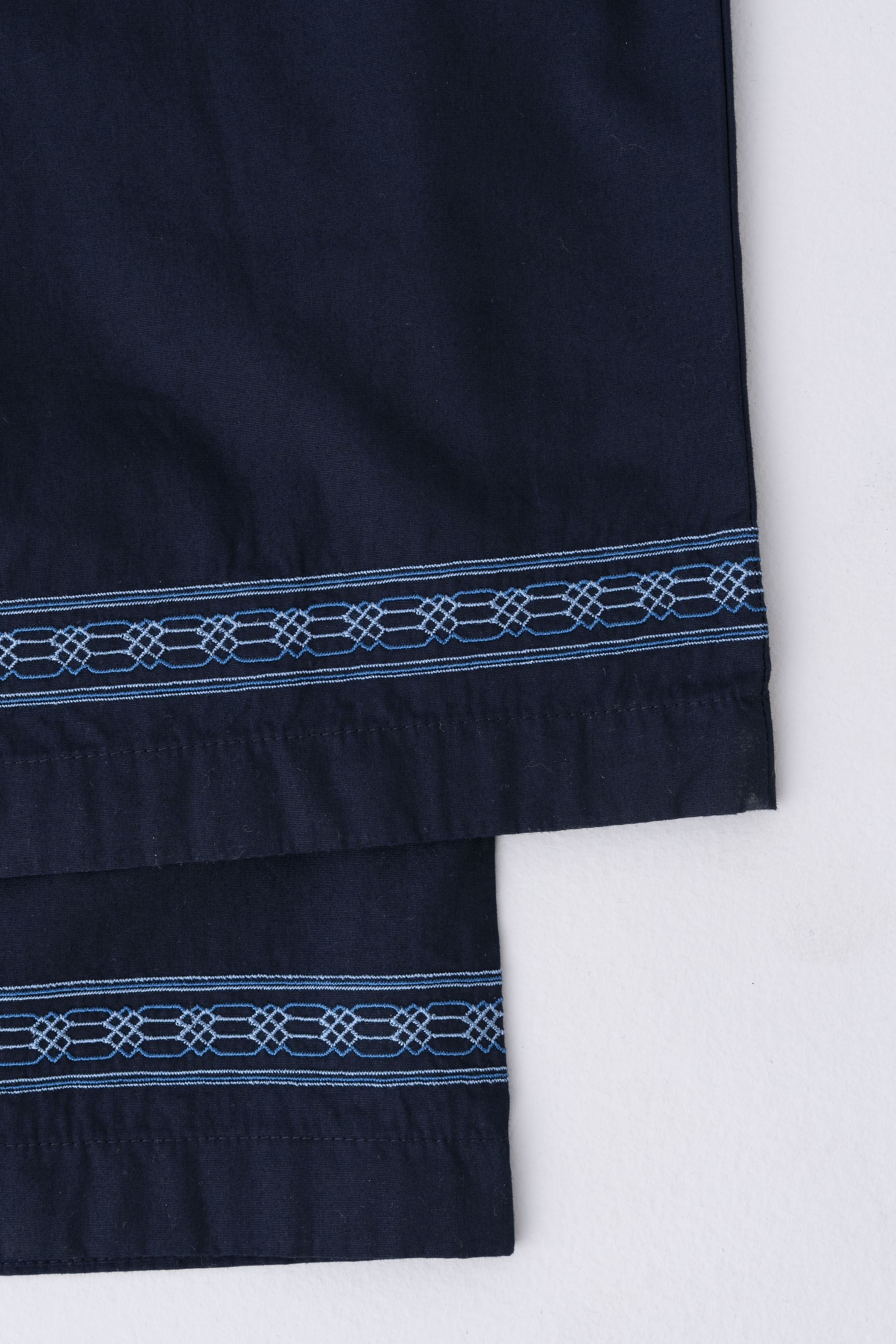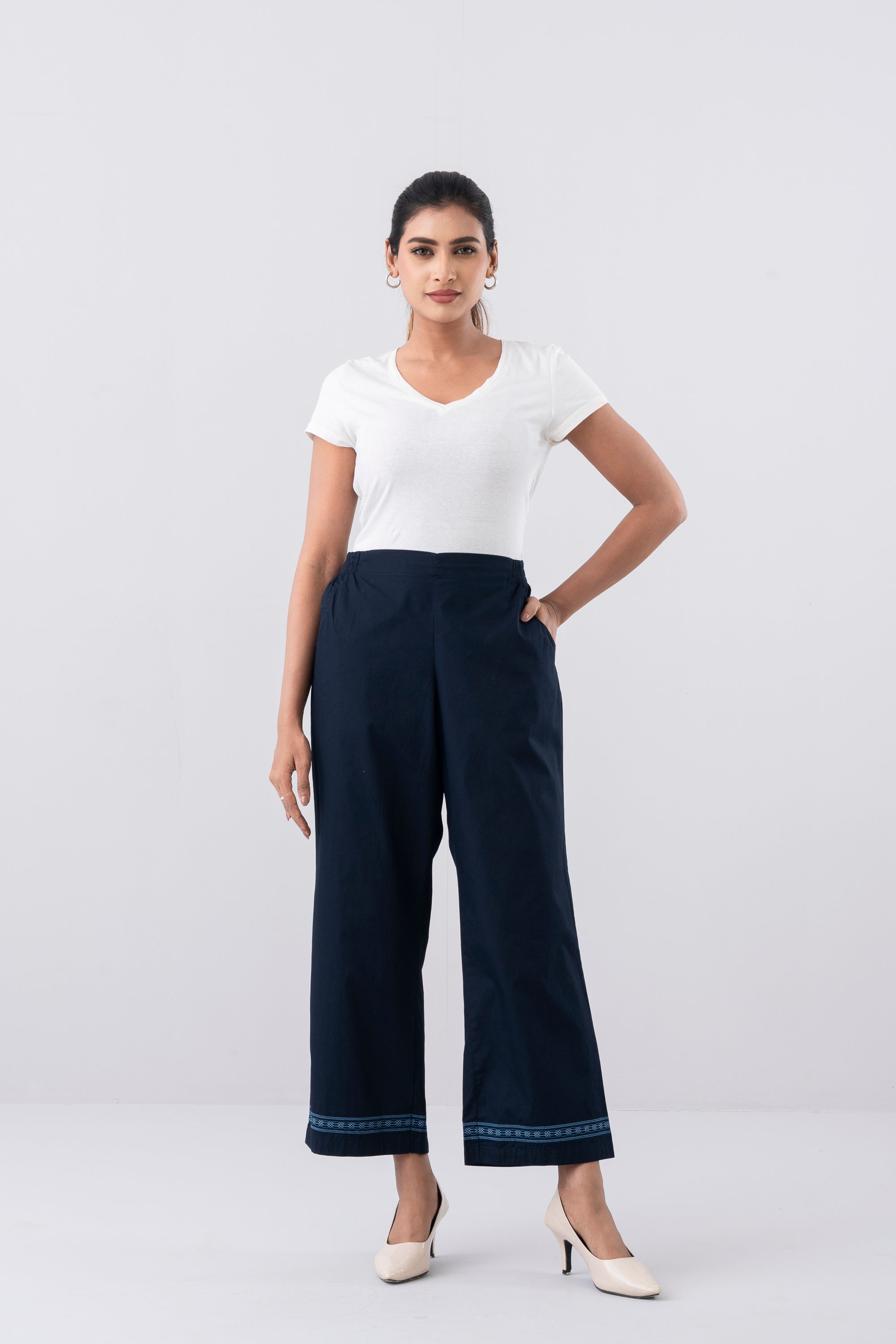 These straight-cut pants offer a blend of style and comfort, featuring a clean front waistband for a structured appearance and an elasticated back for a flexible, easy fit. The silhouette is relaxed yet refined, making it suitable for both casual and semi-formal wear. A delicate embroidery detail at the bottom hem adds a touch of elegance and craftsmanship, enhancing the overall look with subtle sophistication.