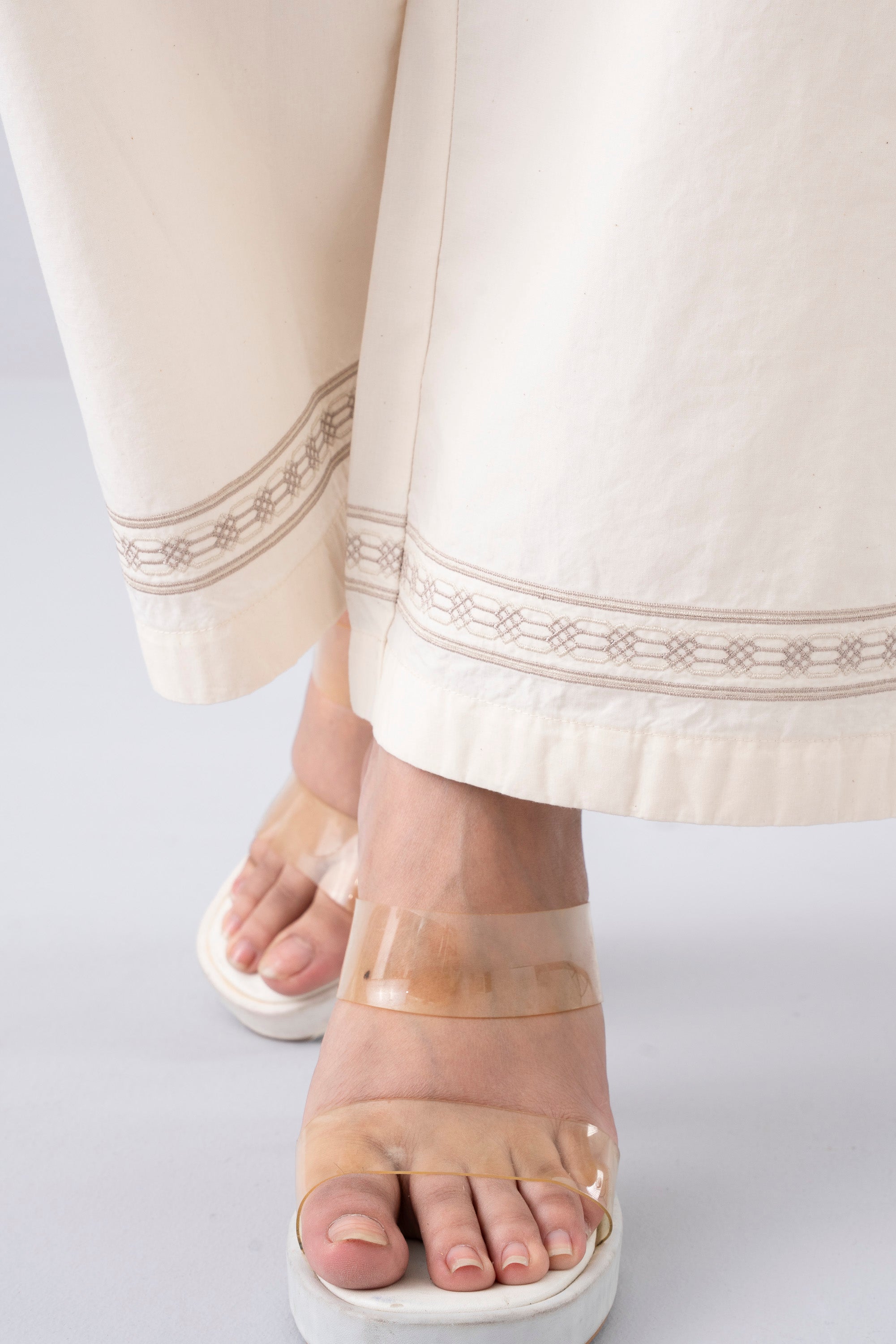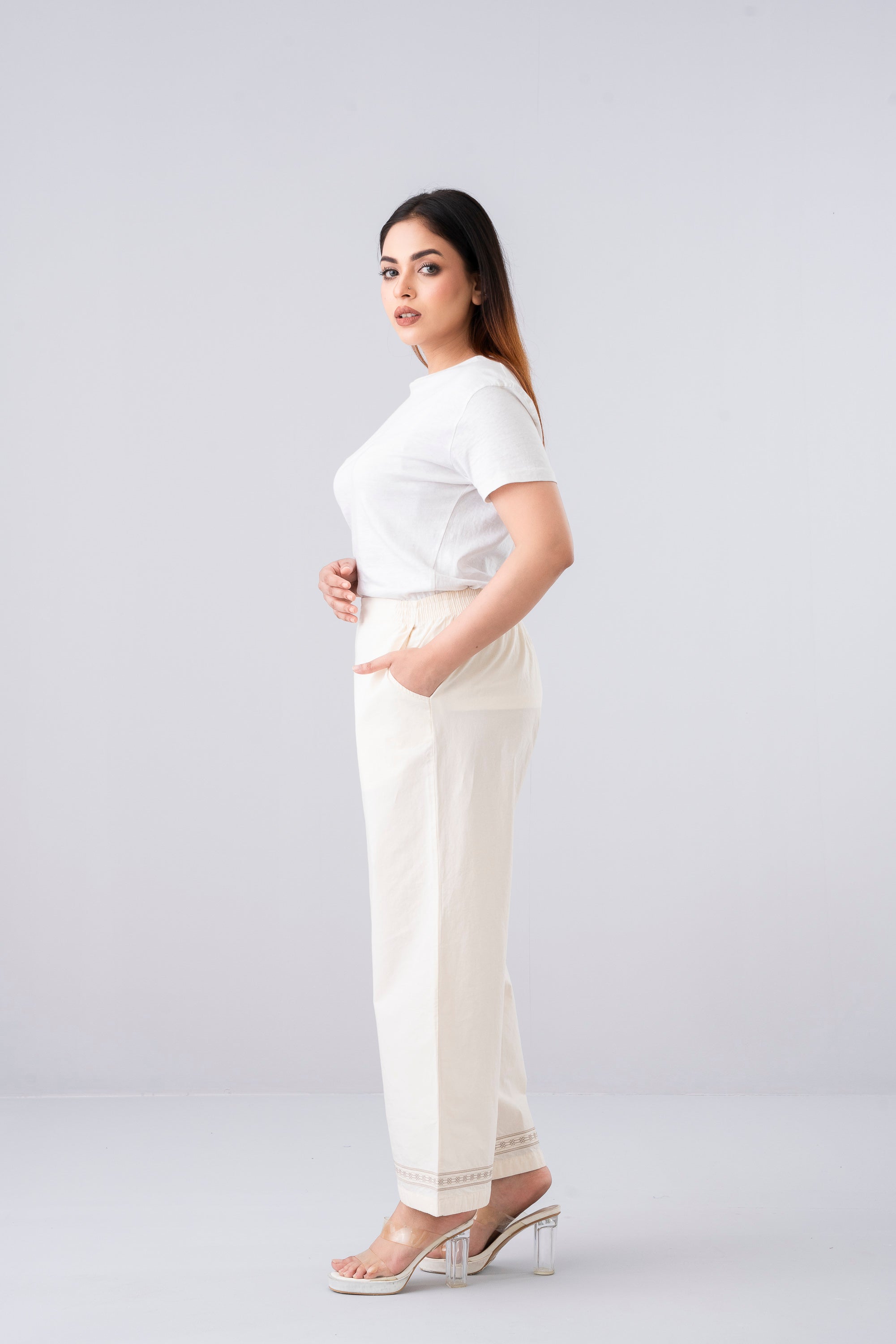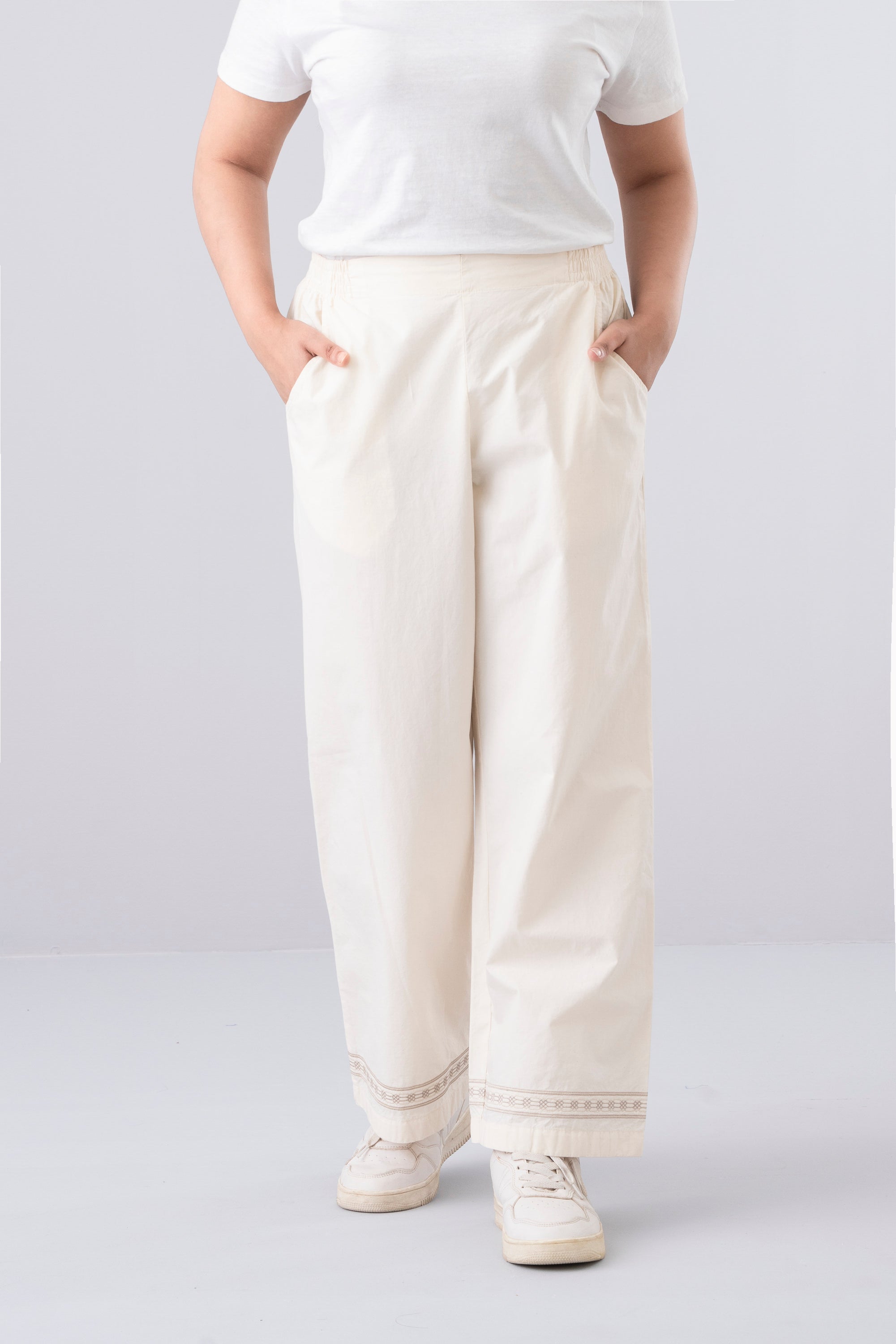 A stylish and comfortable piece designed for effortless wear. Crafted from soft, breathable fabric, it features delicate embroidery at the hem for a touch of elegance. The relaxed fit ensures easy movement, while the elasticated waistband at the back provides a secure and comfortable fit. Perfect for pairing with casual or dressy tops for a refined everyday look.