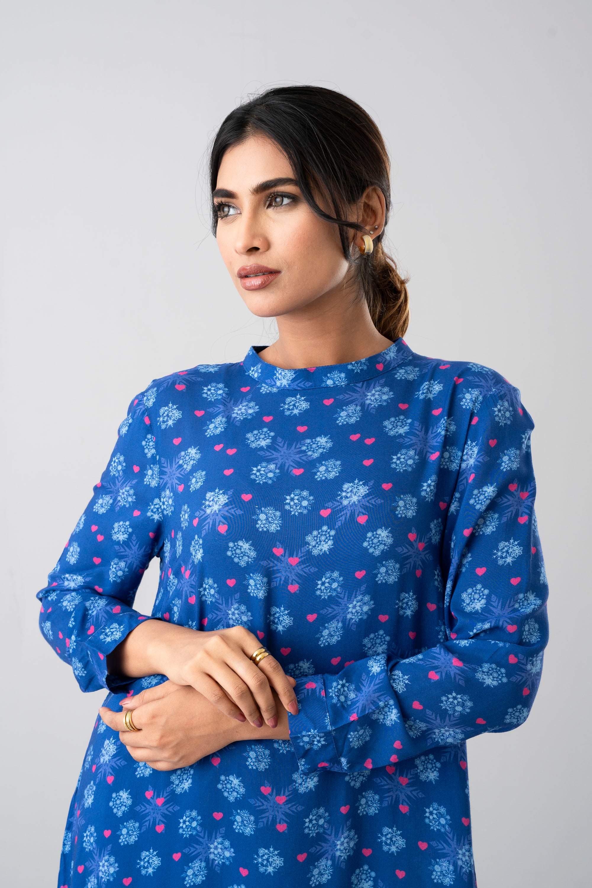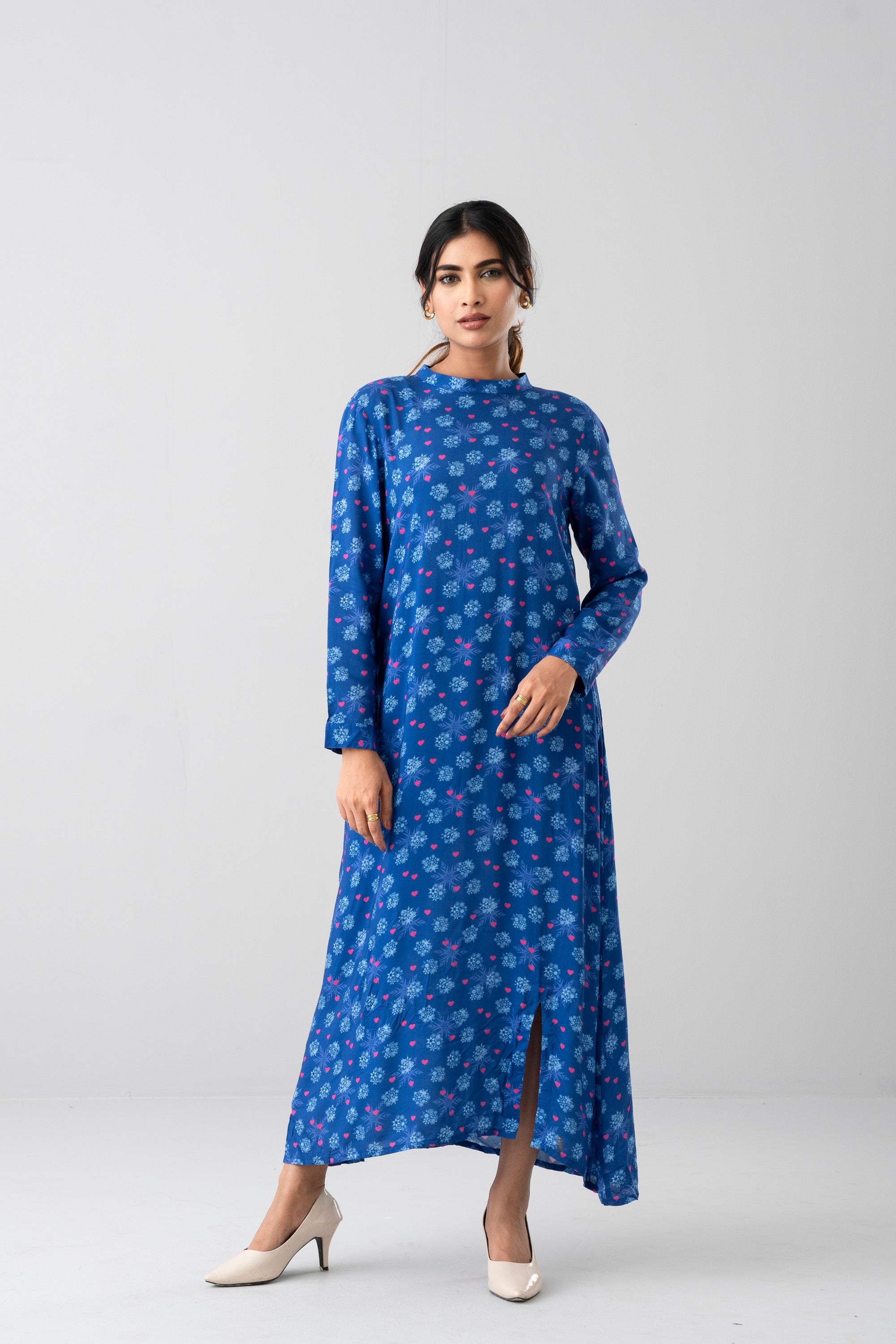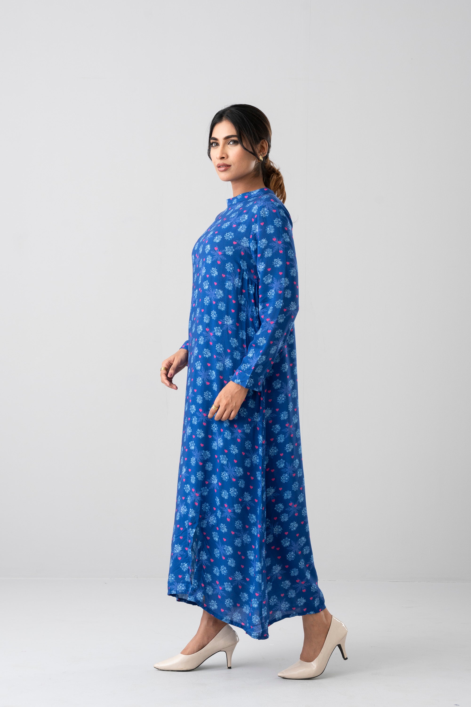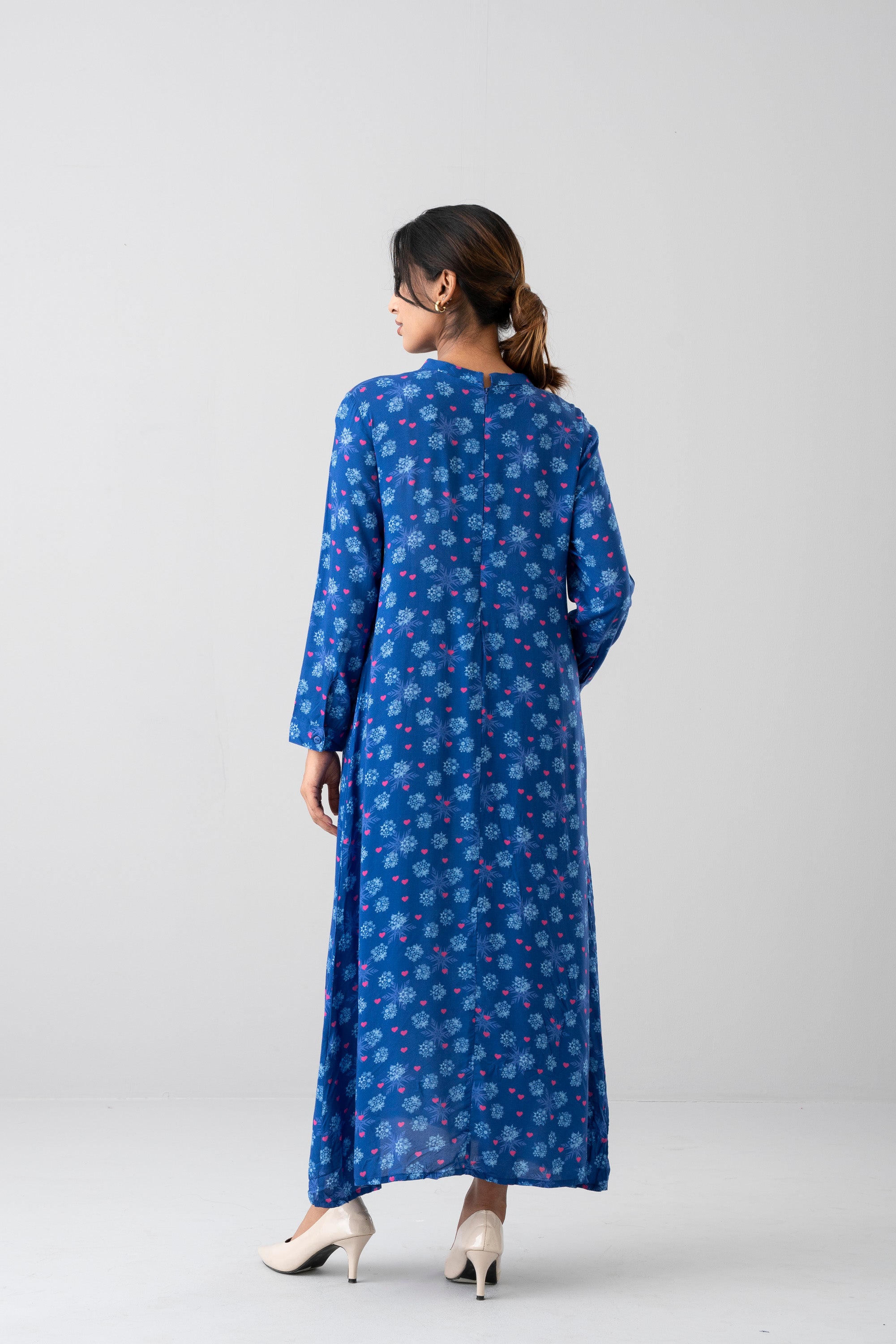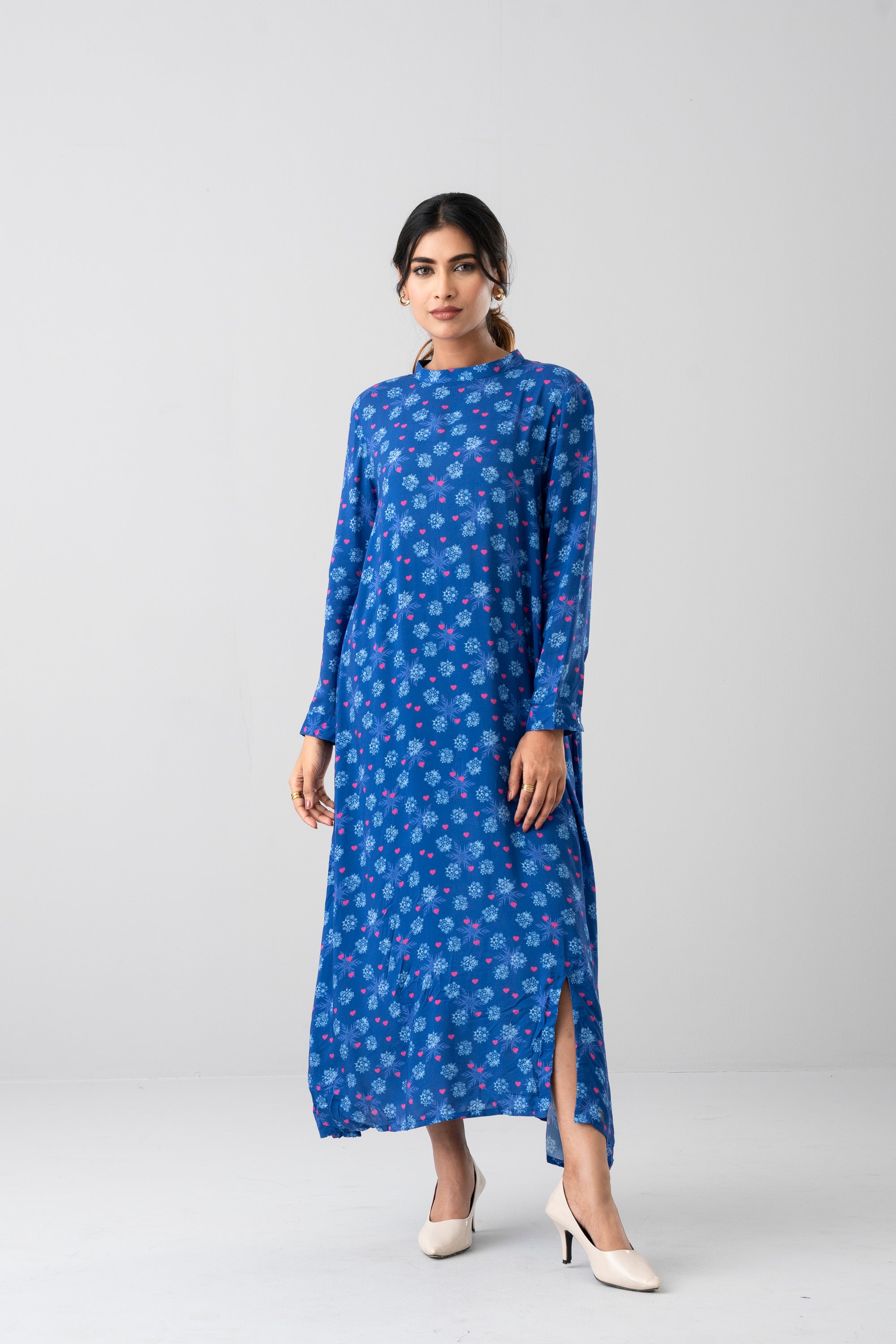 Effortlessly feminine and endlessly versatile, this ditsy printed Long Dress is adorned with all-over floral motifs and a vibrant touch of love symbol. Crafted from lightweight viscose, breathable fabric, it flows gracefully with every step. The longline silhouette elongates the figure with full sleeves and a gentle drape, creating a romantic fit. It has a hidden zip at front half closing. It’s the go-to piece that captures timeless beauty in every detail.