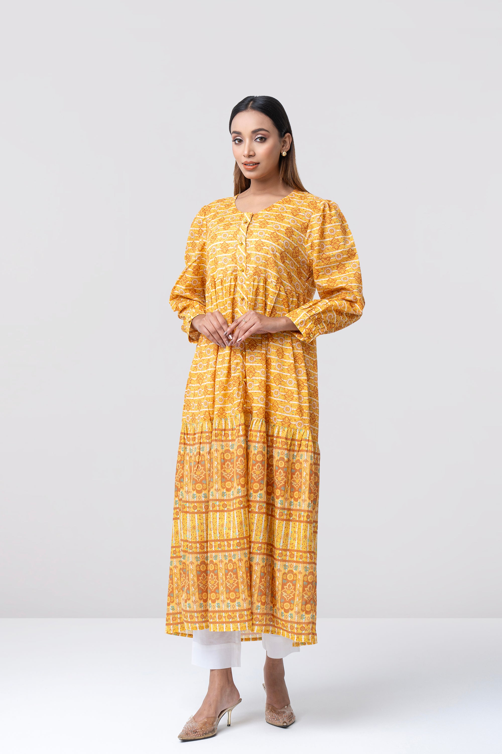 Women’s digital printed long dress features a graceful floral print with a flared layered silhouette that adds elegant movement. The border design at lower panel enhances its refined look, while full sleeves with cuff details provide a polished finish. Dome button accents complete the design with a touch of sophistication.