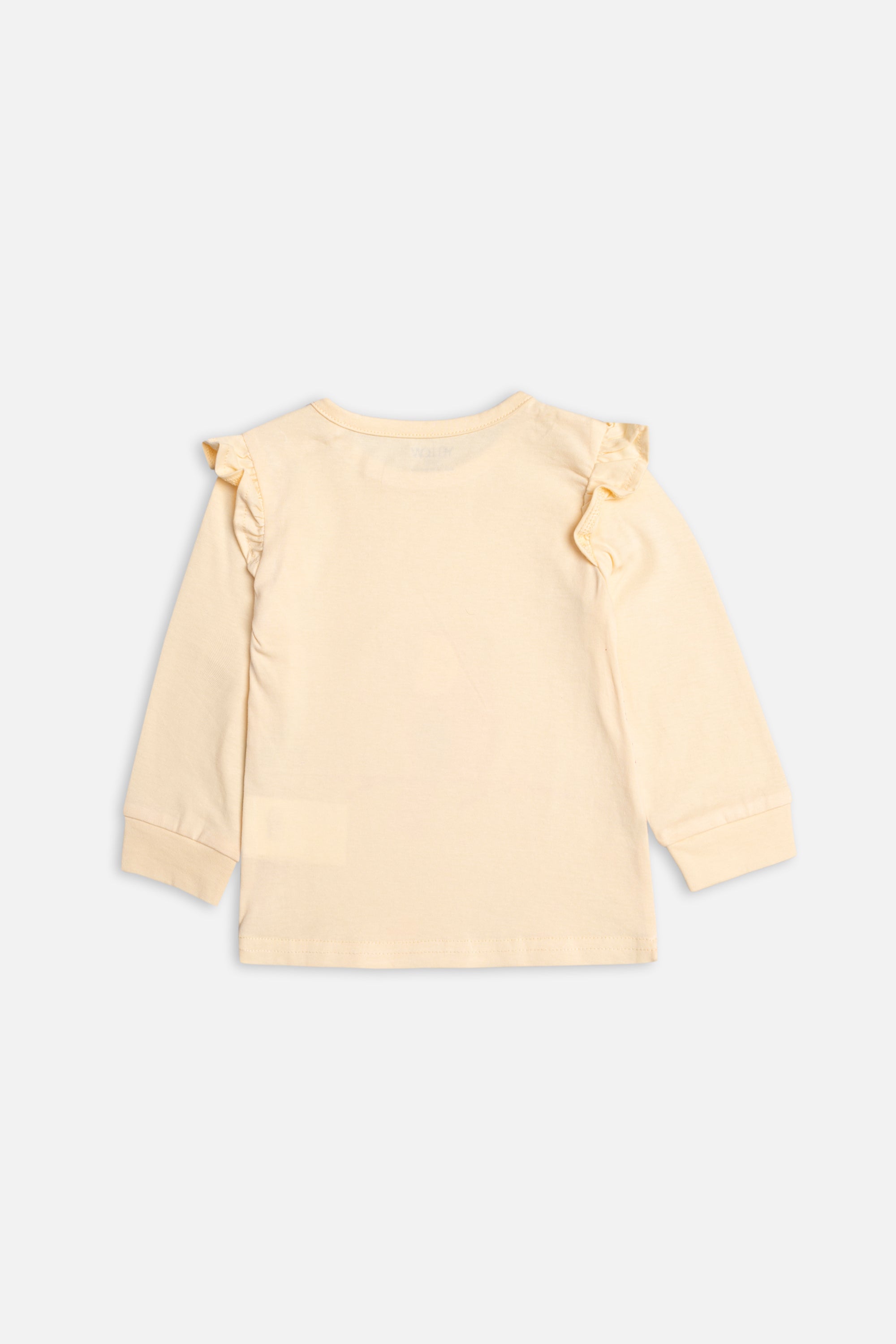• Single jersey baby girl fullsleeve t- shirt with sholder frill, print and contrast neck binding.