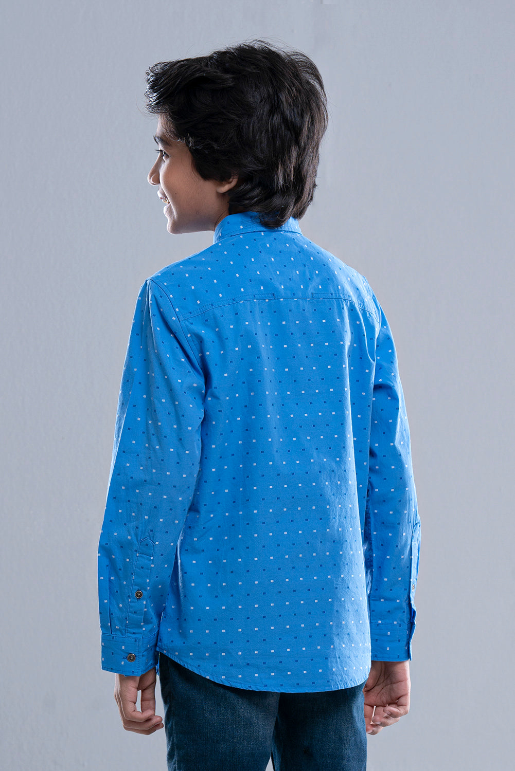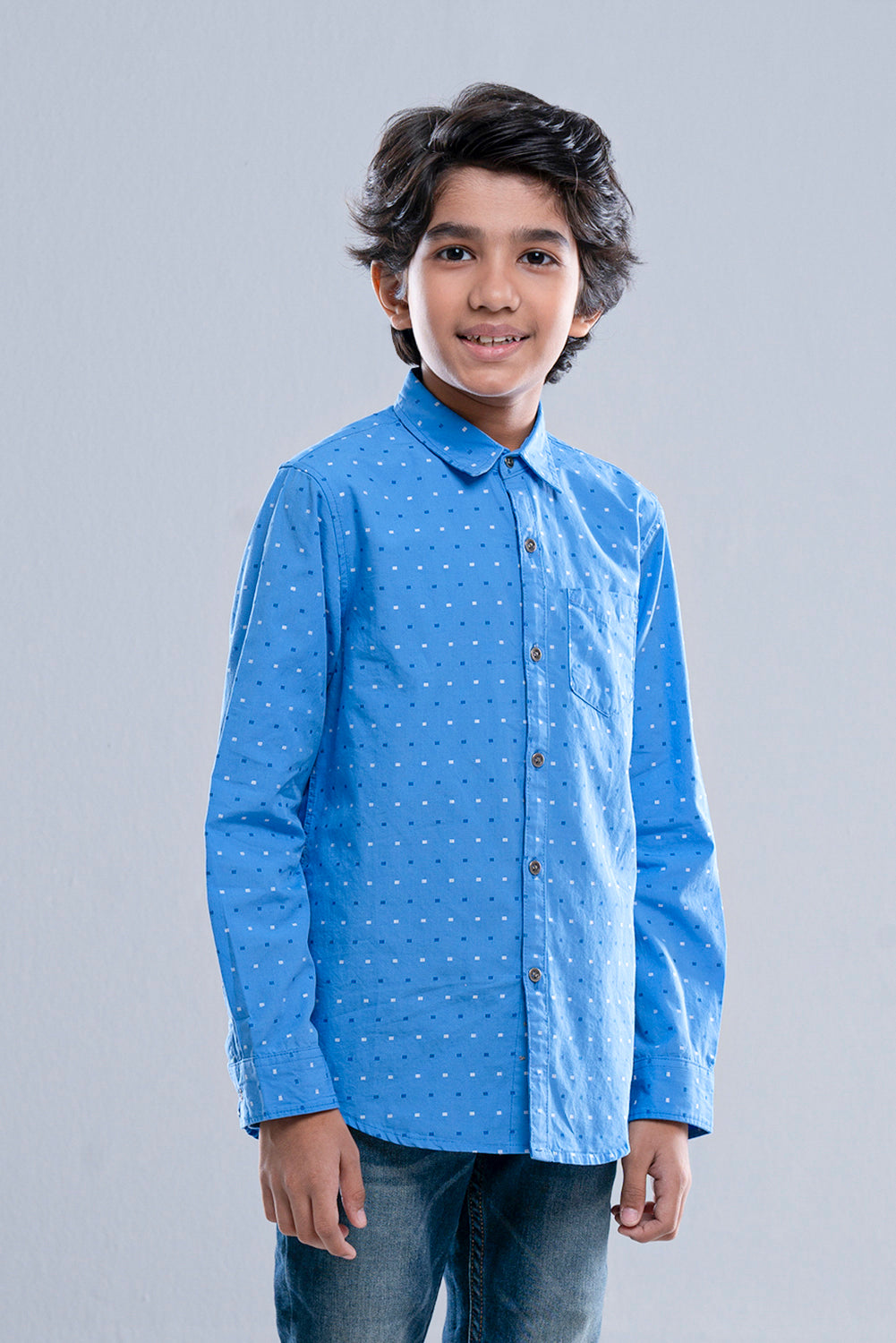 • Light blue fabric with a subtle, all-over pattern of small white geometric shapes.
