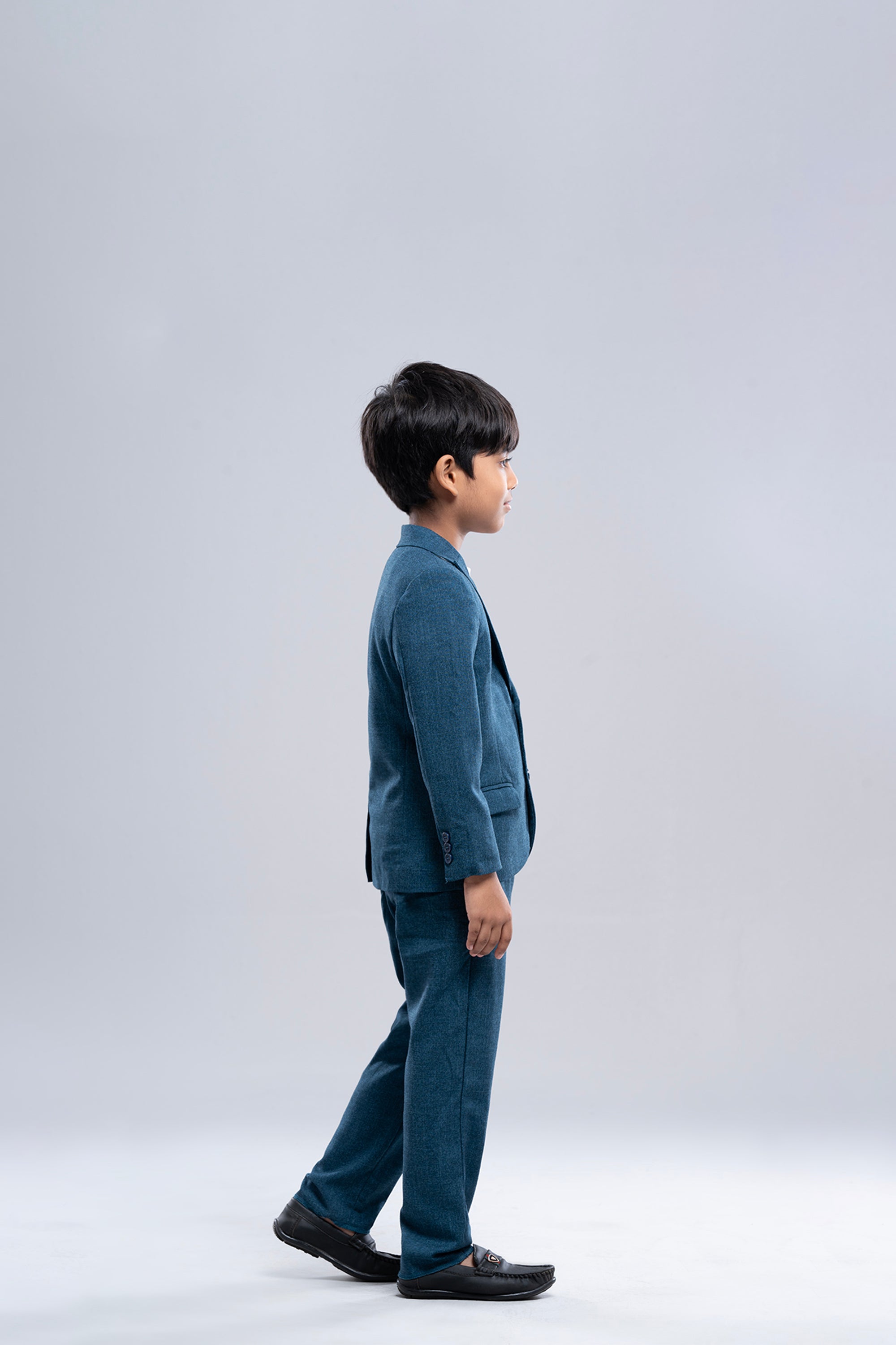 • This sophisticated boy's suit set features a tailored blue blazer and matching trousers.