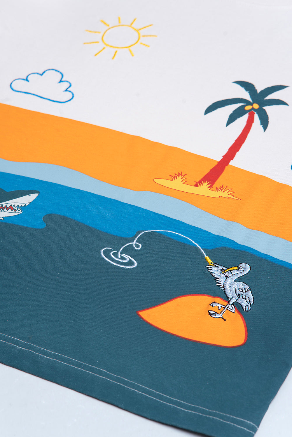• Features a fun seaside scene in a unique mix of print and embroidery
