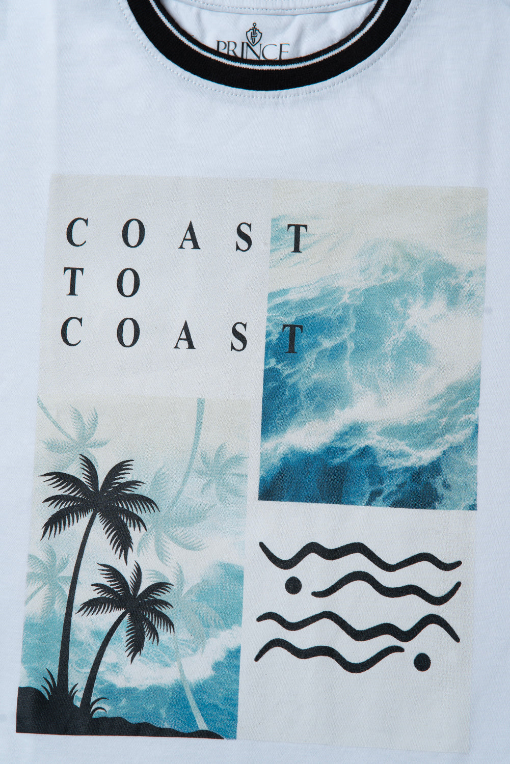 • Featuring a striking "Coast to Coast" graphic with tropical palm trees, ocean waves, and dynamic blue prints, this tee captures the perfect summer spirit.