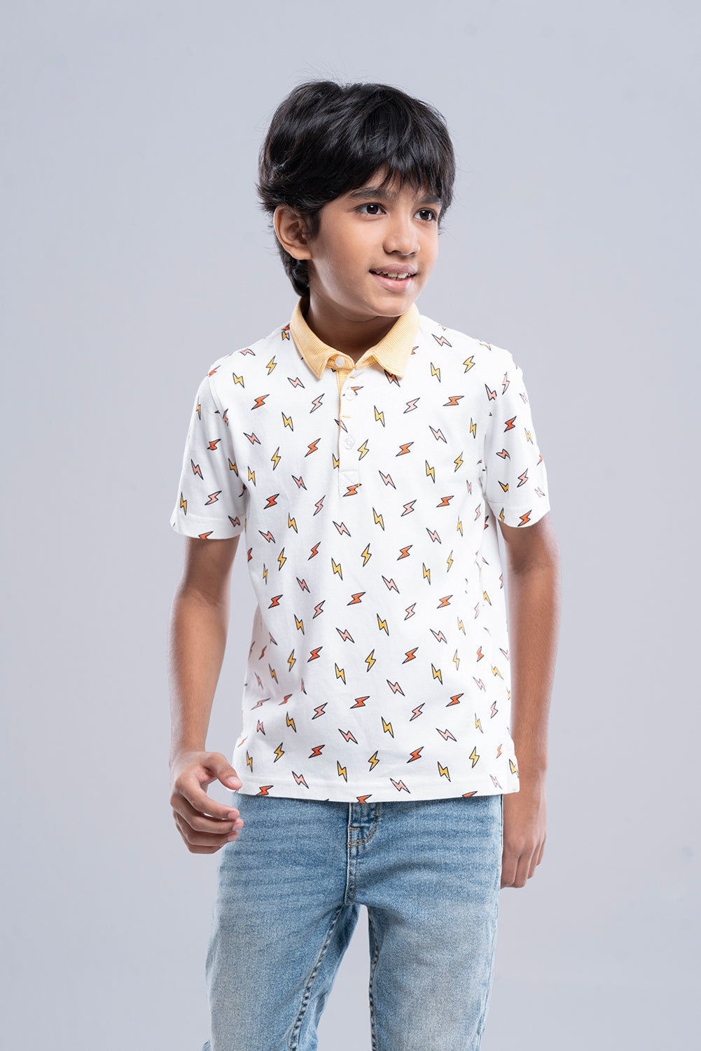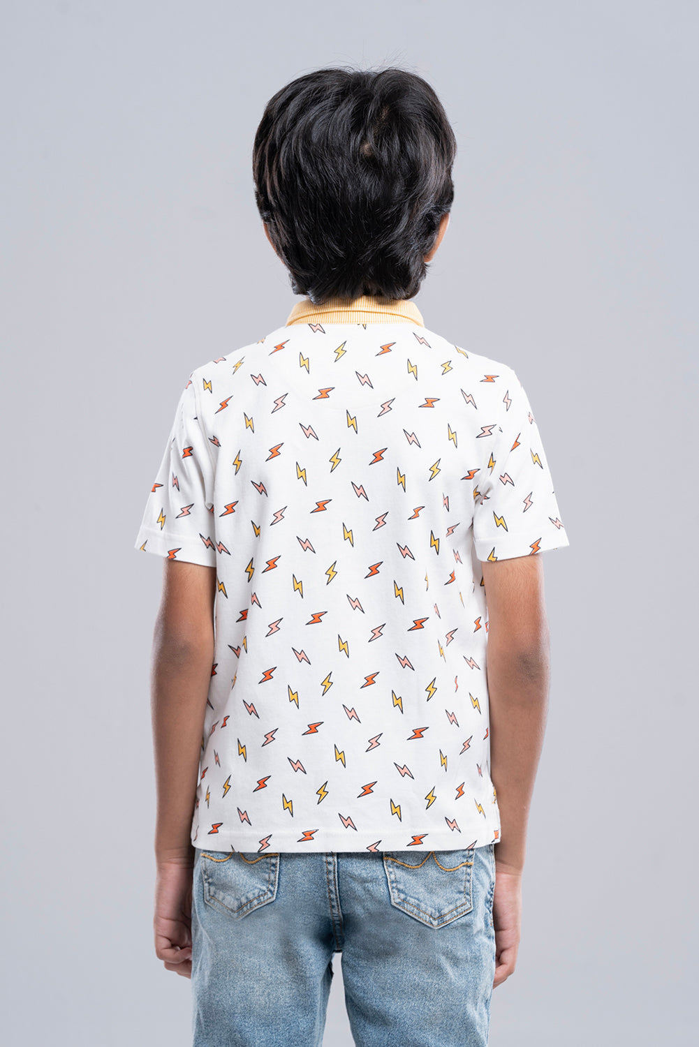 Thunderbolt Digital Print 100% cotton interlock Polo. Give their casual look a lift with this airplane-print polo. The mini print design and contrast collar add a neat, modern touch perfect for school or weekend wear.