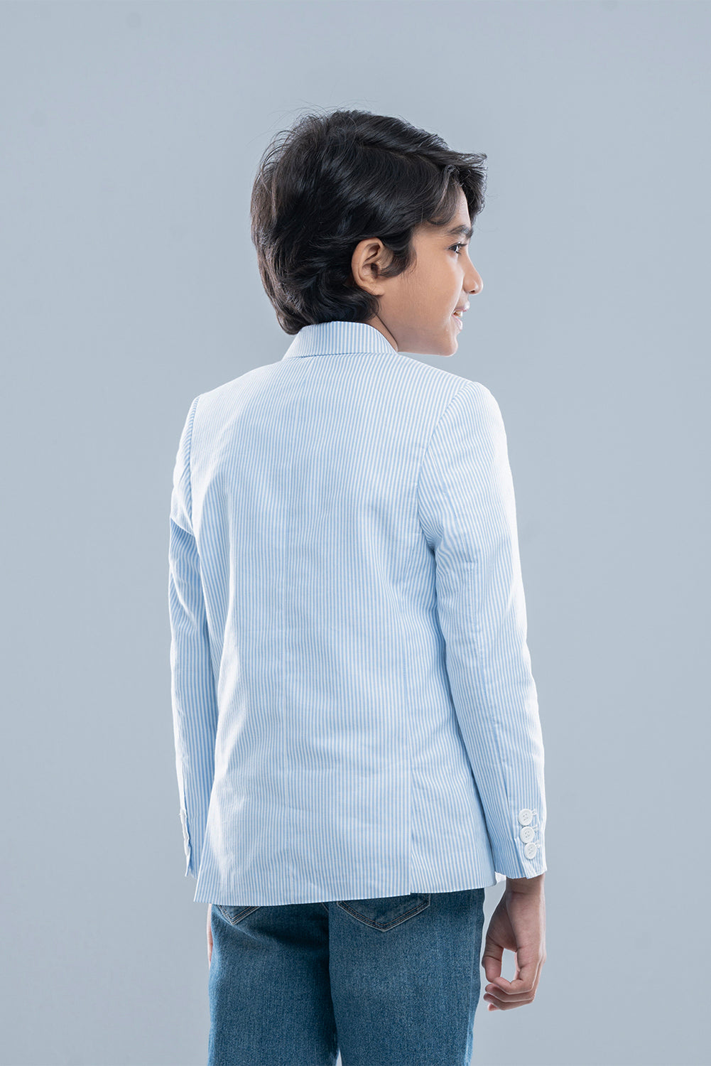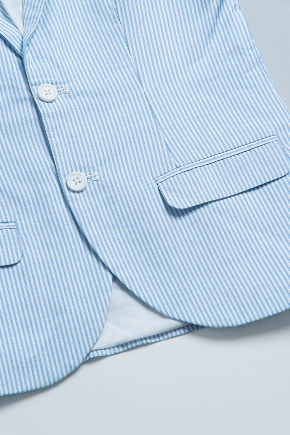 • It is a single-breasted design in a light blue and white vertical stripe pattern.