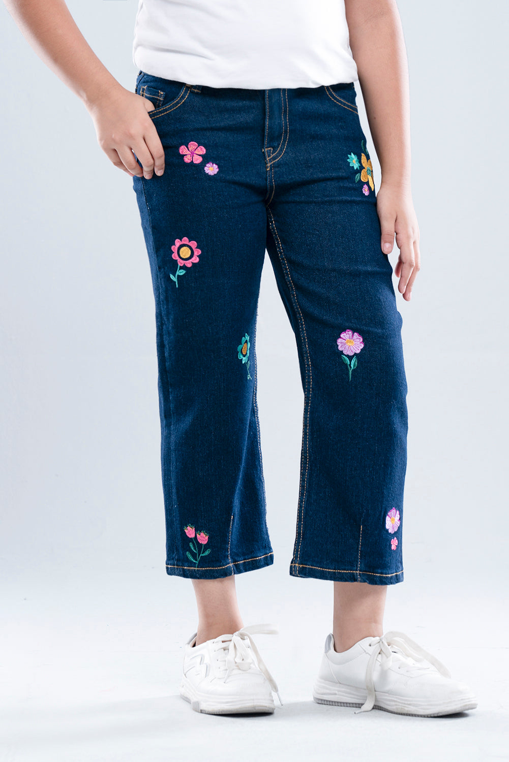 • Girls Denim with vibrant multicoloured floral embroidery on the legs.