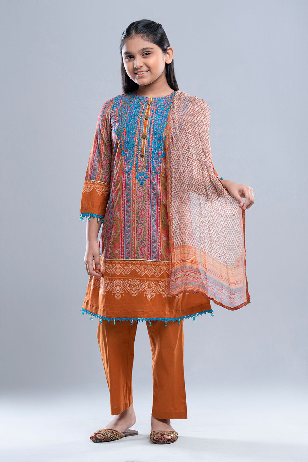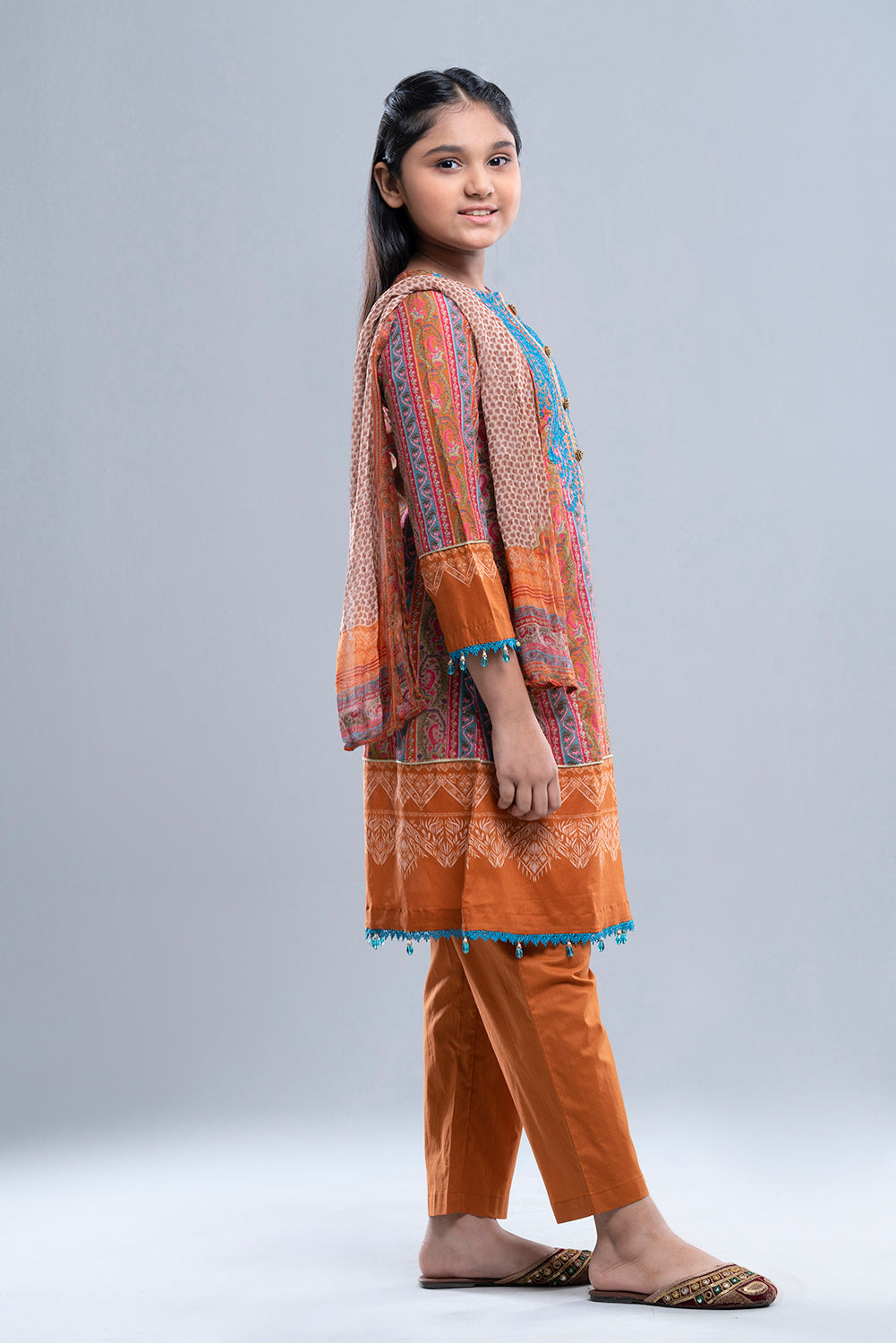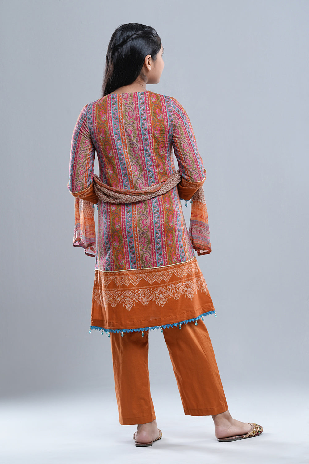 • Styled in a flared A-line silhouette with matching trousers and dupatta.