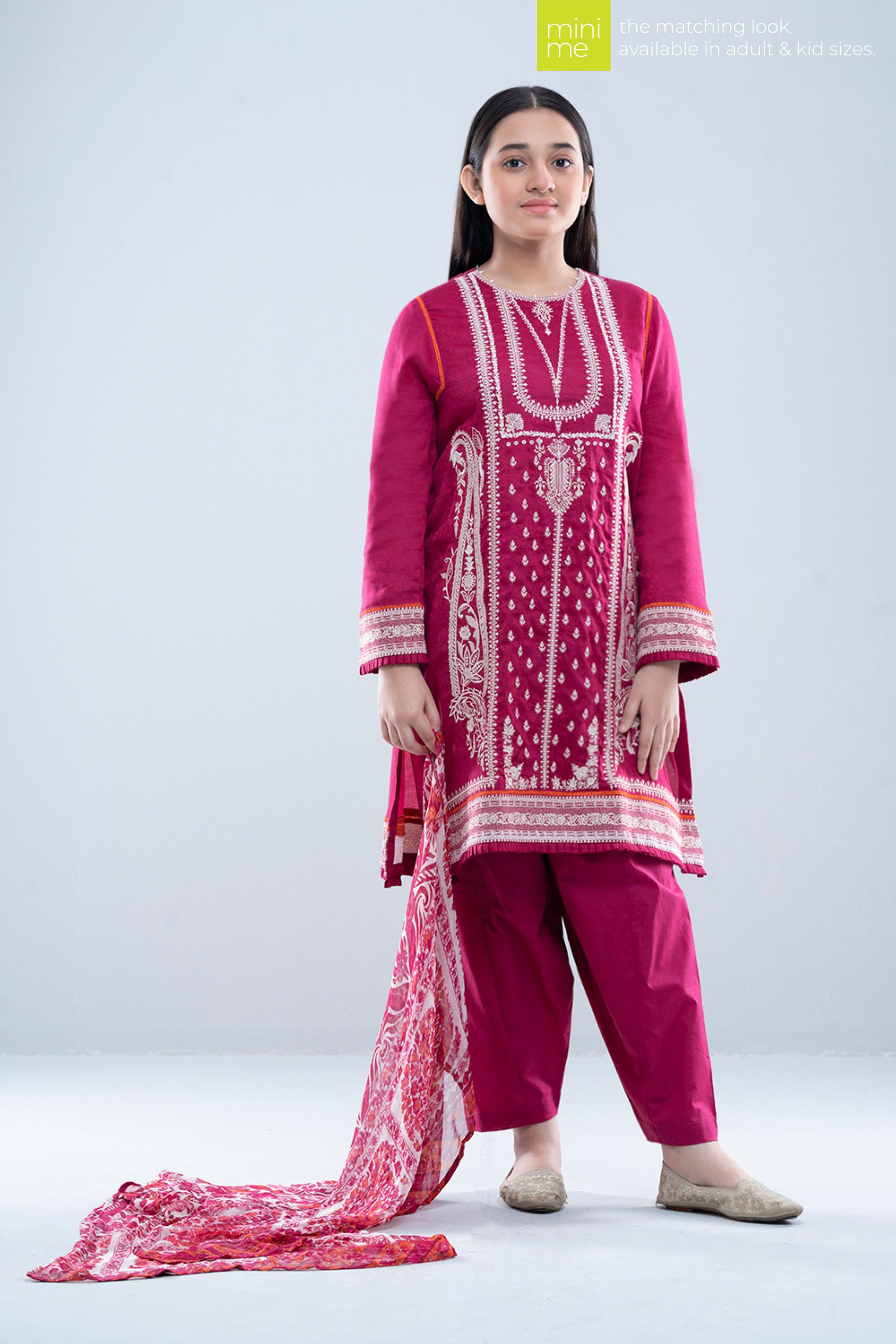 Stunning ready-to-wear 3-Piece Lawn Jacquard Salwar Kameez Suit, beautifully adorned with full front embroidery and delicate decorative lace. Designed with full sleeves featuring self-fabric pleats and an embroidered border, and tailored in a relaxed fit with a square armhole, the kameez is finished with a gracefully embellished neckline with pearl accents. Paired with a solid dyed salwar and an elegant chiffon dupatta, this ensemble is perfect for festive occasions or for adding timeless sophistication to your everyday wardrobe.