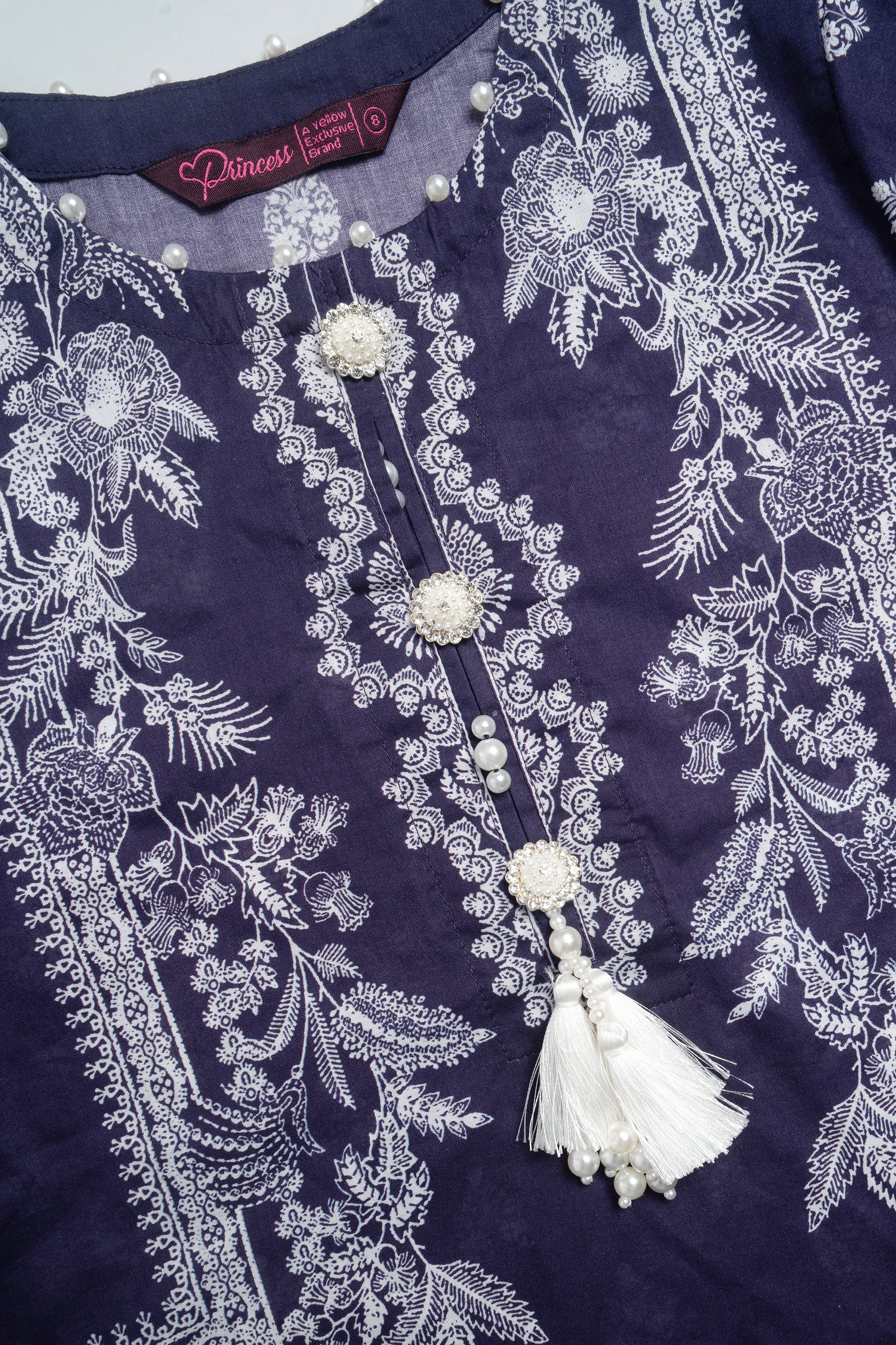 Elevate your elegance with our stunning ready-to-wear 3 Piece Lawn Salwar Kameez Suit with chiffon dupatta and solid dyed trouser embellished with decorative buttons, tassel, lace and pearls detailing that exudes elegance and sophistication, perfect for special occasions or adds luxury to your everyday wardrobe.