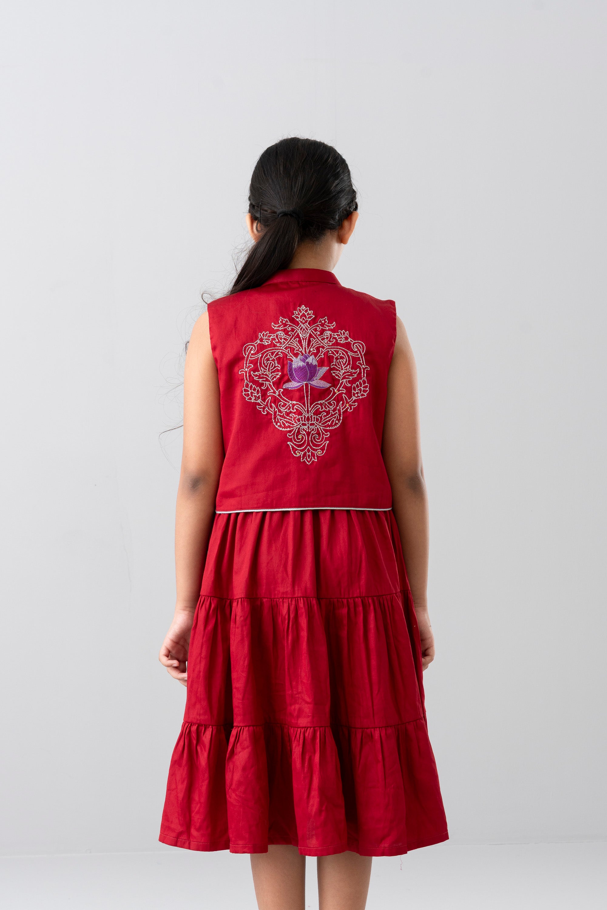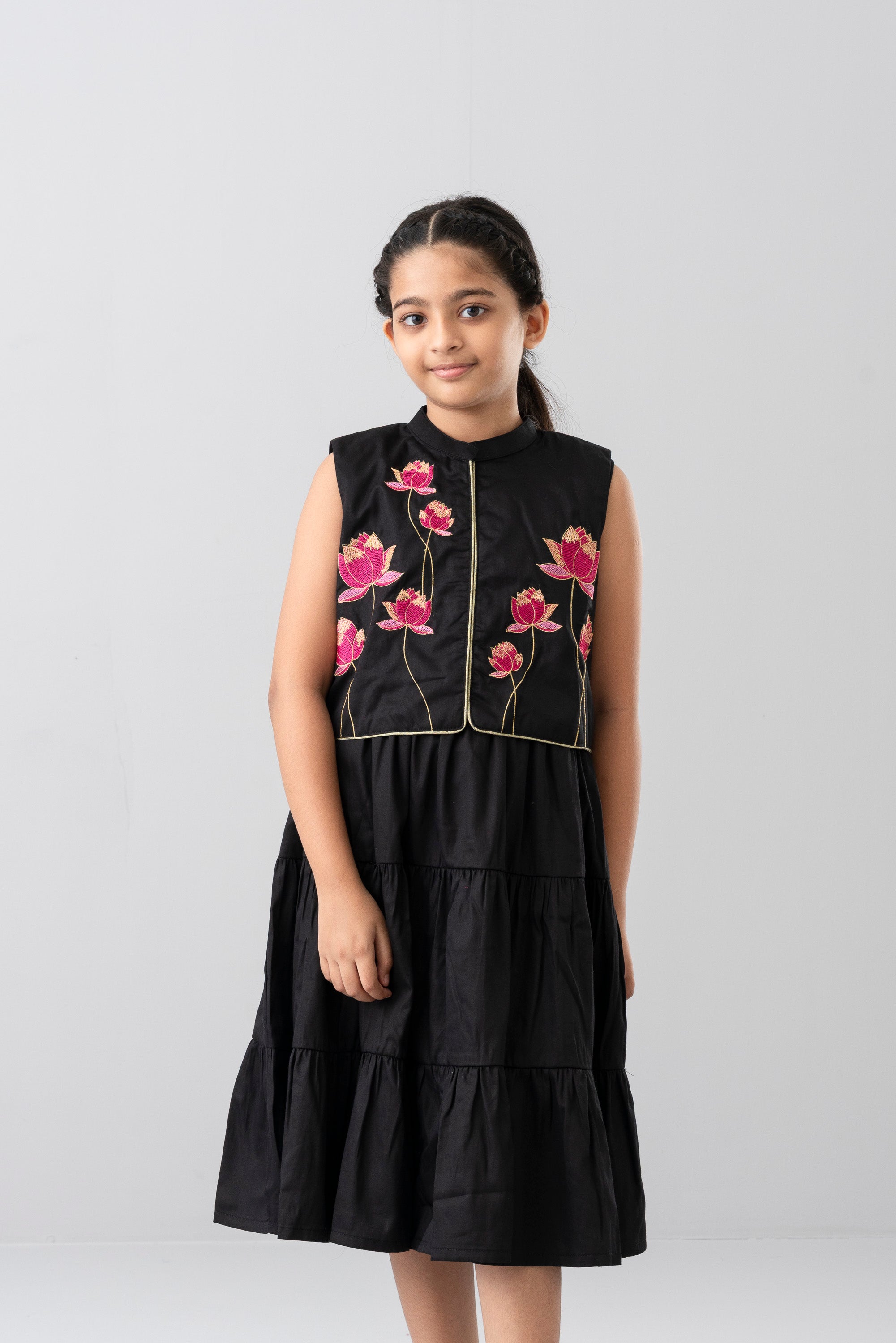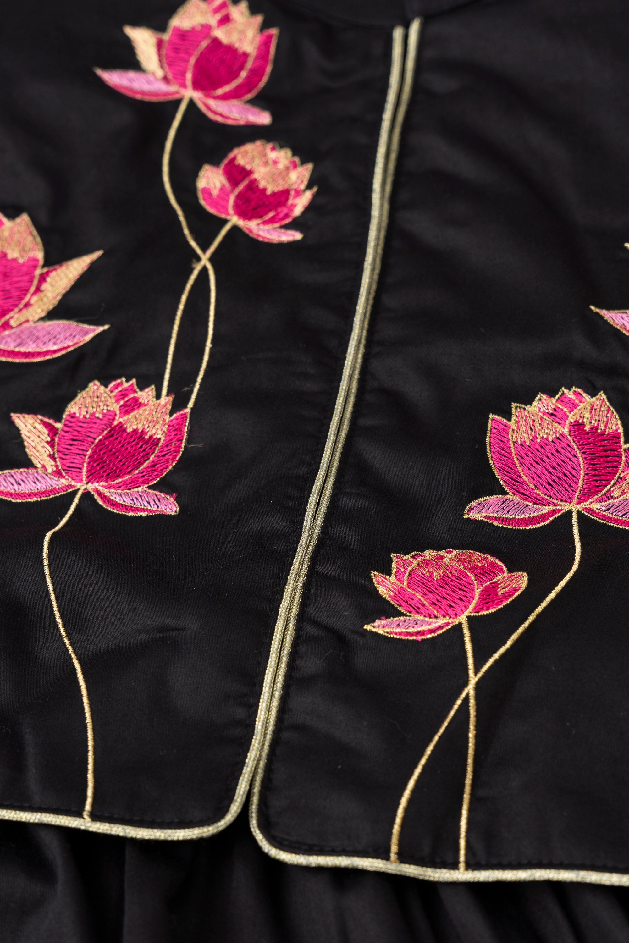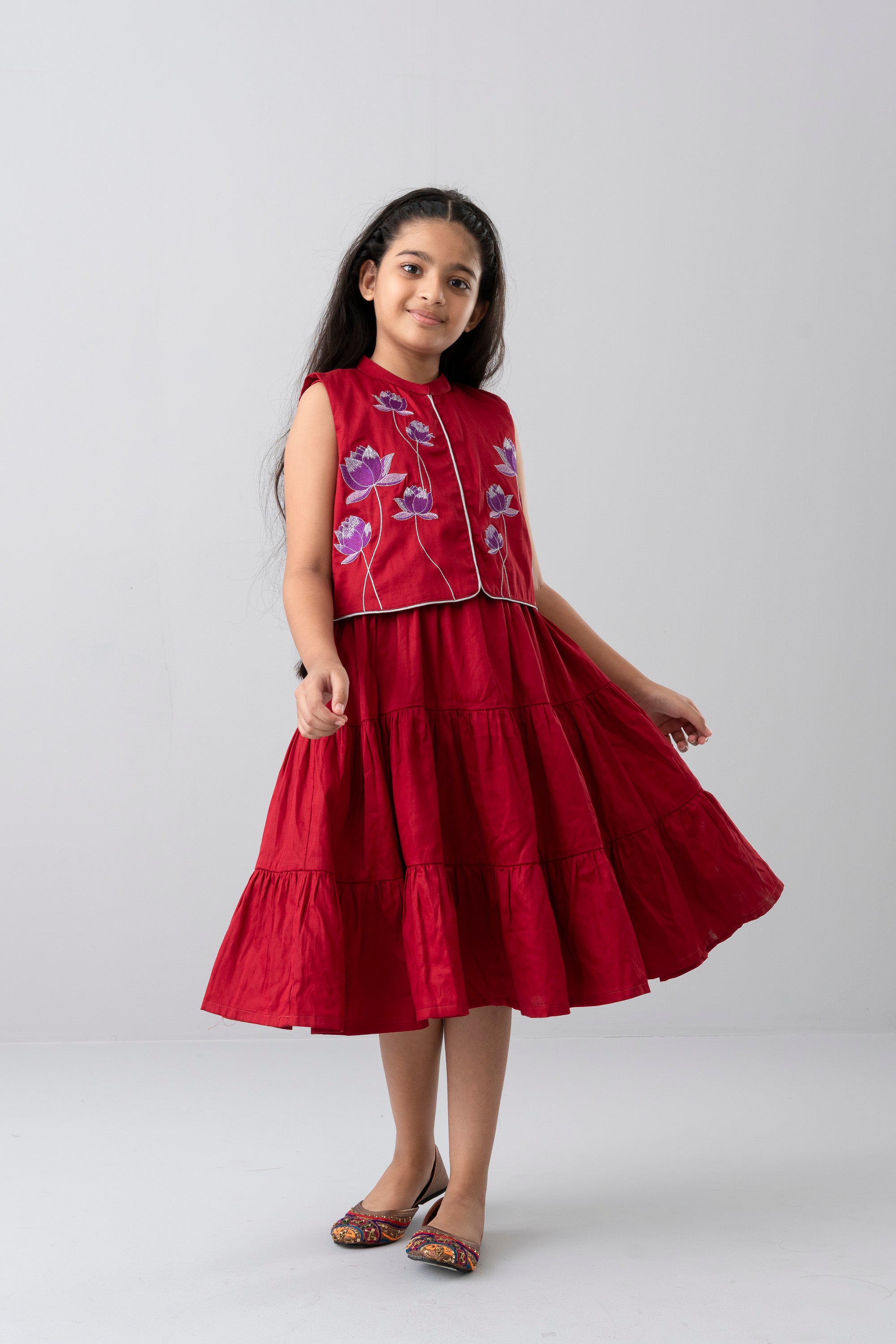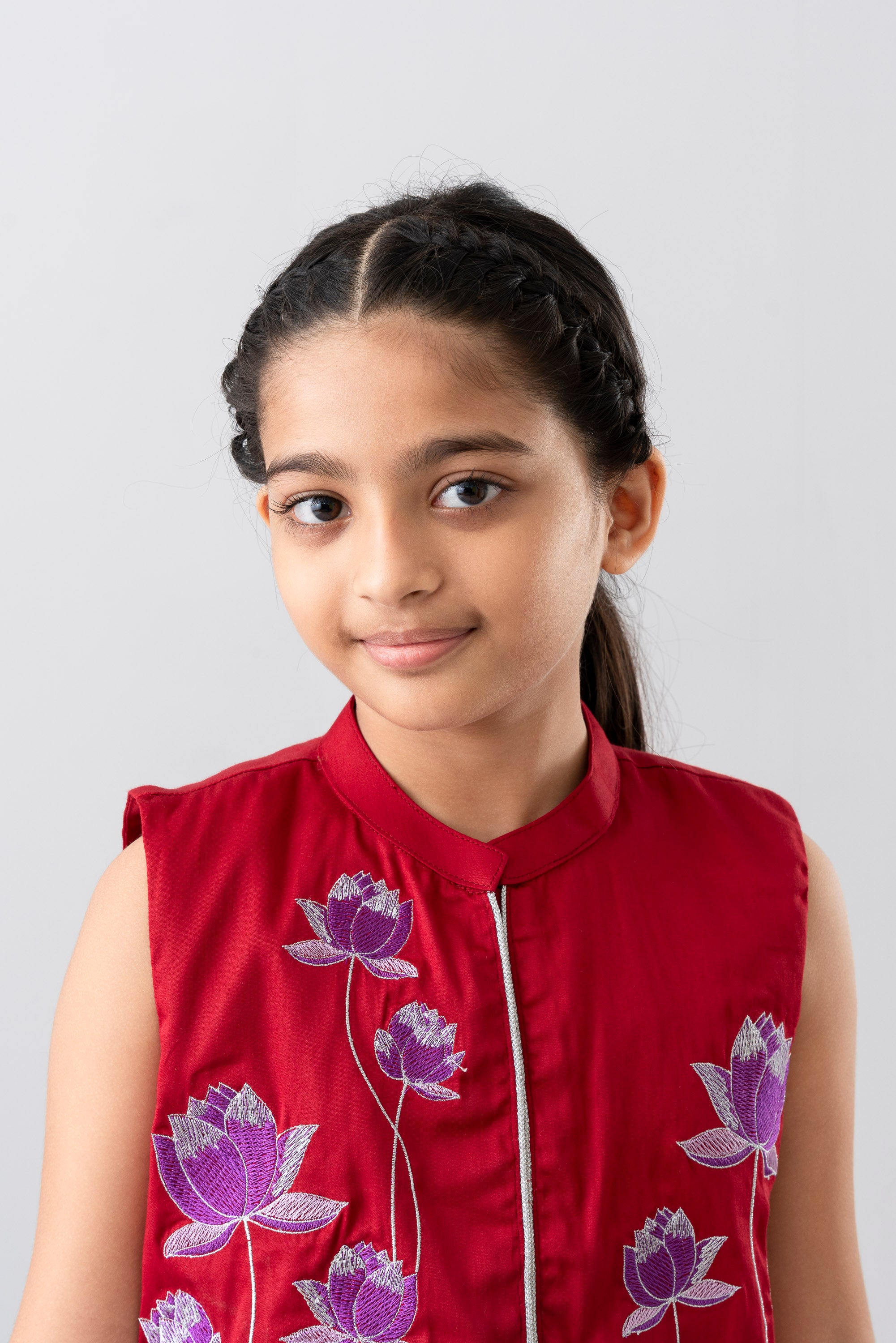 • Embroidered floral motifs (purple-pink flowers) on the front yoke