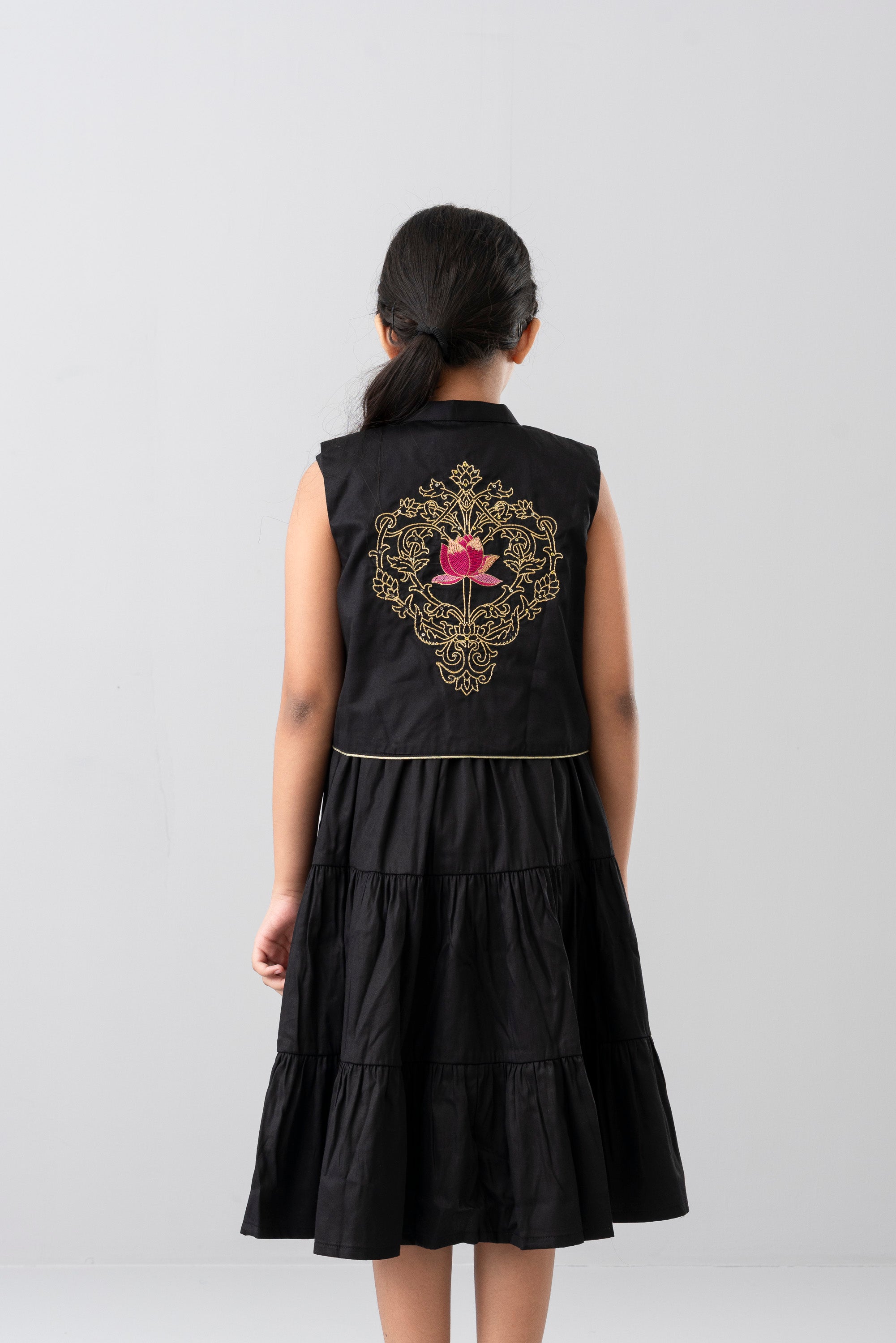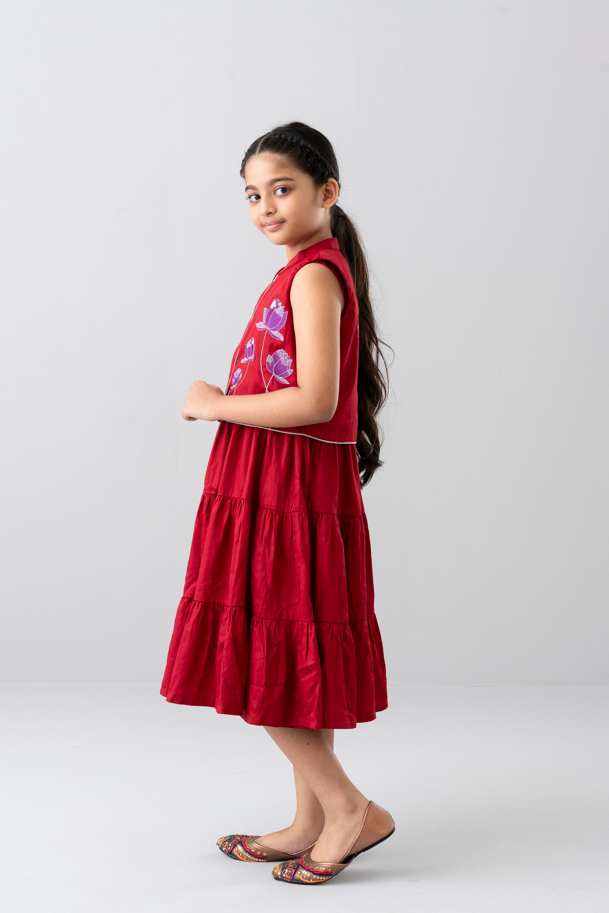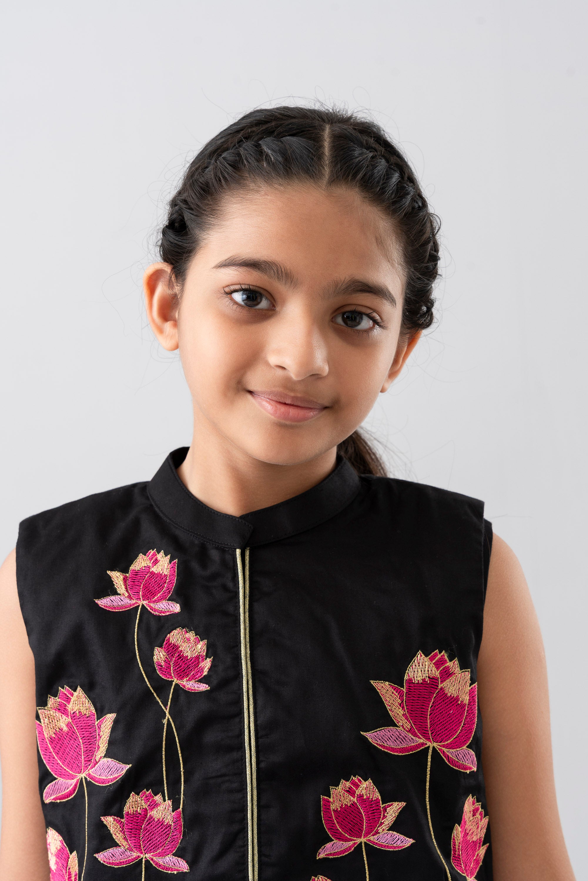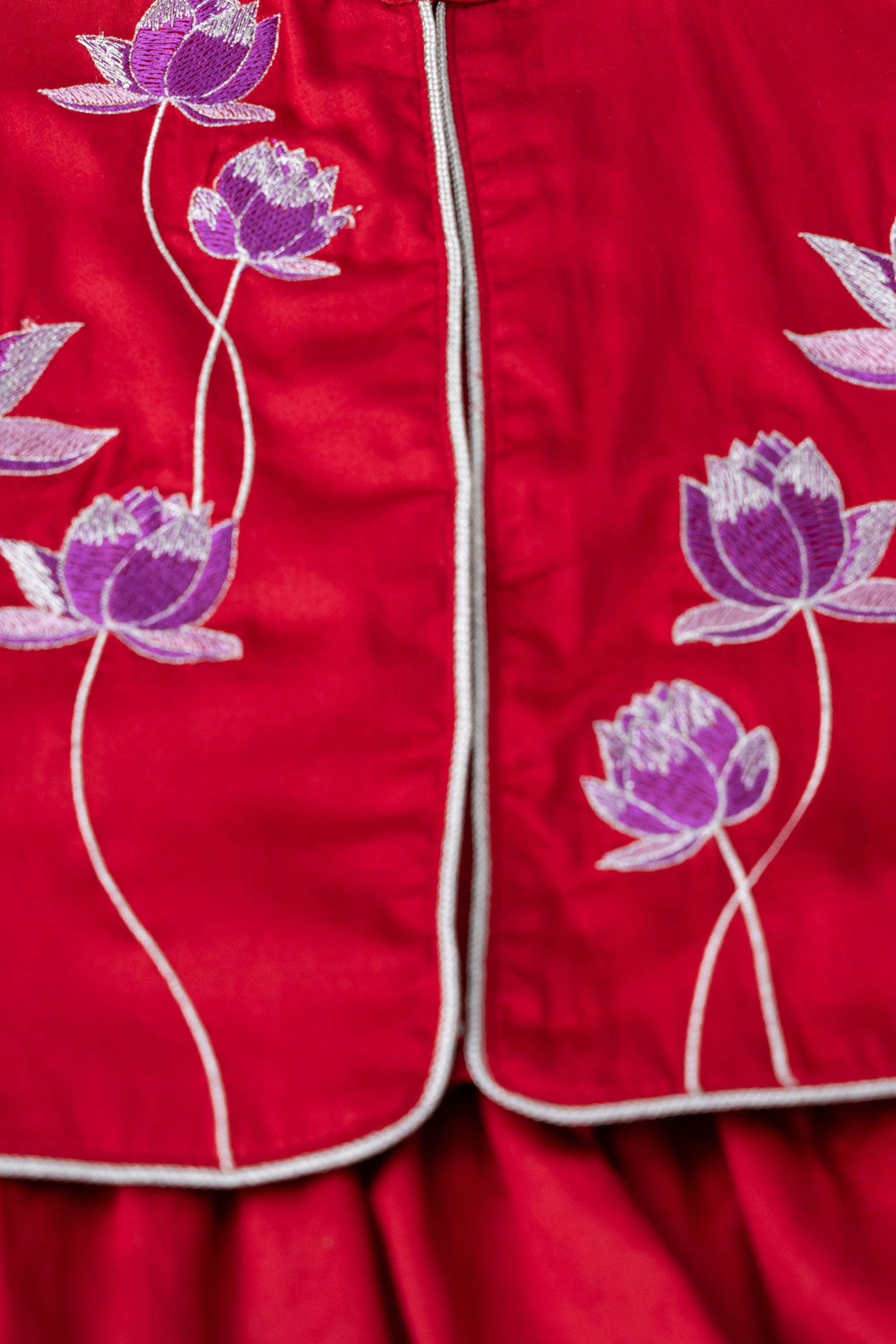 • Embroidered floral motifs (purple-pink flowers) on the front yoke