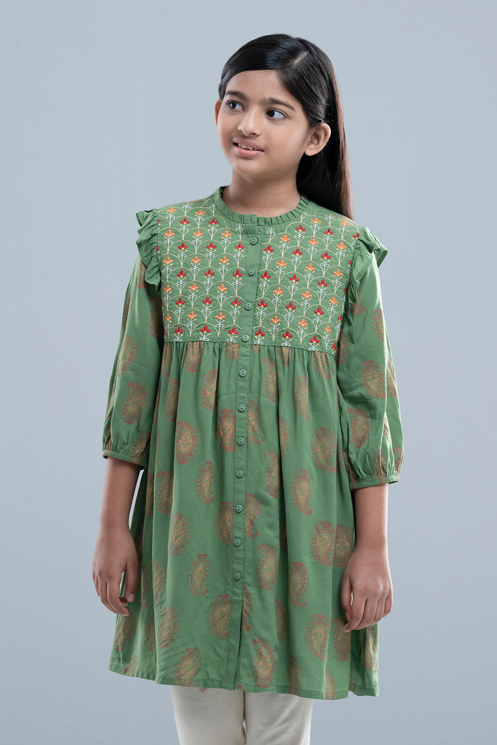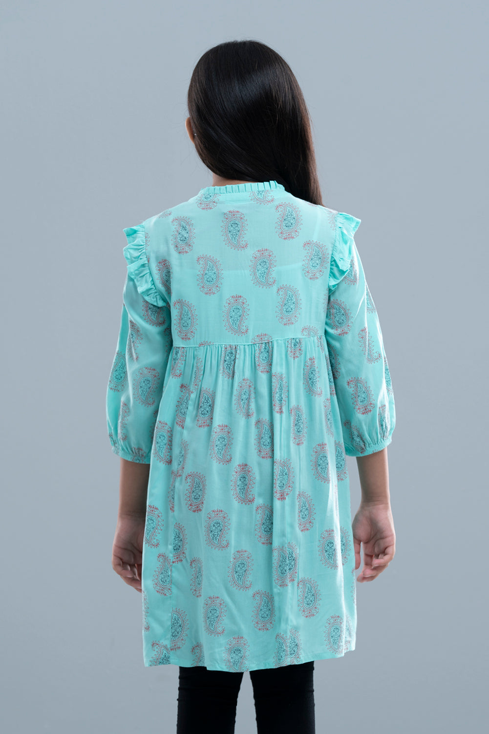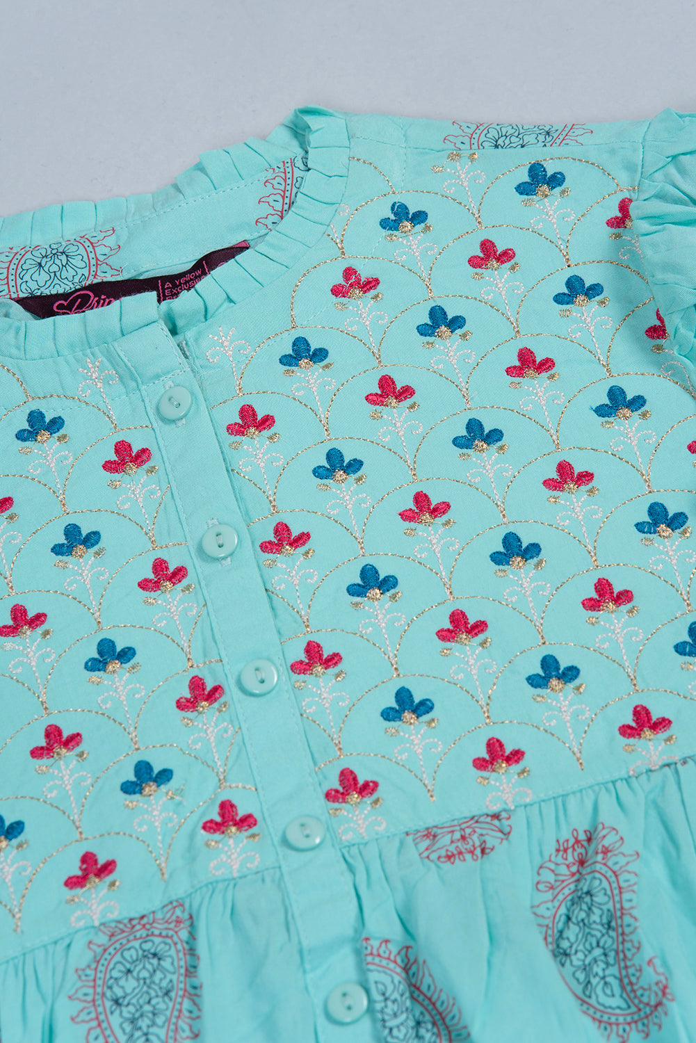 Fresh aqua blue & Avocado Green dress with delicate paisley prints and a beautifully embroidered yoke. Designed with ruffle detailing on the shoulders, button-down front, and 3/4 sleeves for a charming, easy-to-wear look.