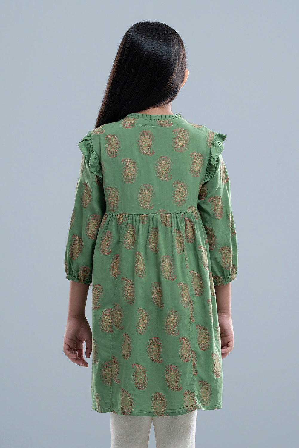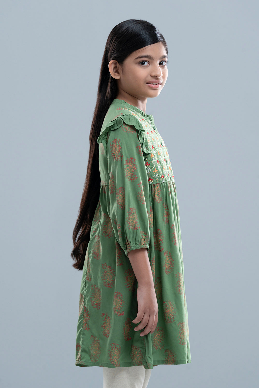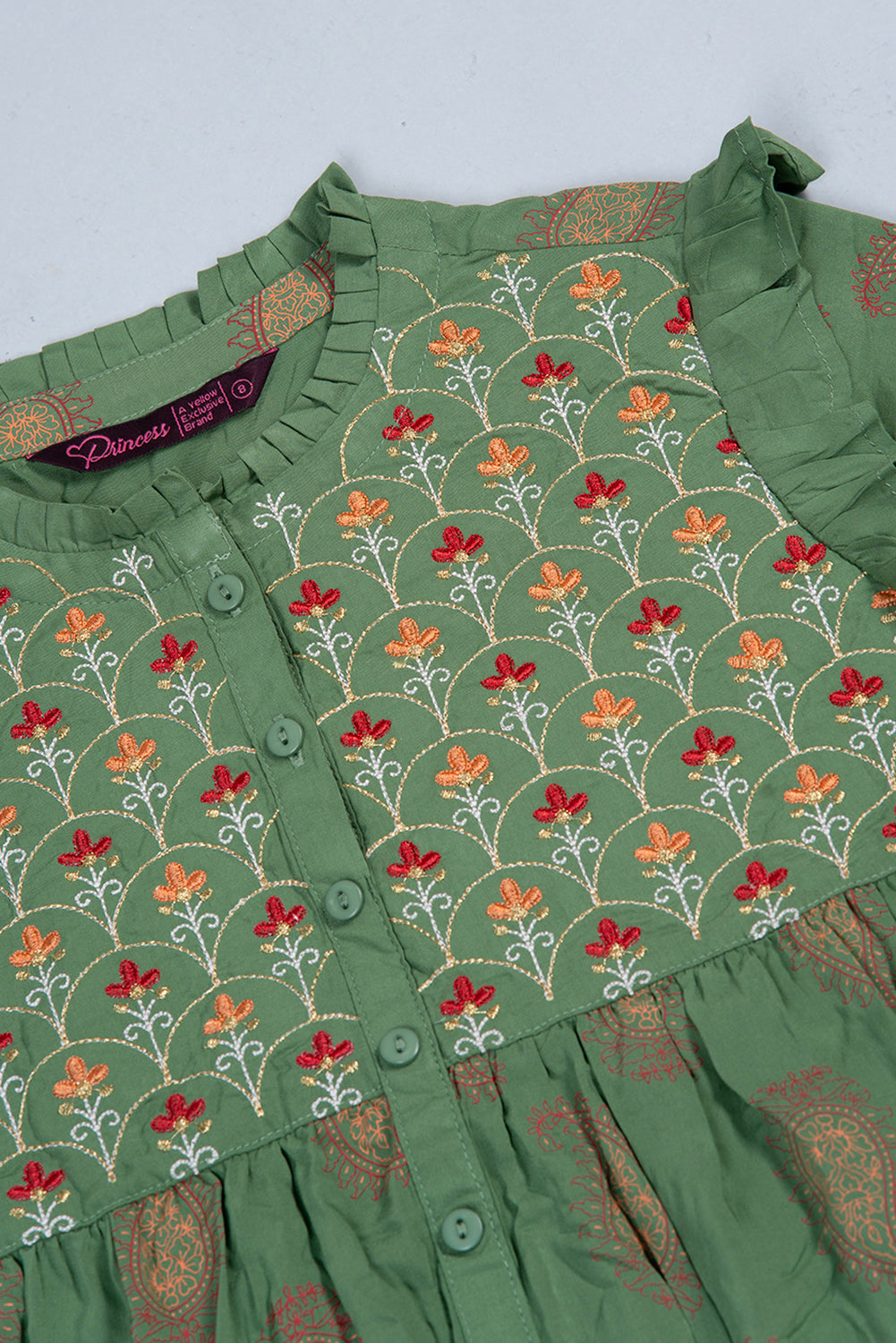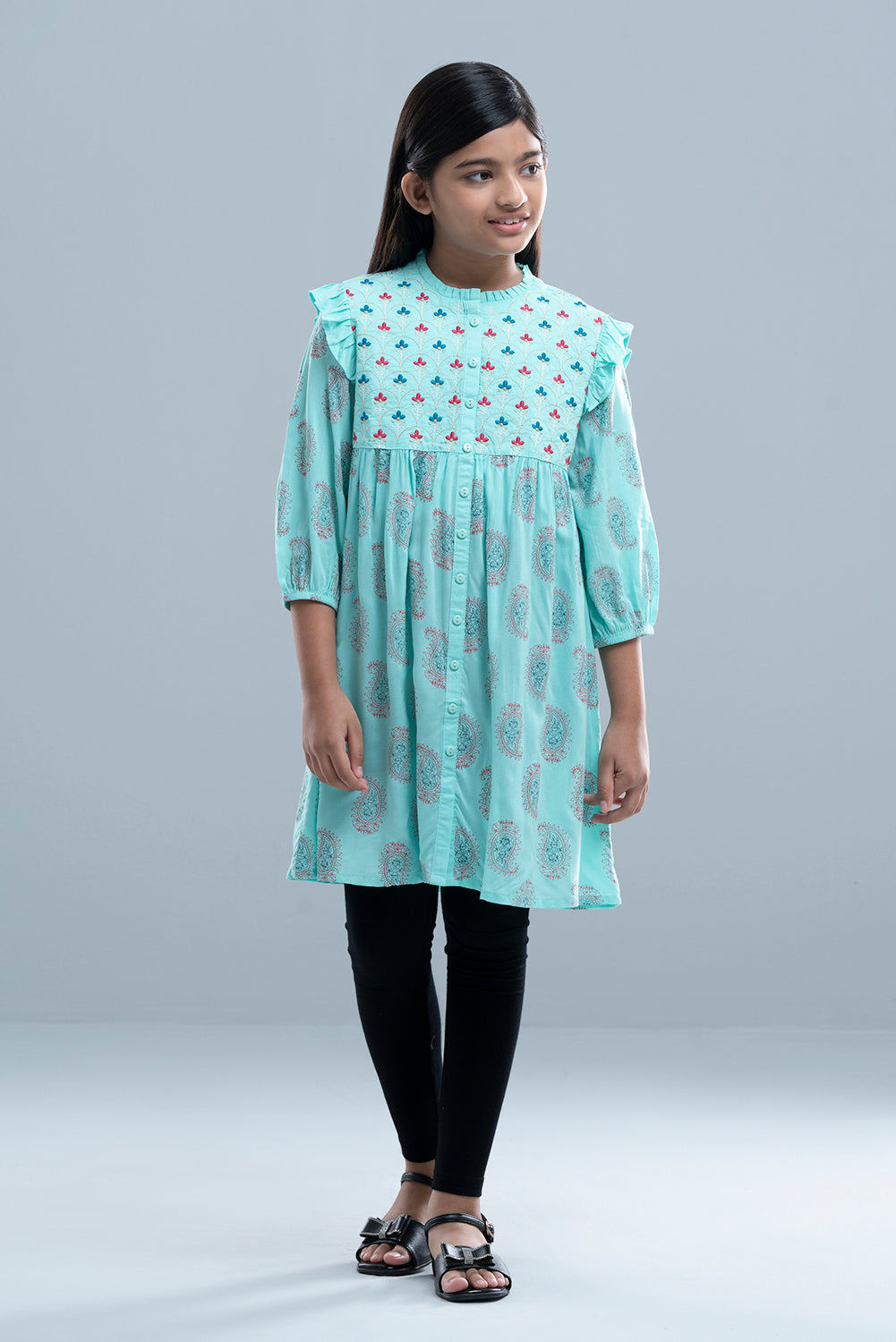 Fresh aqua blue & Avocado Green dress with delicate paisley prints and a beautifully embroidered yoke. Designed with ruffle detailing on the shoulders, button-down front, and 3/4 sleeves for a charming, easy-to-wear look.