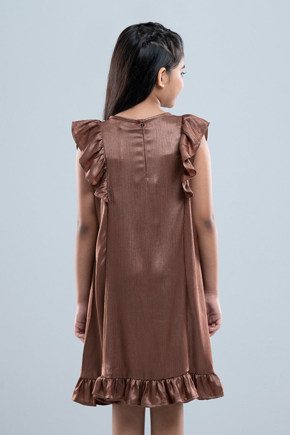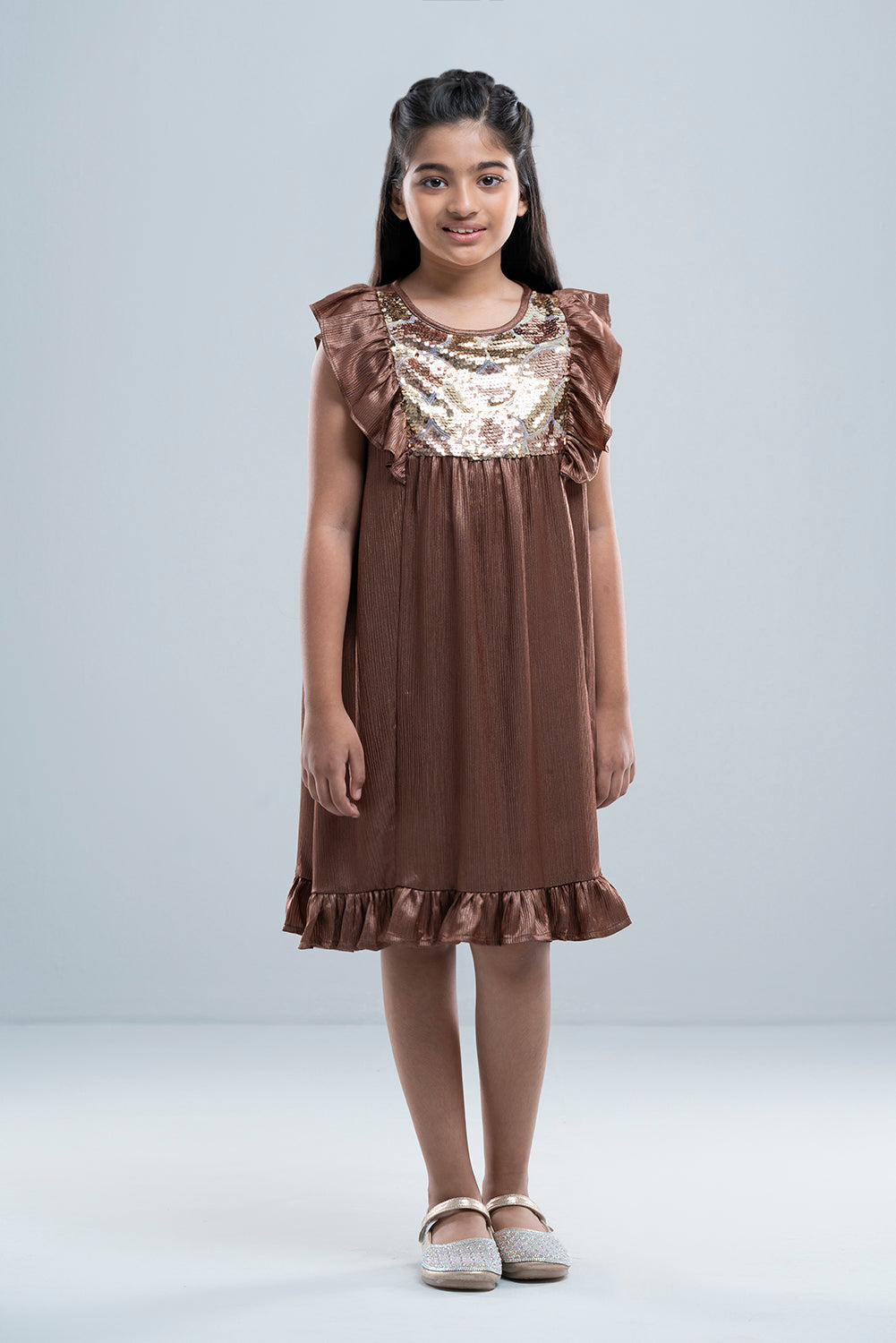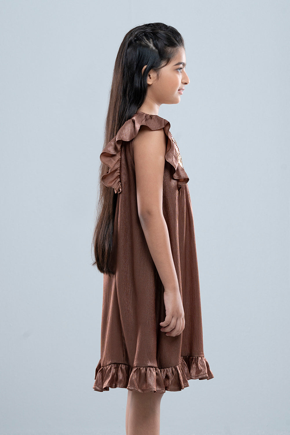 A charming brown knee-length tops featuring delicate lace detailing on the chest and frill sleeves. Made from soft, breathable fabric for all-day comfort.