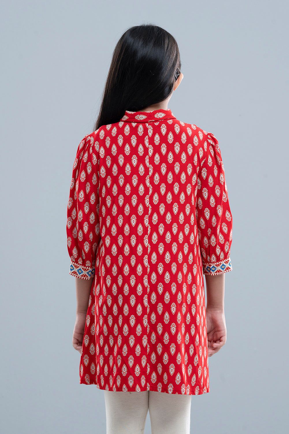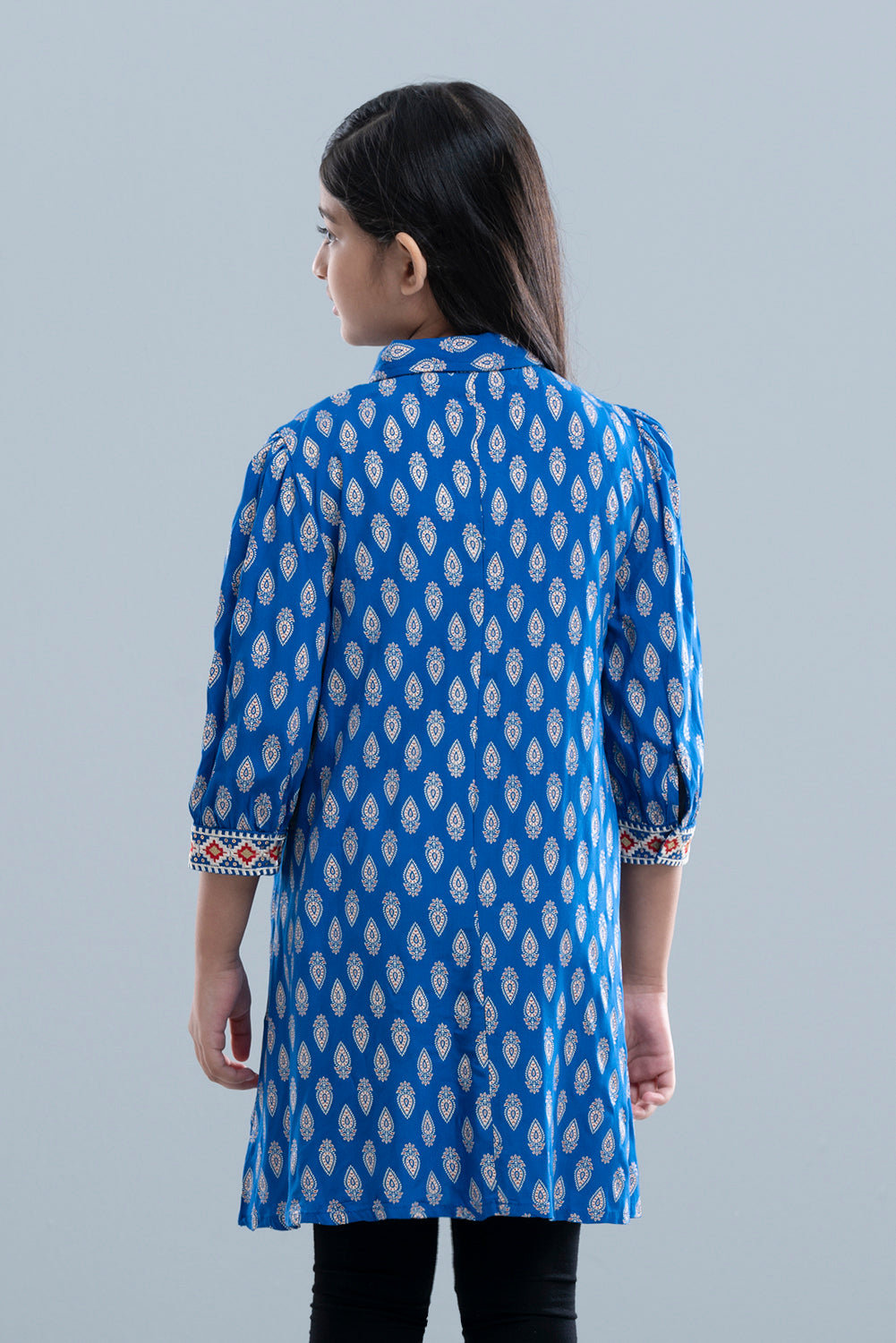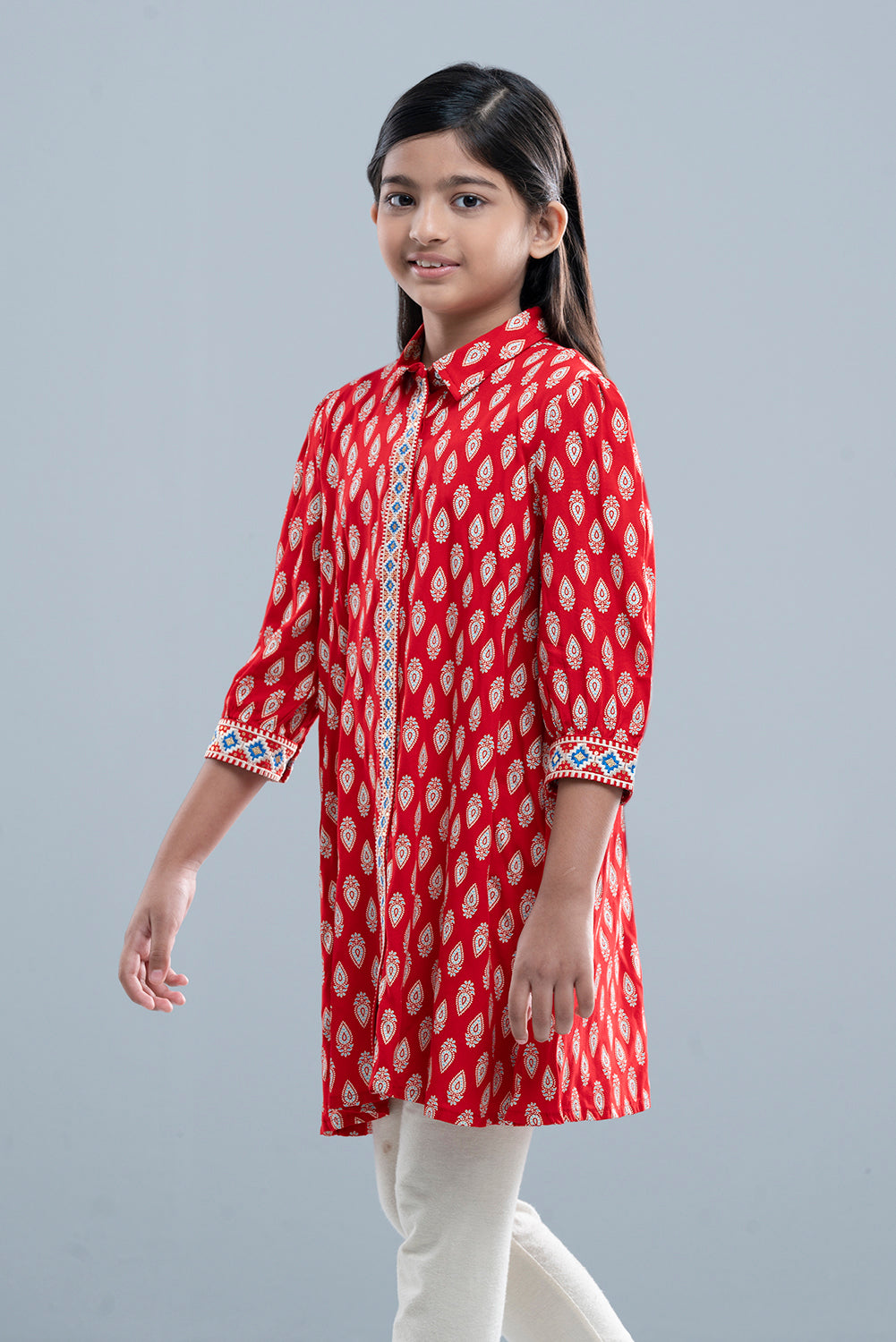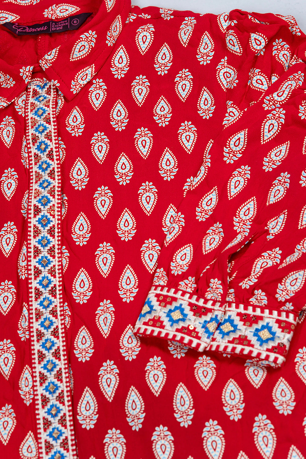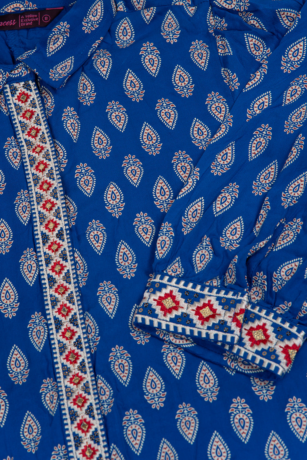 This stylish top features a classic shirt collar and all-over Ajrak motif screen print on soft viscose fabric. Embroidery on the front and cuffs adds a touch of elegance to its ethnic charm.