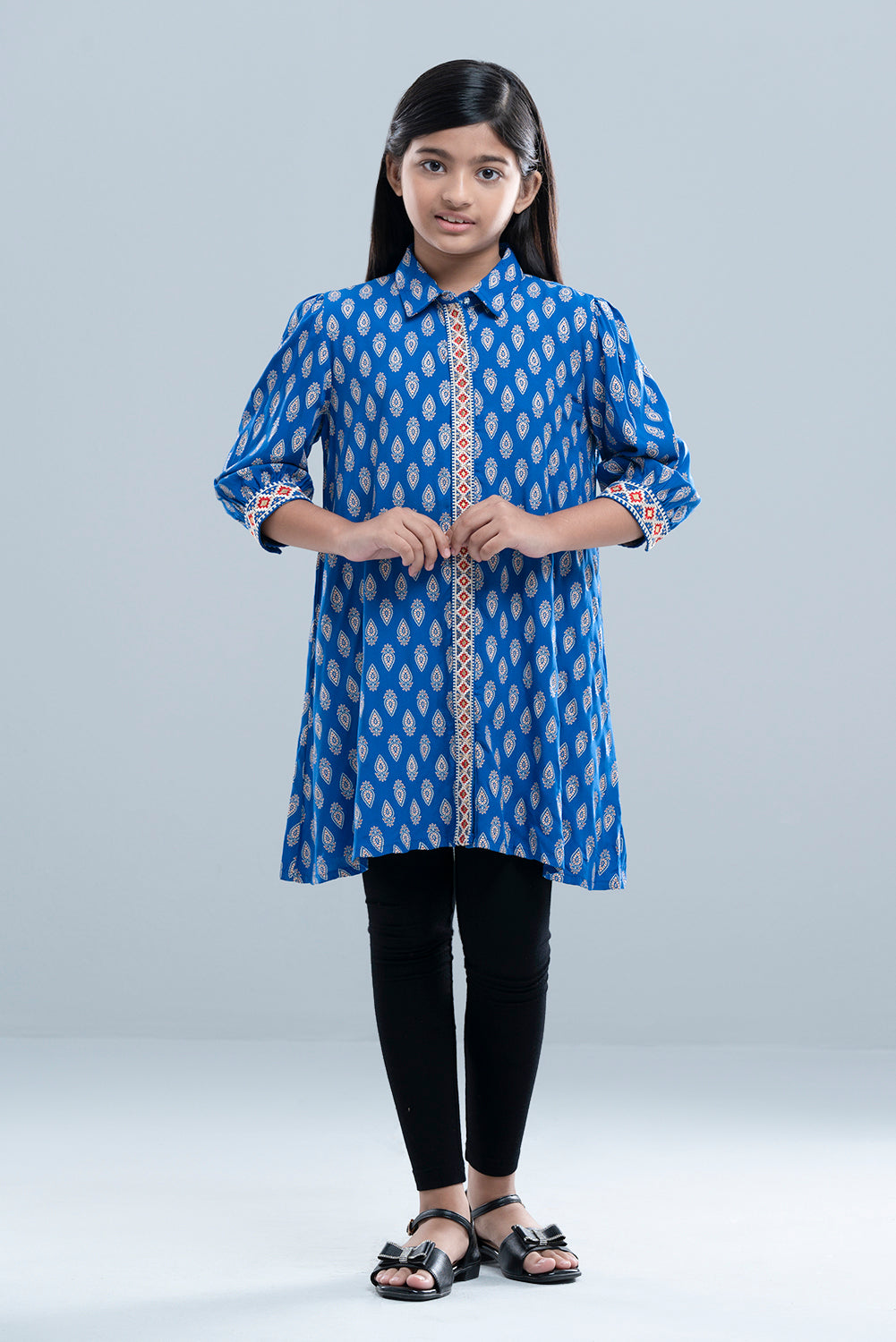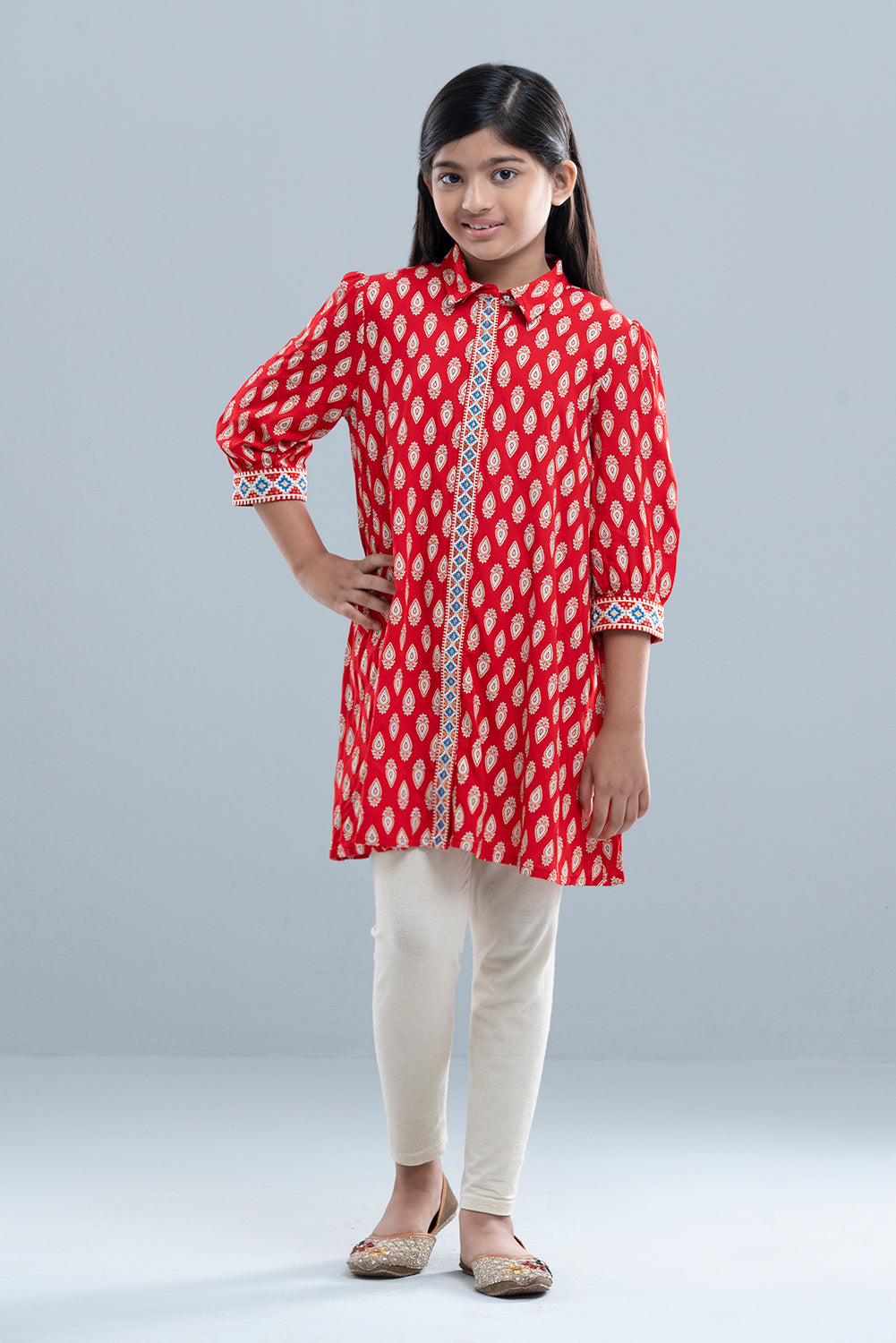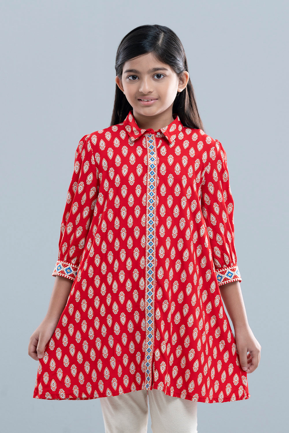This stylish top features a classic shirt collar and all-over Ajrak motif screen print on soft viscose fabric. Embroidery on the front and cuffs adds a touch of elegance to its ethnic charm.
