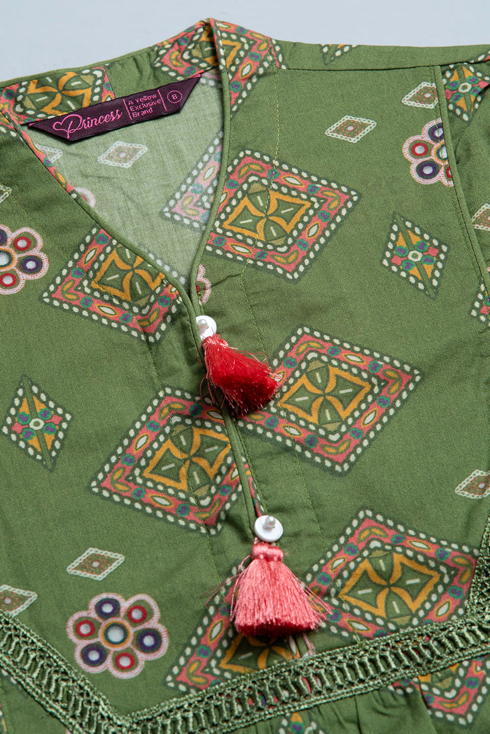 Allover digital printed cotton frock with a DTM lace and to make it more elegant using a contrast tassel.