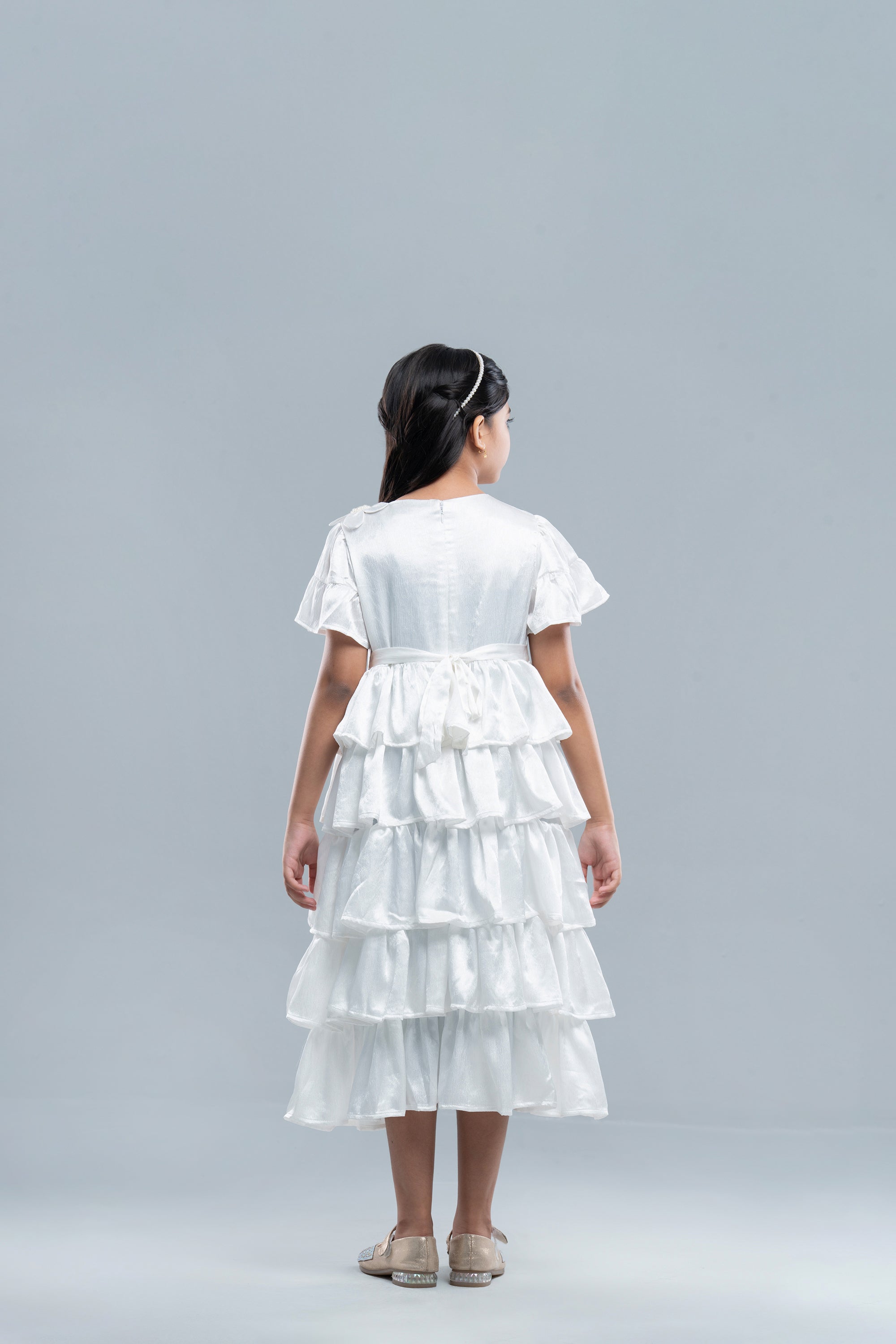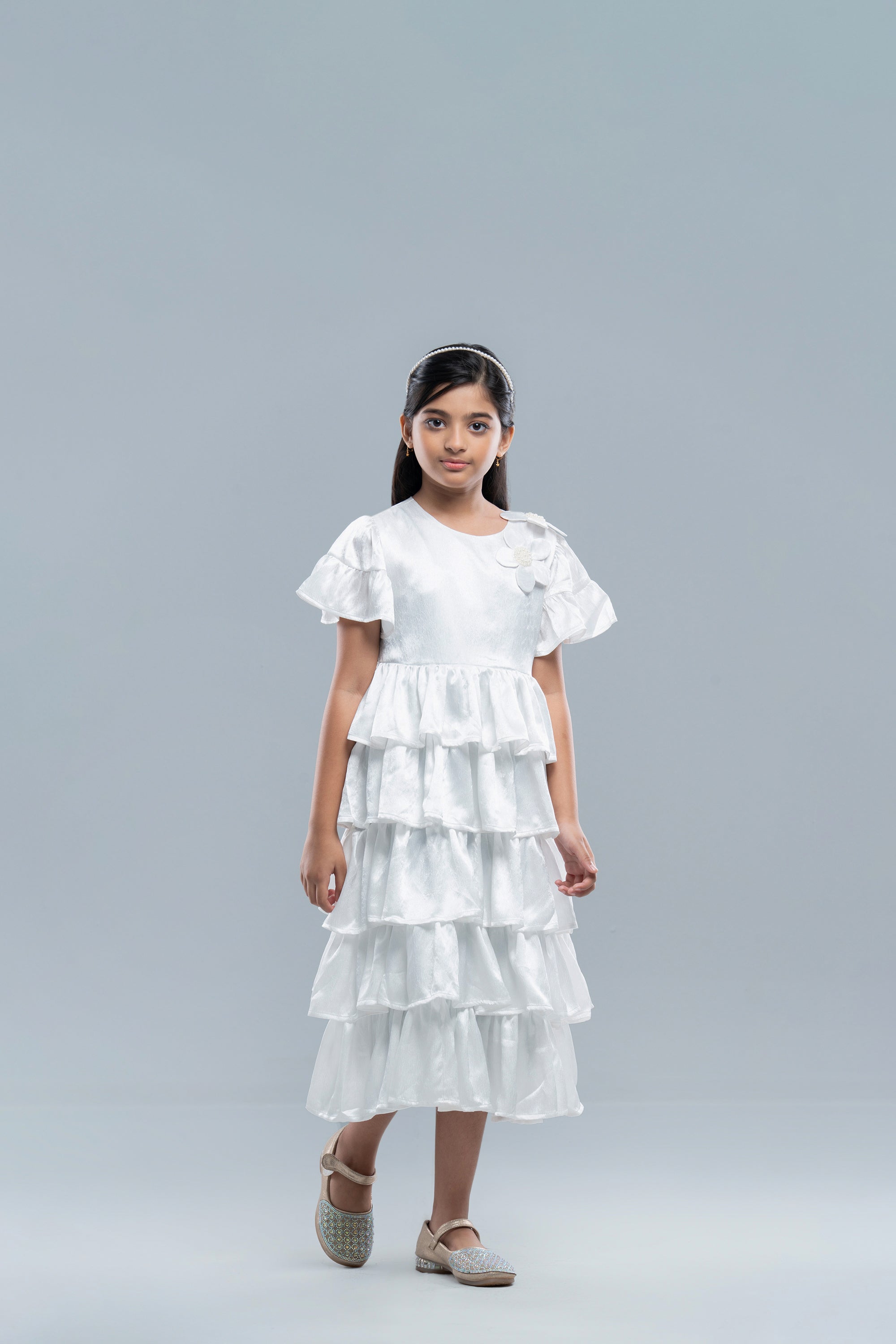 Princess dress with polyester crepe silk fabric and lining with cotton fabric. Layred bottom with gather,1/2 length sleeve, back zip closure, side belt. Front top part with placement handmade flower. Very attractive and trendy for kids girls.
