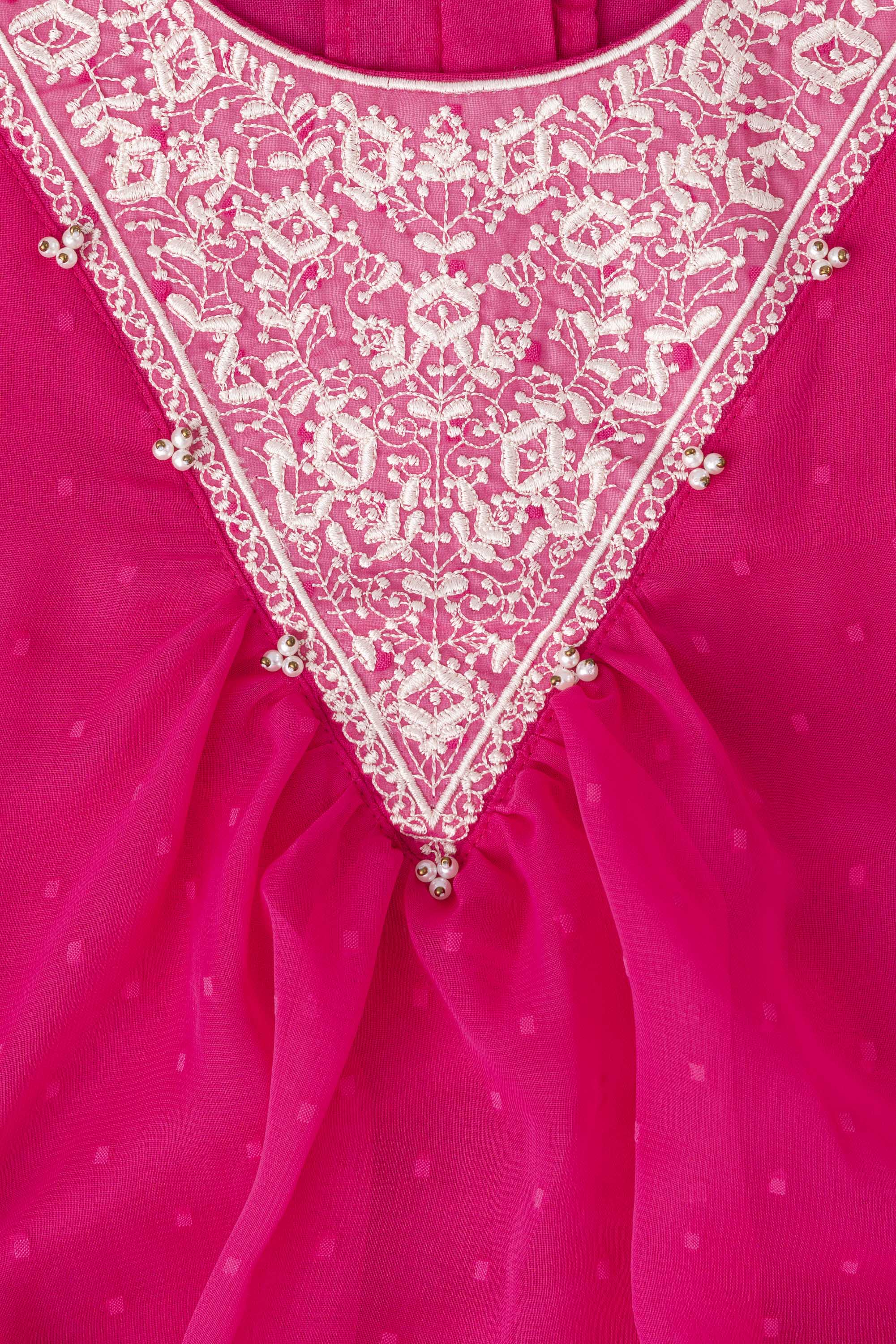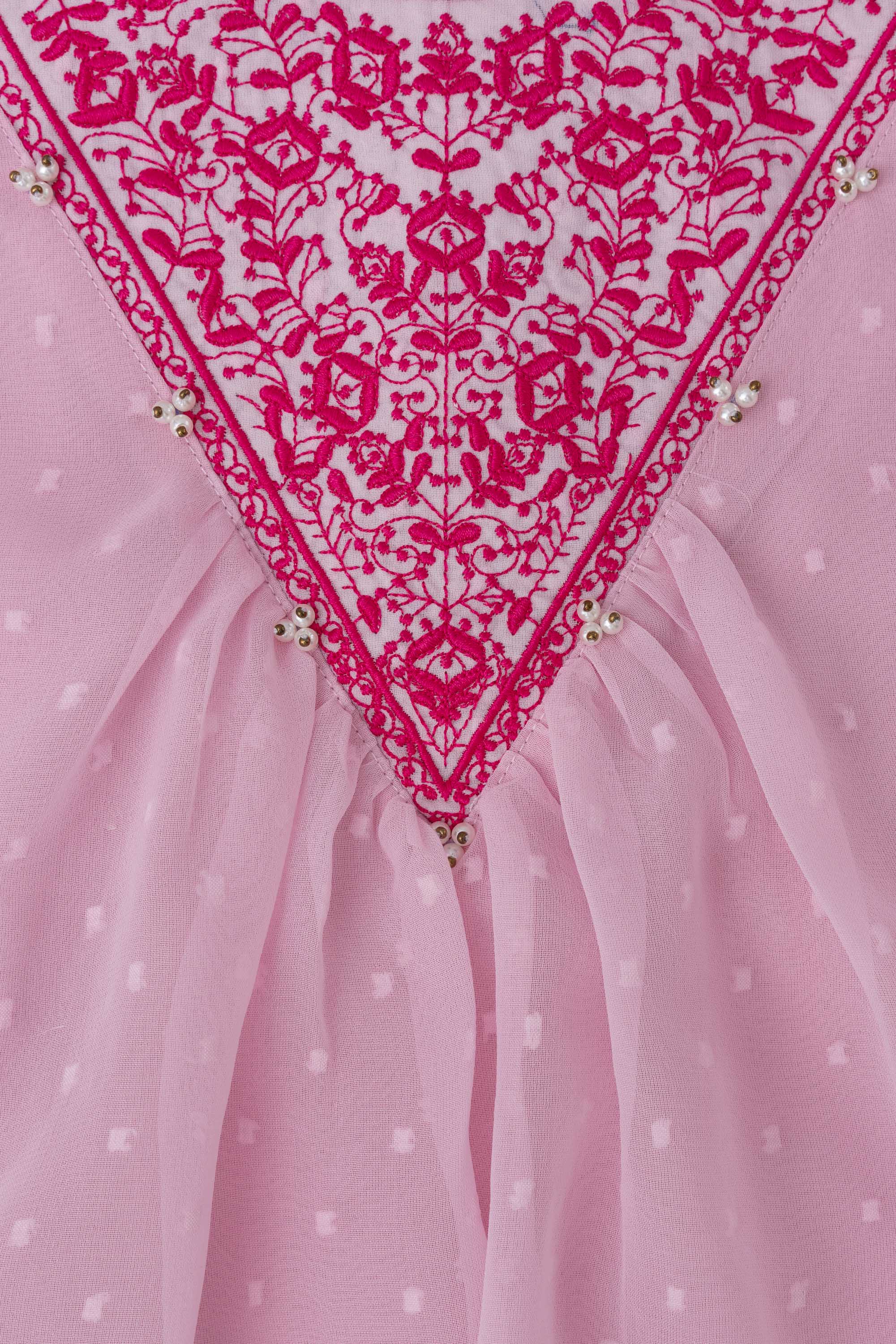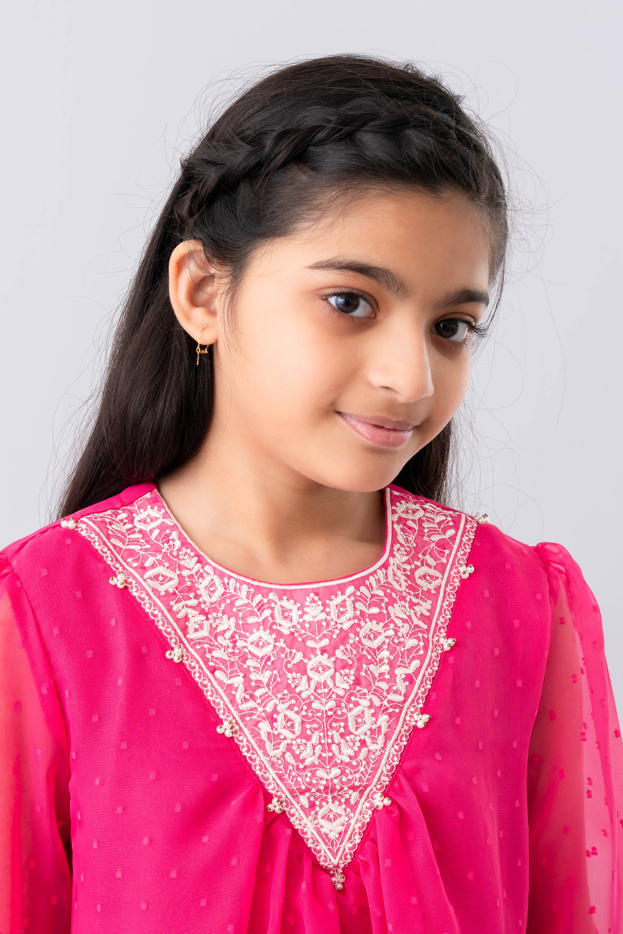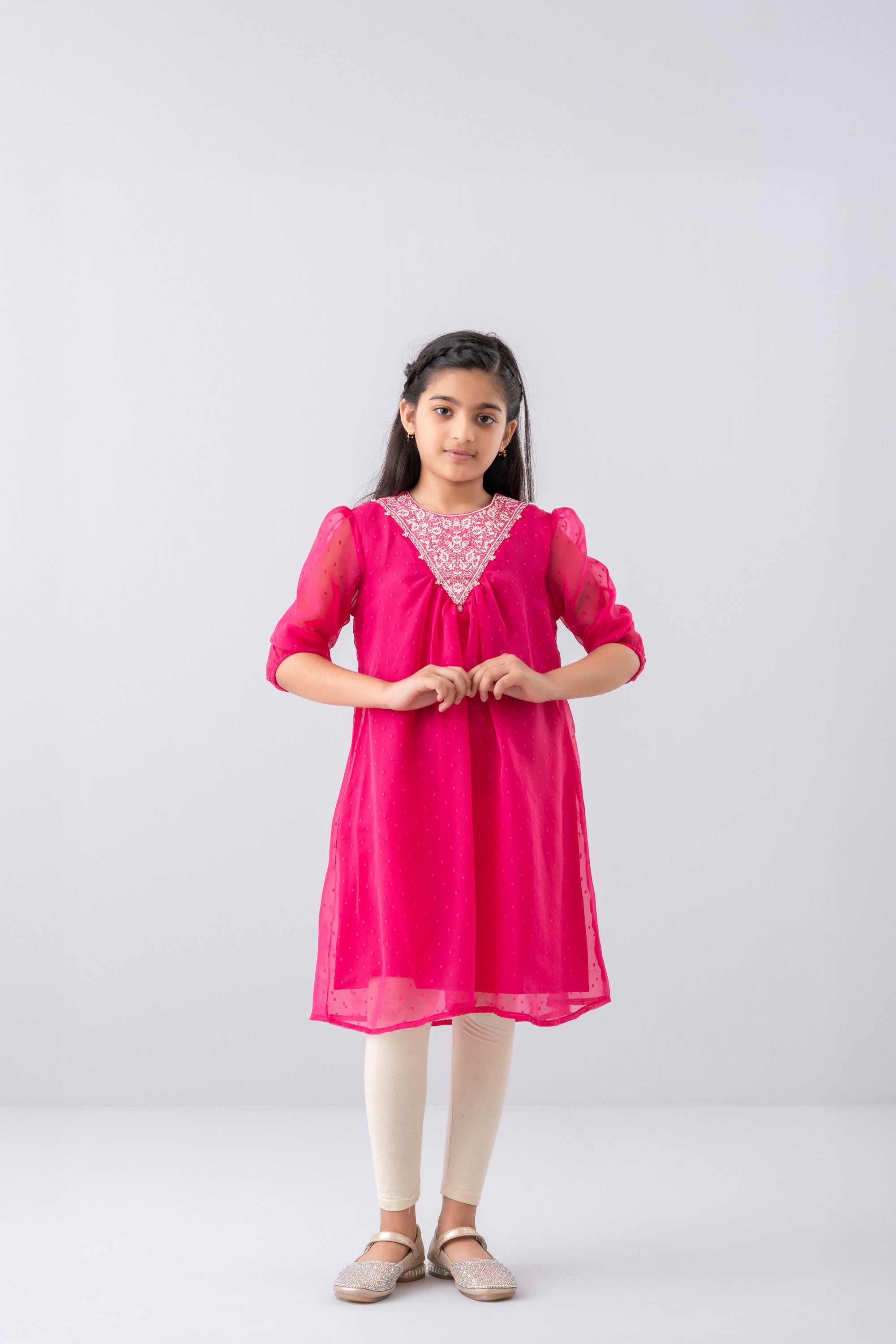 A line fit Georgette fabric frock with Embroidery yoke and beads detailing.