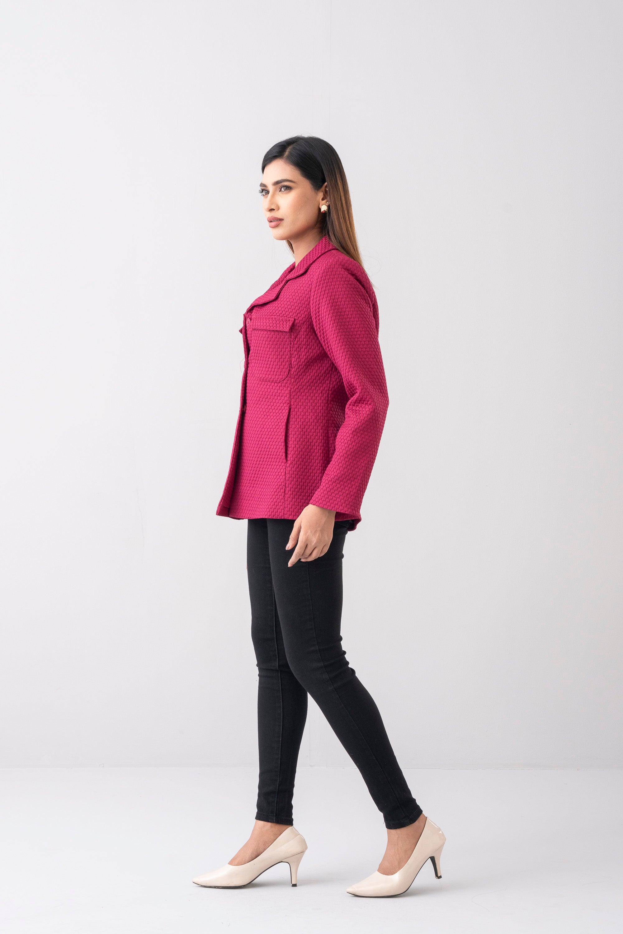 The Women’s Popcorn Texture Blazer features a refined notch collar and a structured body for a polished silhouette. Designed with double flap patch pockets and finished with elegant chalk button details, this piece blends modern texture with timeless tailoring.