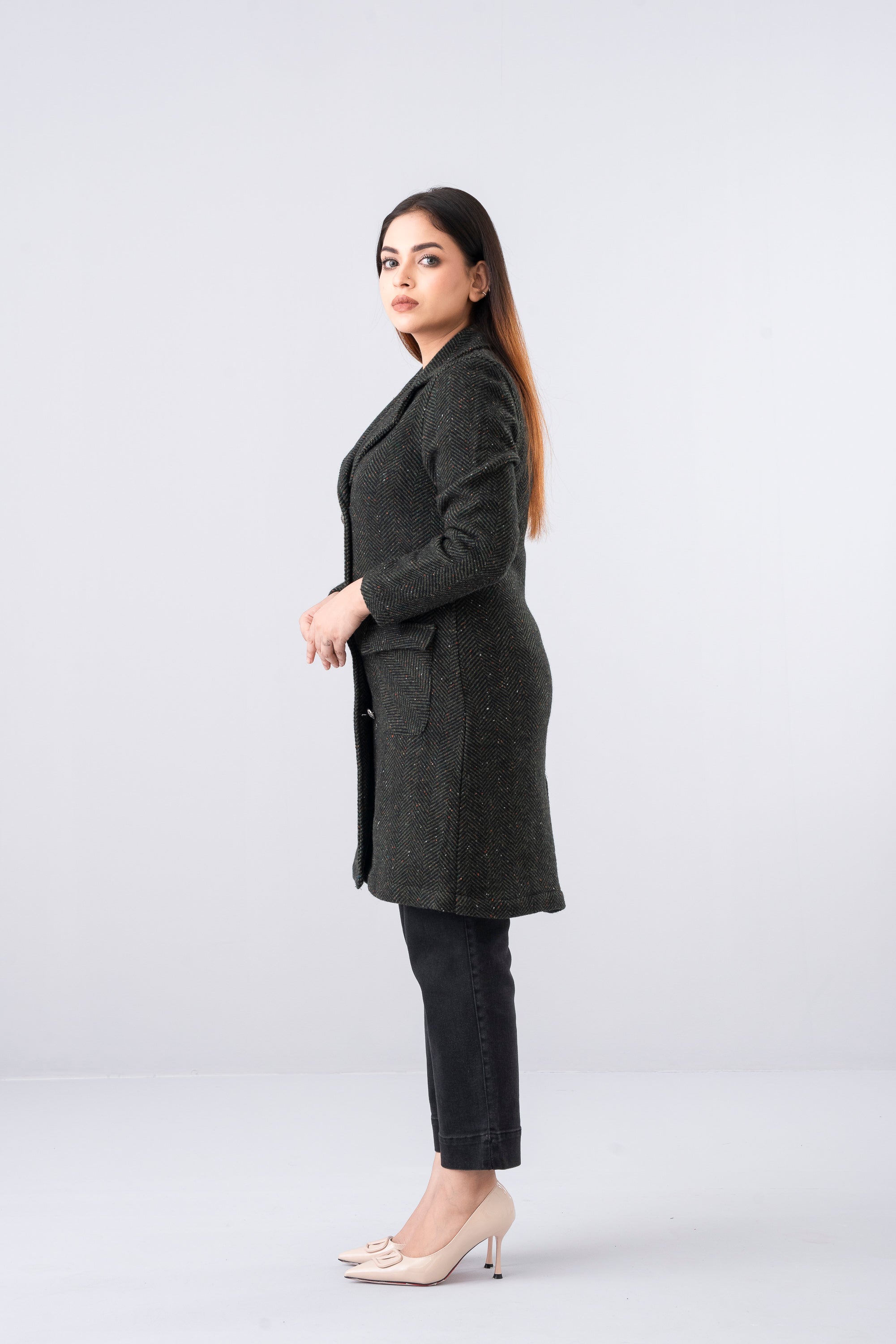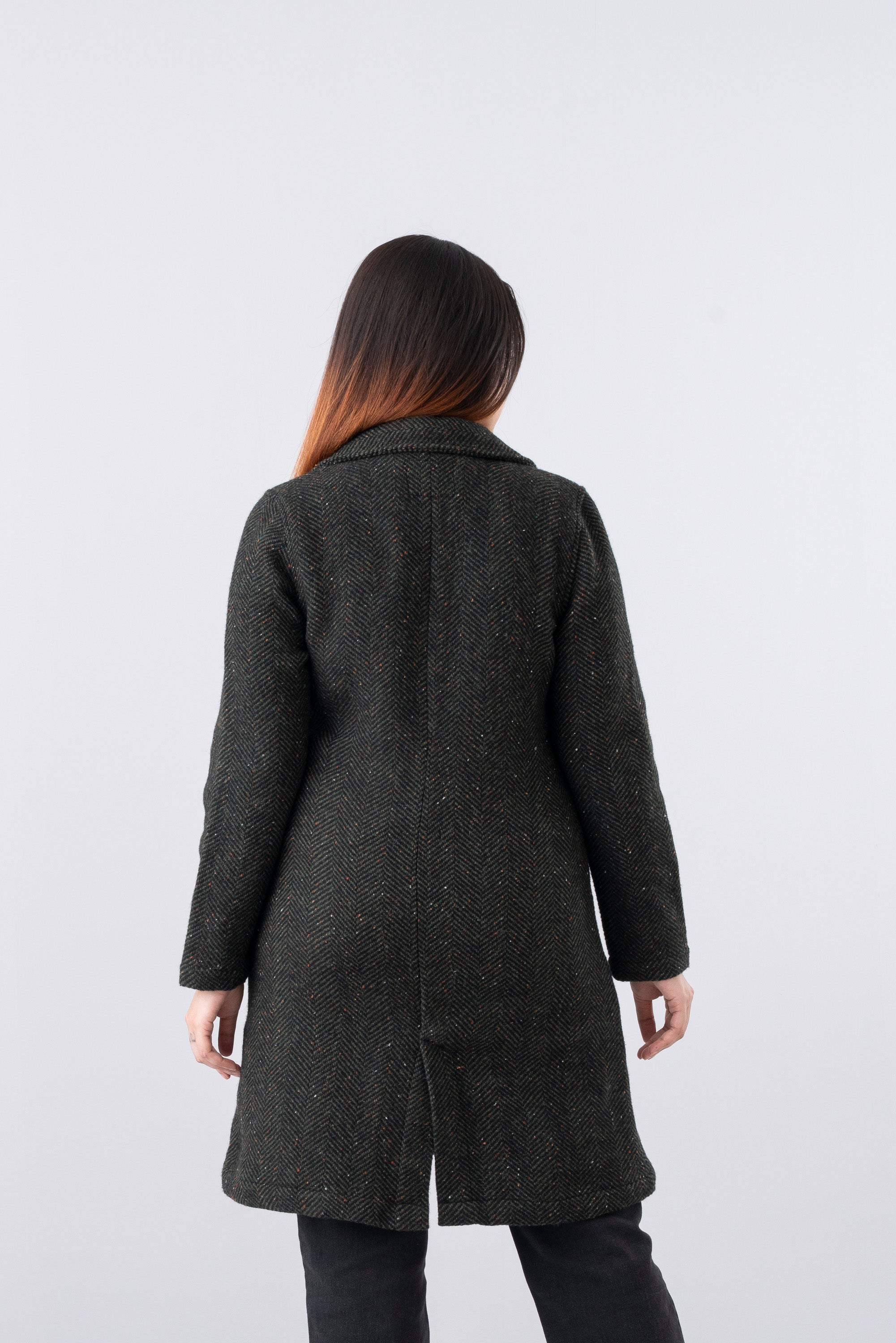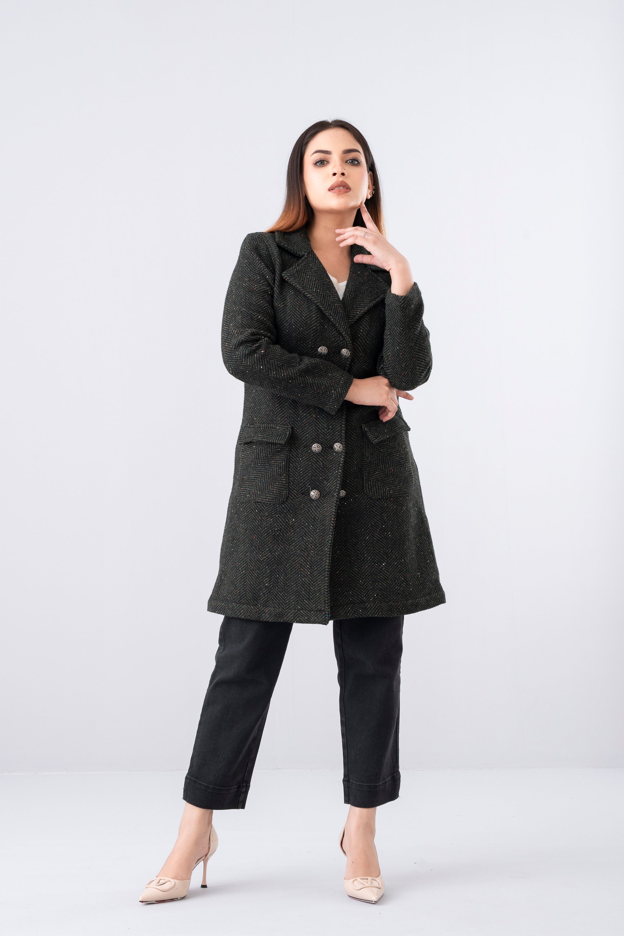 This women’s double-breasted trench coat offers a timeless and elegant look with its notch lapel and regular fit silhouette. Crafted from premium brushed herringbone textured fabric, it provides a soft hand feel and refined surface detail. The design features functional flap patch pockets, a structured mid-length shape, and metal dome button fastening that adds a sophisticated, modern touch perfect for layering in cooler seasons.