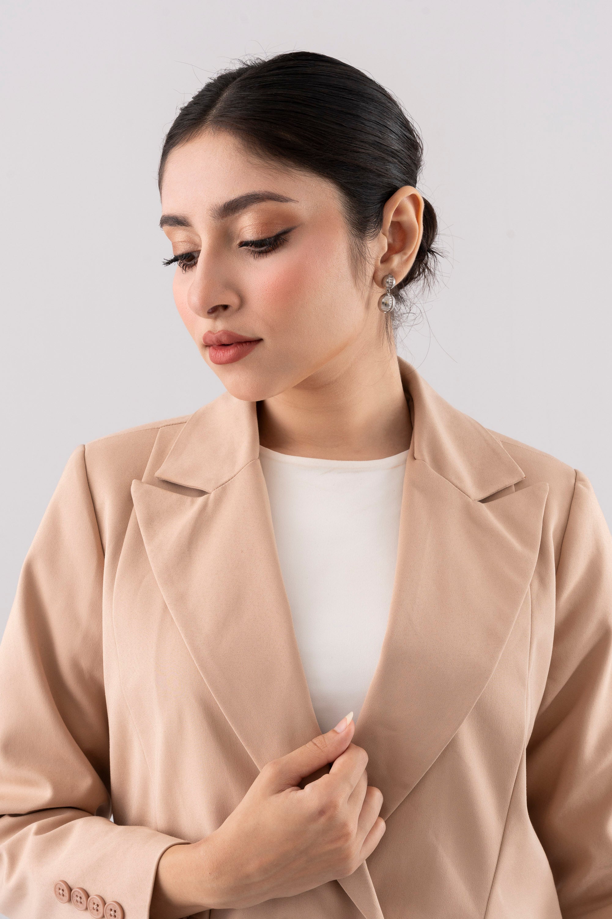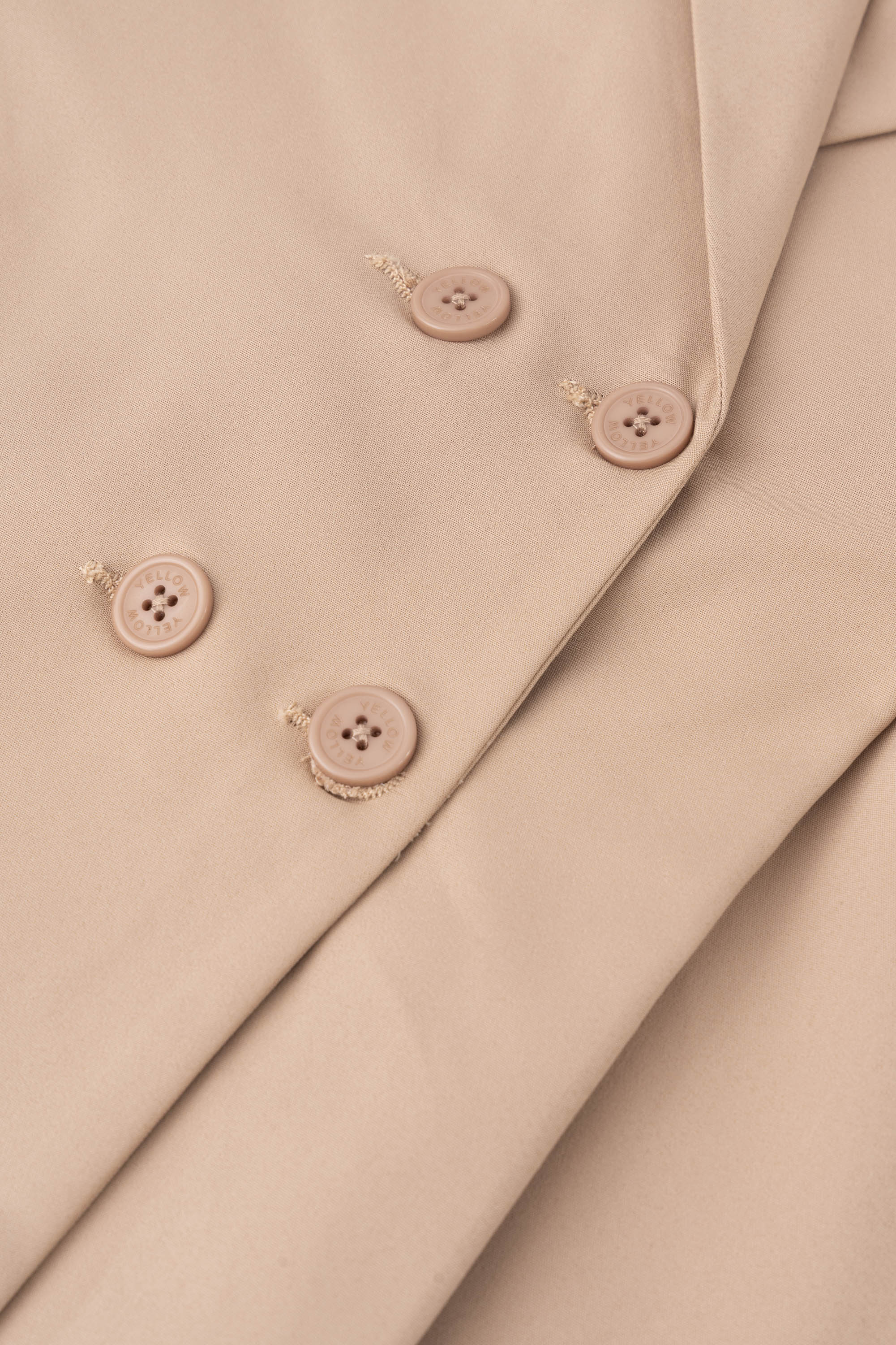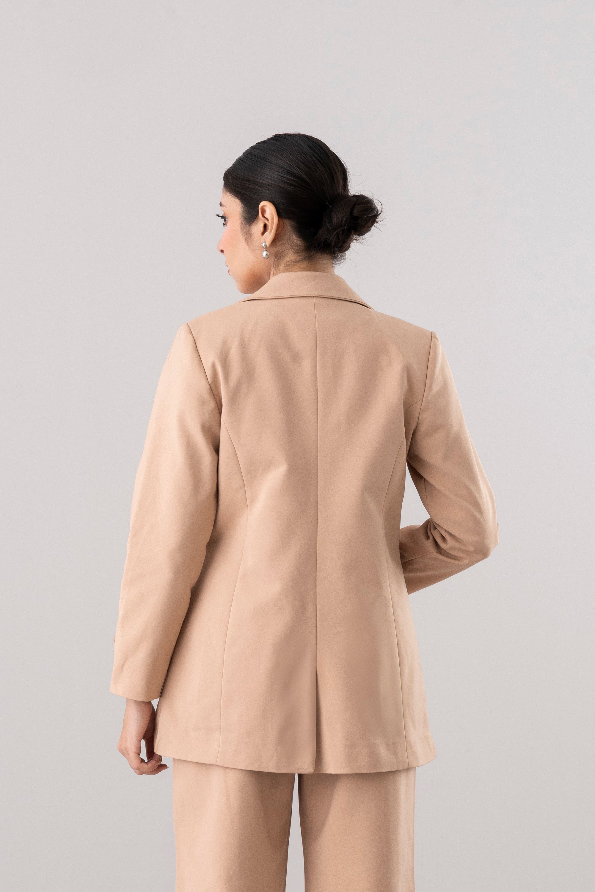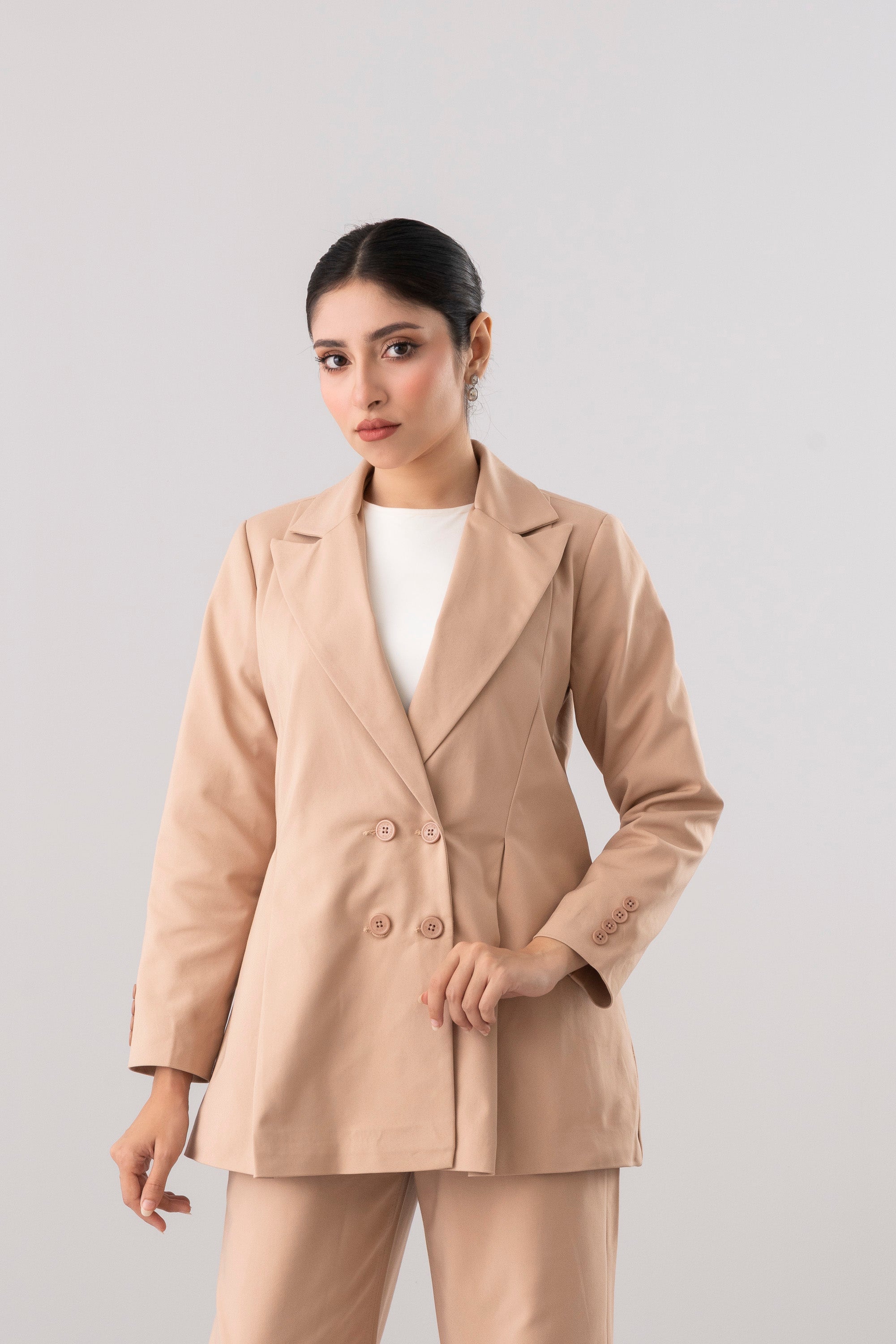 Women’s double-breasted blazer features a sharp peak lapel and a flattering dart at the waist for a structured yet feminine silhouette. Crafted from fine yarn with a soft hand feel, it combines elegance and comfort, making it a timeless addition to any wardrobe.