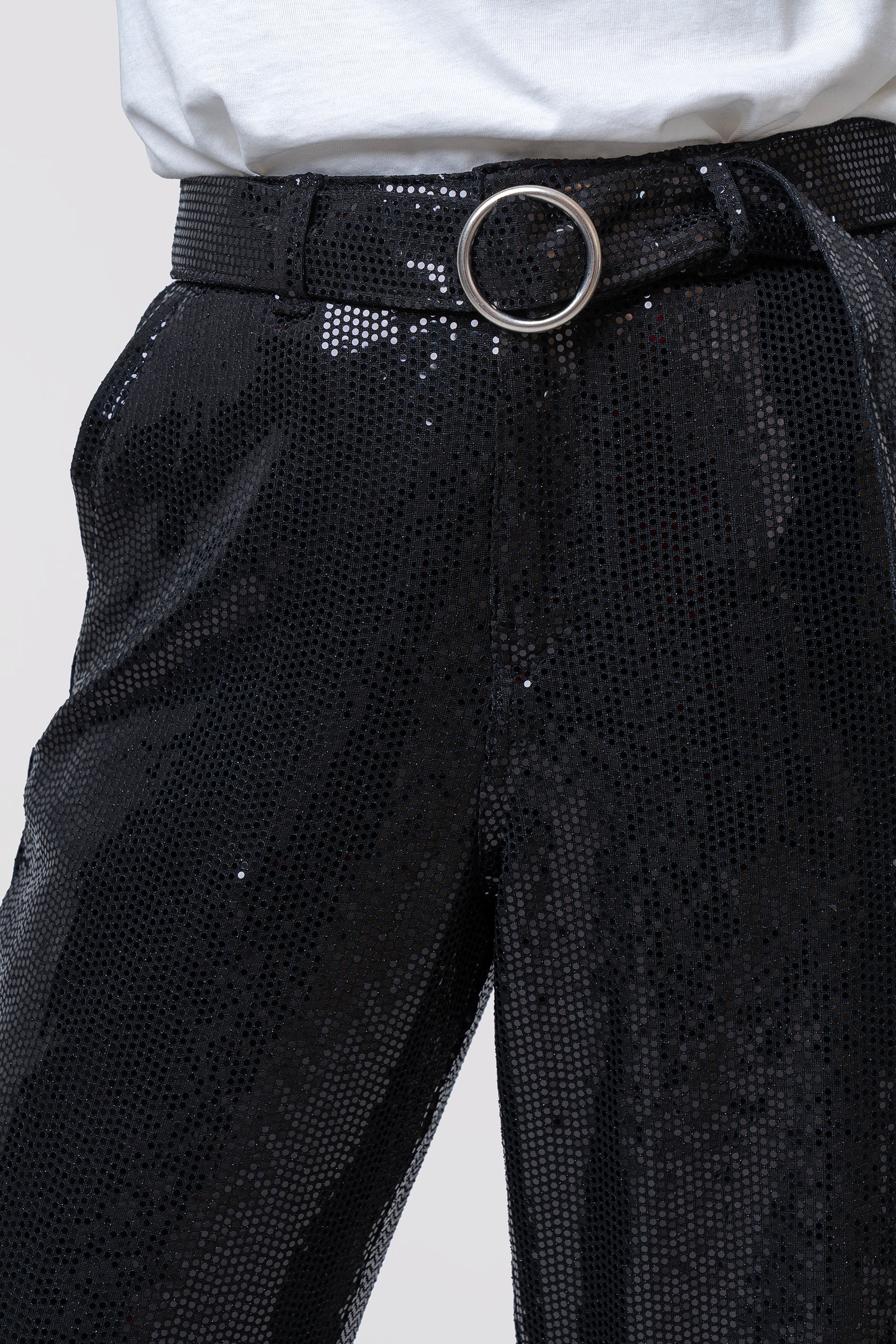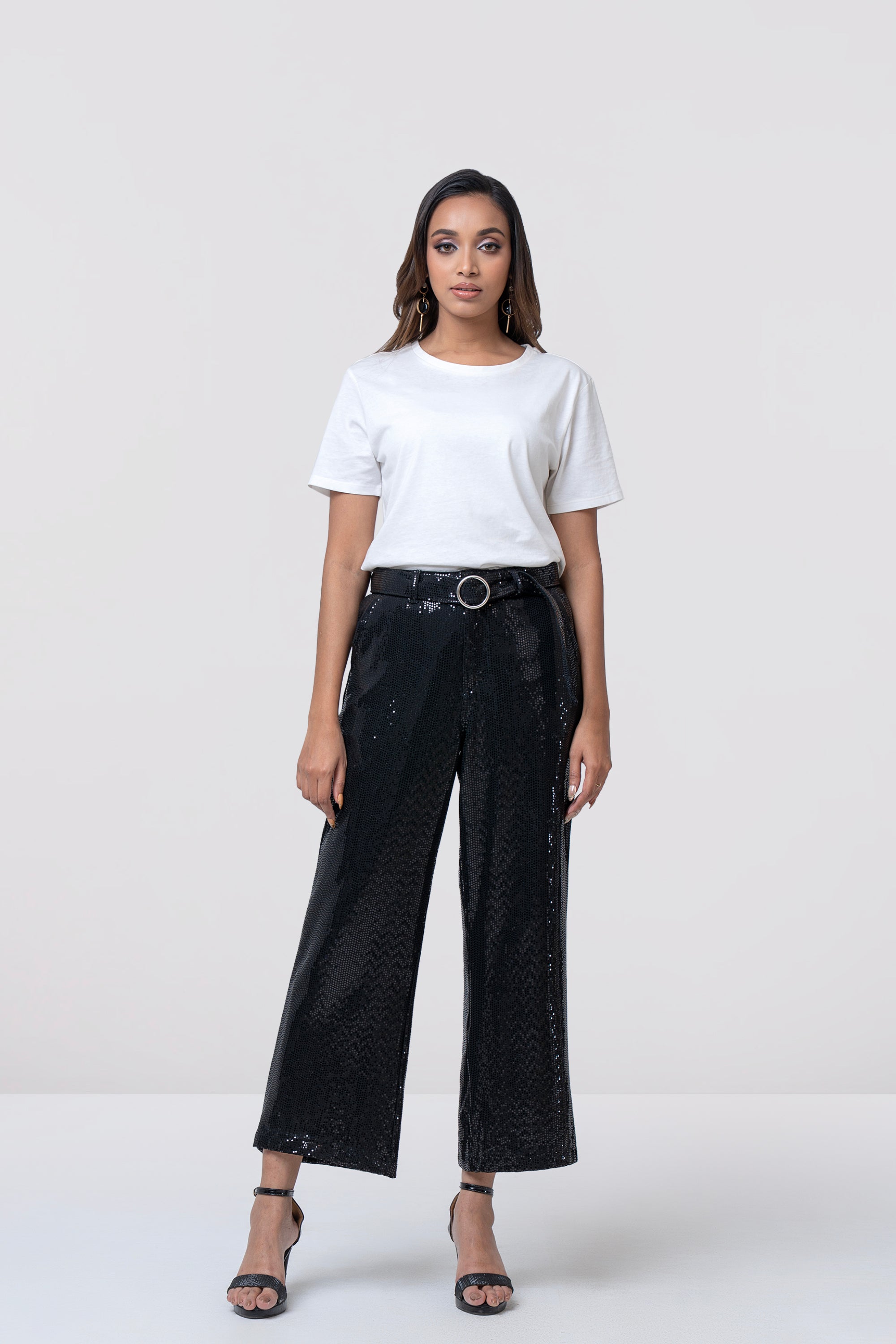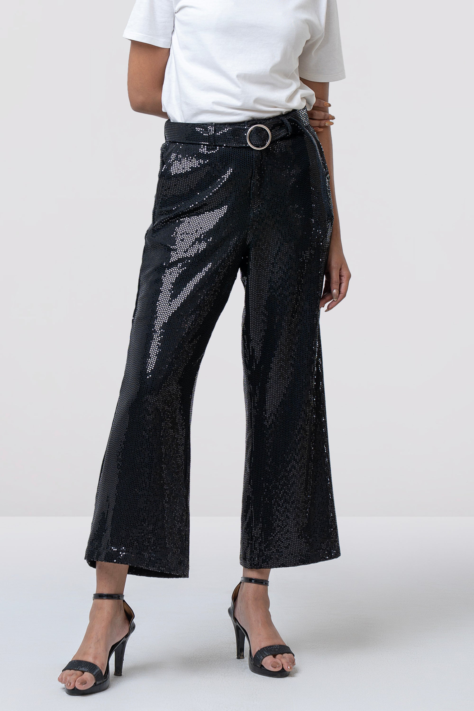 Make a bold style statement with this women’s pant crafted from shine sequin fabric for a touch of modern glamour. Designed to reflect light beautifully, the fabric adds a subtle yet eye-catching sparkle. Featuring a flattering mid-rise waist with a stylish belt and round buckle, along with button and zip closure, it offers a secure and comfortable fit.