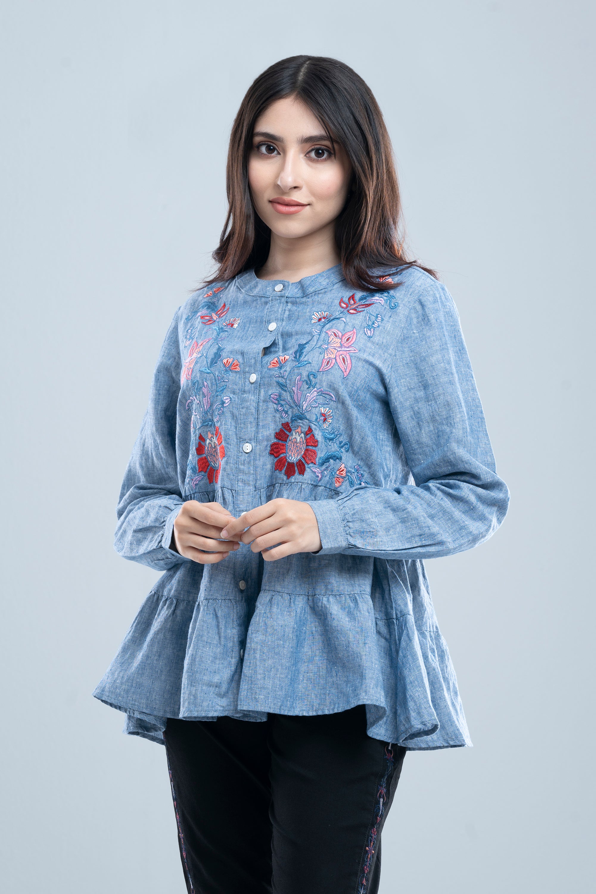 Gracefully crafted in soft Remi cotton, this women’s slim-fit shirt blends effortless style with timeless elegance. Featuring delicate floral embroidery, a refined band collar, and a clean button-down placket, it offers a polished yet smart silhouette. Full sleeves with gentle gathers and cuffs add subtle volume, while the double-layered hem with soft gathers enhances movement and femininity. Perfect for casual days with a touch of sophistication.