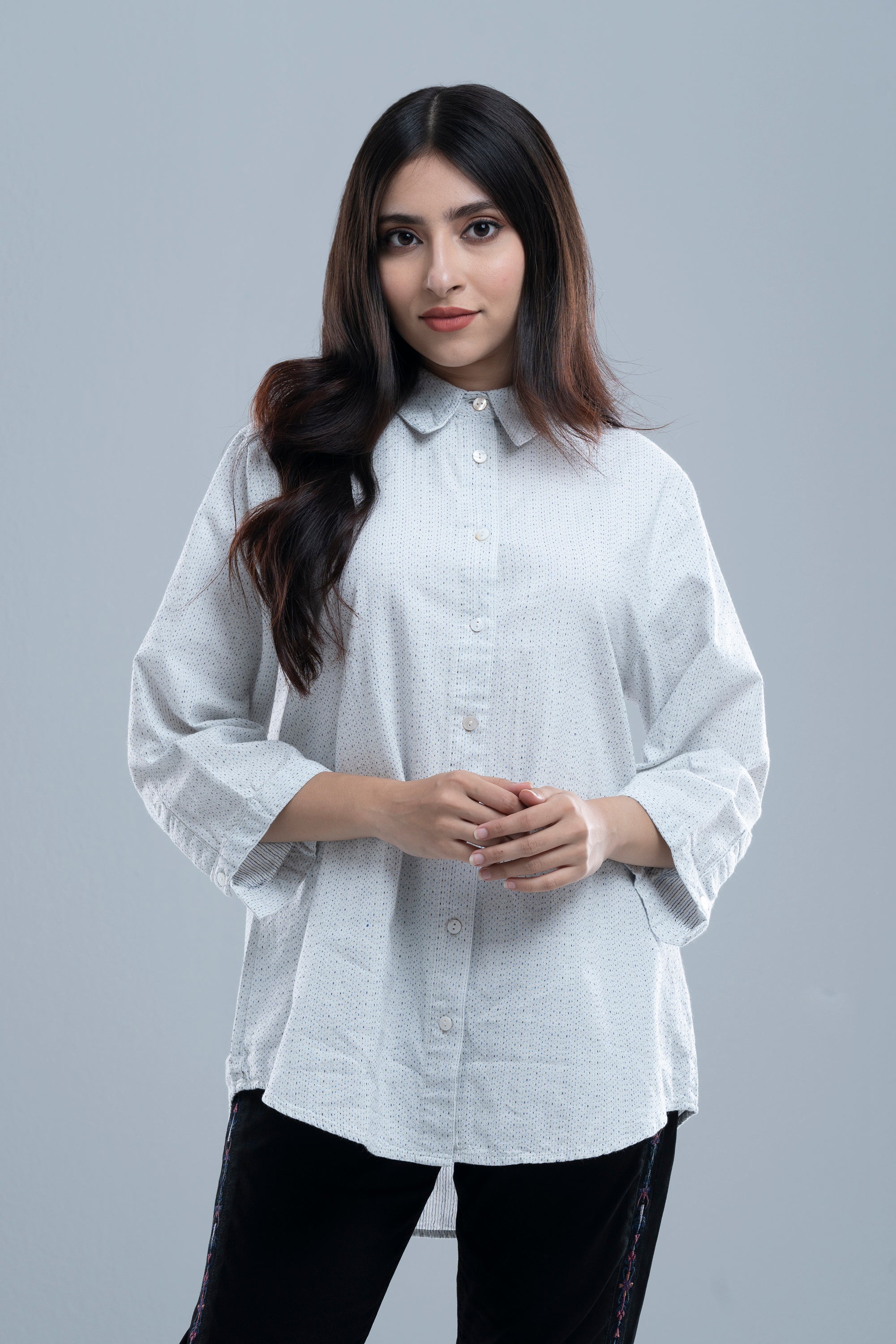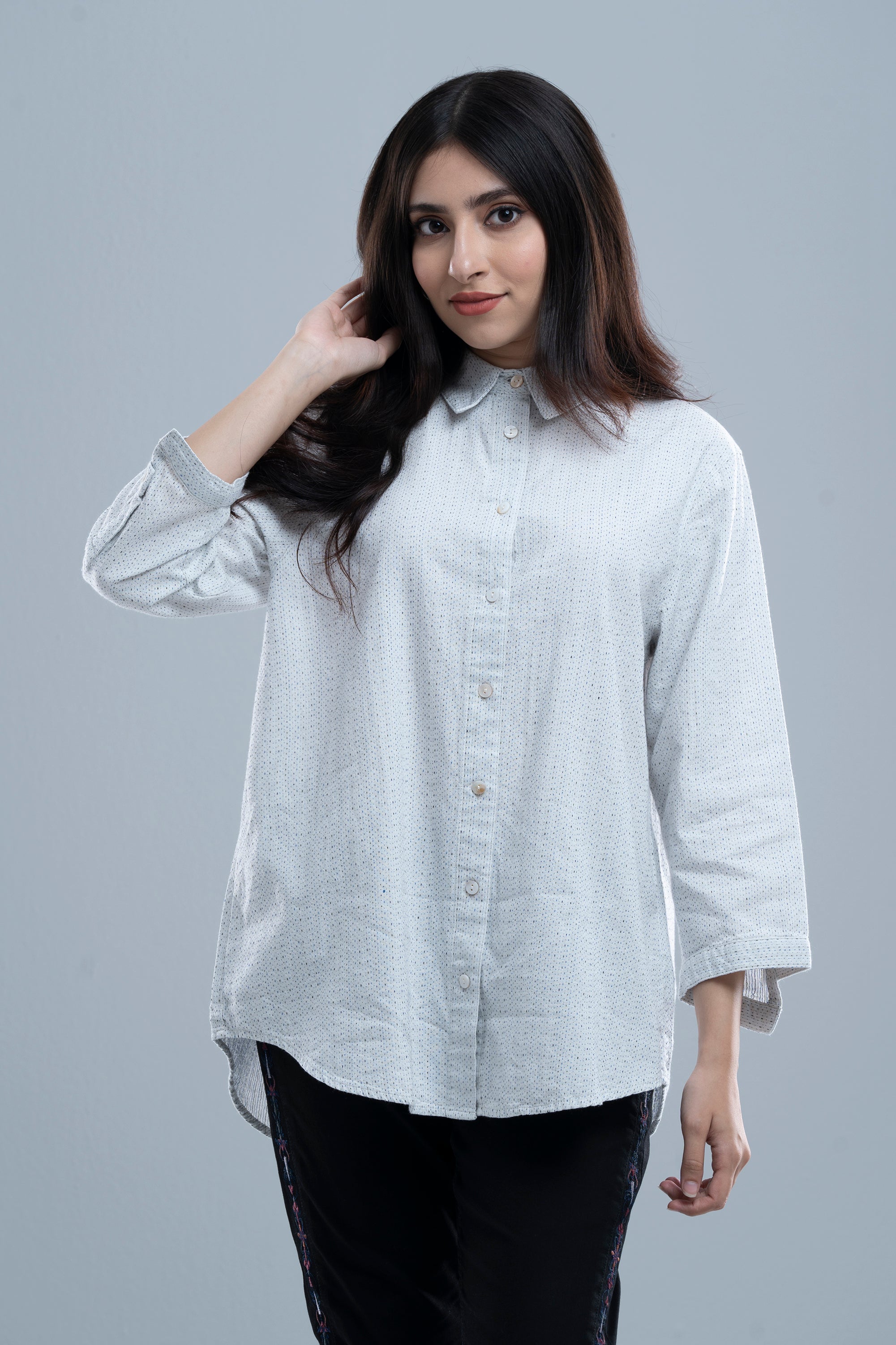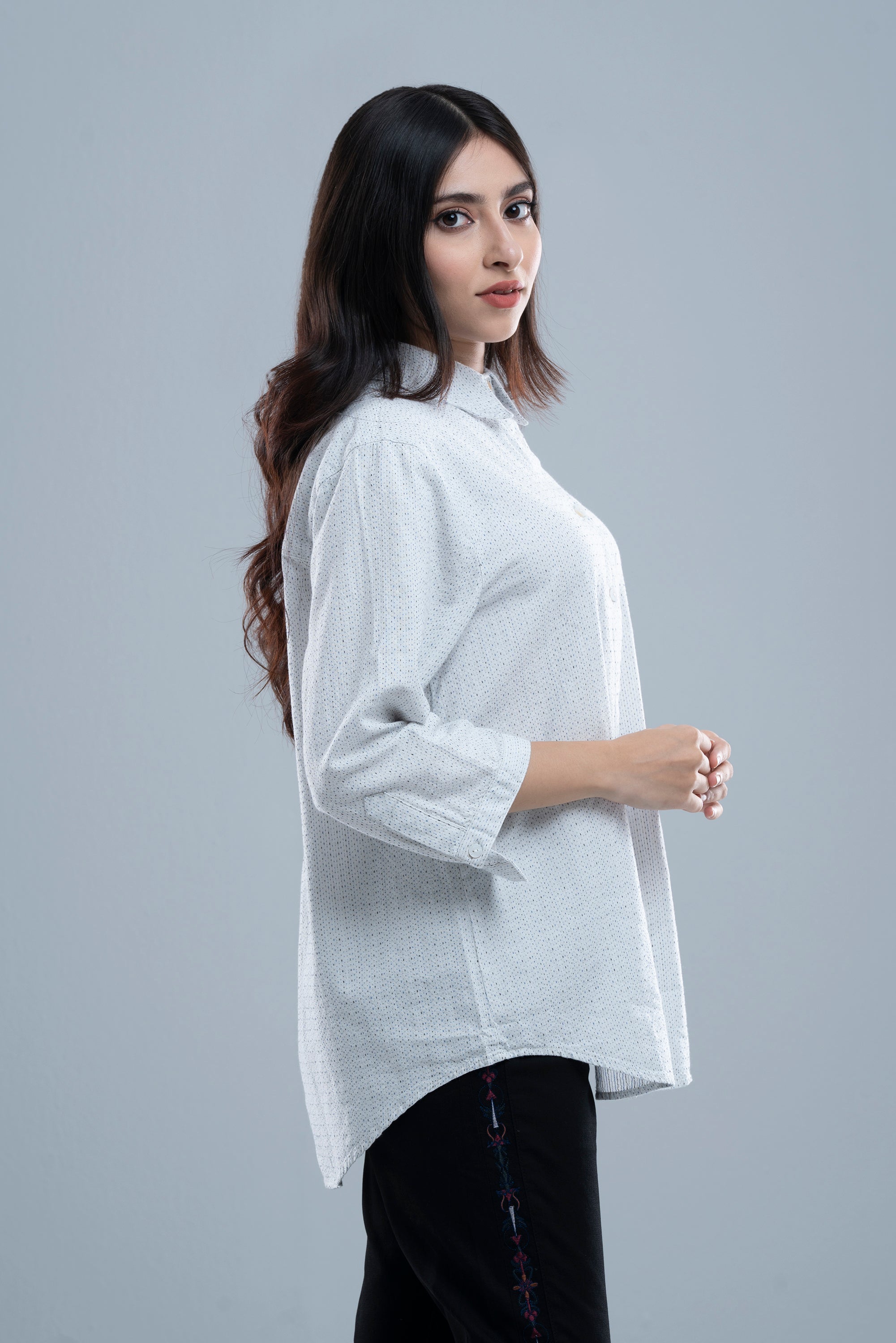 Women’s casual shirt with placement print, crafted from soft remi-cotton fabric. Designed with an extended collar, half placket featuring shell buttons, drop shoulder, and a rounded hem for a relaxed yet stylish appeal.